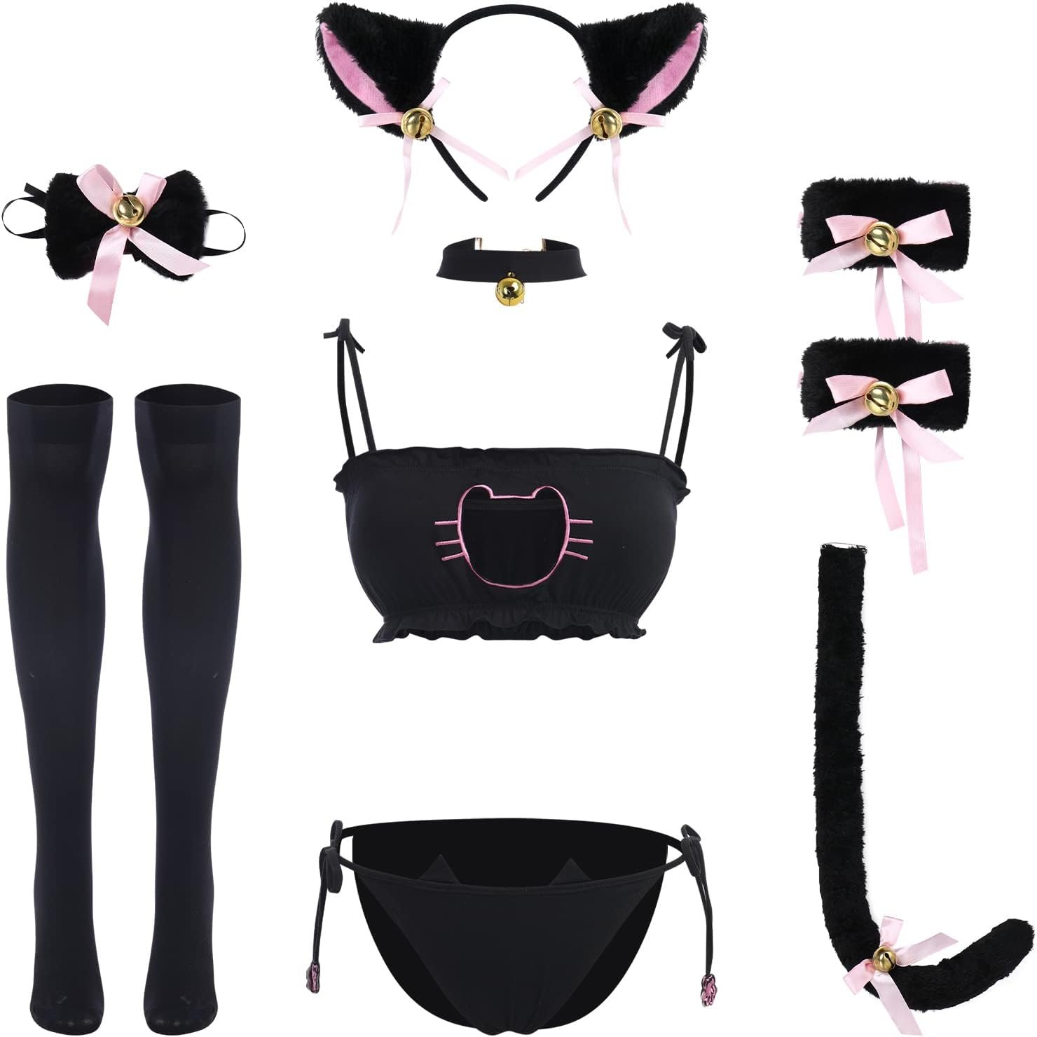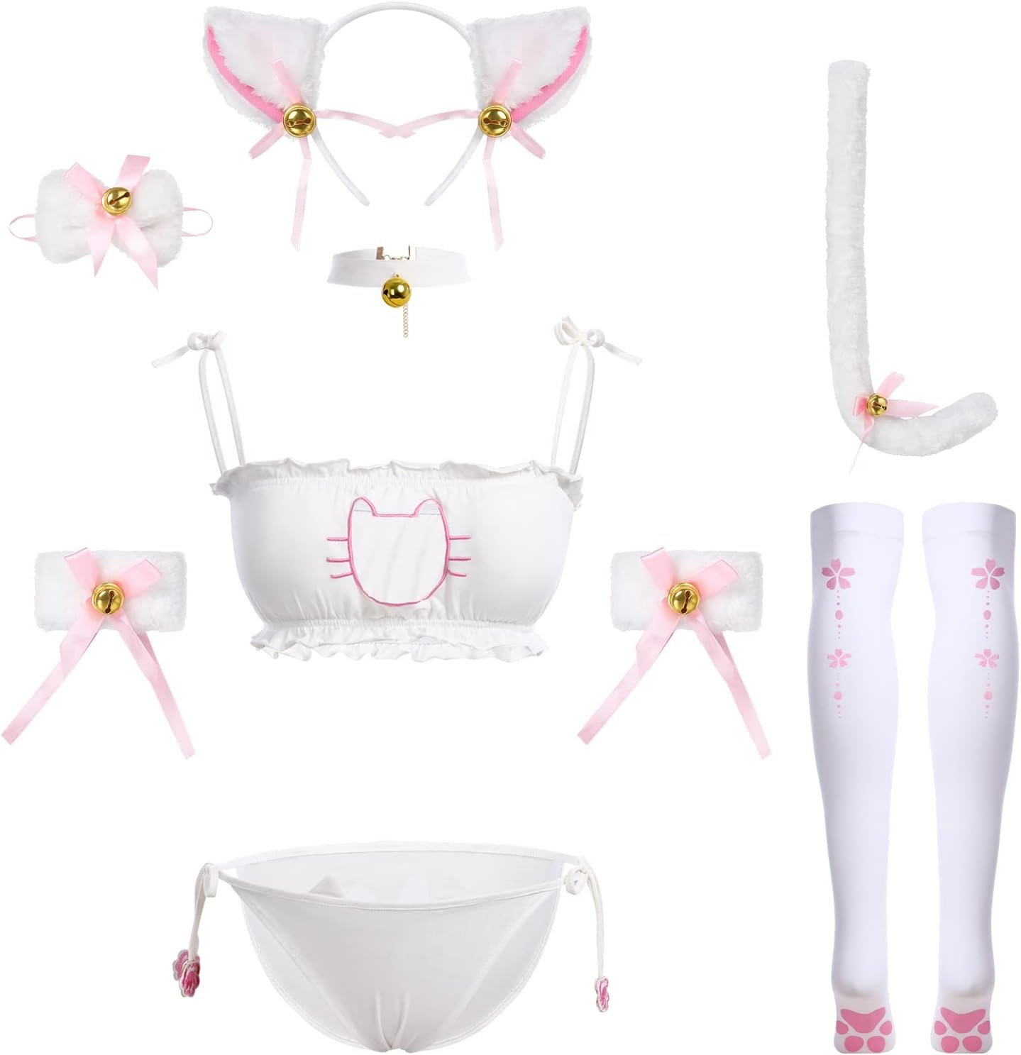 ABAFIP – Lindo conjunto de lencería Kawaii para mujer (diadema de oreja, mangas de muñeca, collar de campana, medias)
