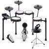 Con cabezales de tambor premium para una respuesta silenciosa pero natural: una gran caja de malla de doble zona de 10 pulgadas para máxima jugabilidad y tres almohadillas de malla de 8 pulgadas, una torre de tambor con pedal de bombo, un platillo de choque de 10 pulgadas con estrangulador, paseo de 10 pulgadas y hi-hat de 10 pulgadas con controlador de pie, todo montado en un estante de aluminio de 4 postes para máxima estabilidad y flexibilidad. La caja contiene cables de conexión, baquetas, llave de tambor y fuente de alimentación.