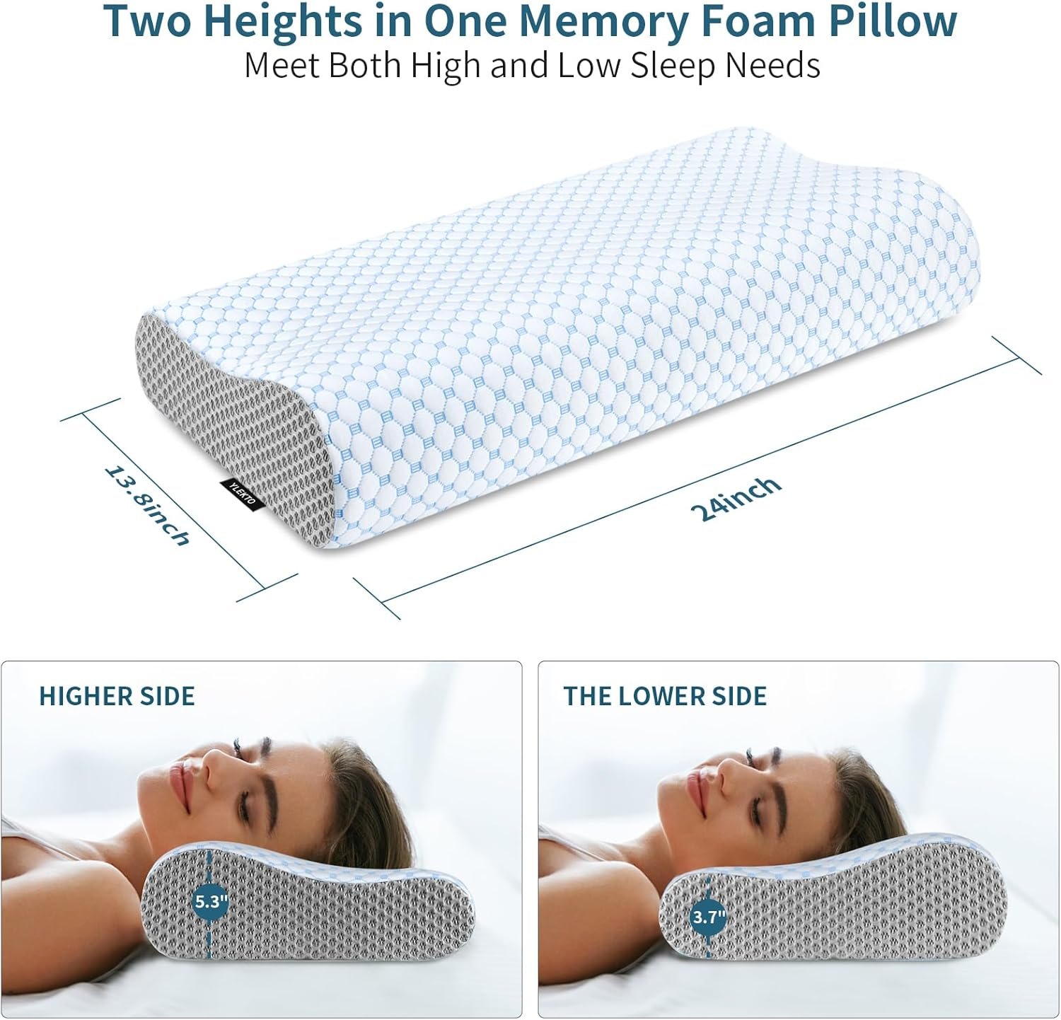 - 2 alturas para cualquier estilo de sueño: cuando todavía estás preocupado por no encontrar la almohada de altura correcta, nuestras almohadas de cama tienen 2 alturas diferentes (24 x 13.8 x 5.3/3.7 pulgadas de largo x alto x ancho) en ambos lados para que elijas, puedes elegir la altura más adecuada para tu postura de sueño y disfrutar de un sueño cómodo. La almohada ortopédica ajustable para aliviar el dolor de cuello es adecuada para personas que duermen de lado, espalda, estómago y personas que duermen con poca almohada
