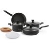 - El juego incluye: cazuela de 7 pulgadas (3 cuartos) con tapa de vidrio y tapa de almacenamiento de plástico, cazuela de 9.5 pulgadas (5 cuartos) con tapa de vidrio, sartén de 10.3 pulgadas (3.7 cuartos) con tapa de vidrio, sartén abierta de 11 pulgadas y 2 salvamanteles de madera