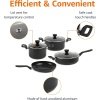 - Adecuado para todas las estufas, excepto para inducción, apto para horno hasta 350 ℉ (350.6 °F); las ollas, sartenes y tapas son aptas para lavavajillas.