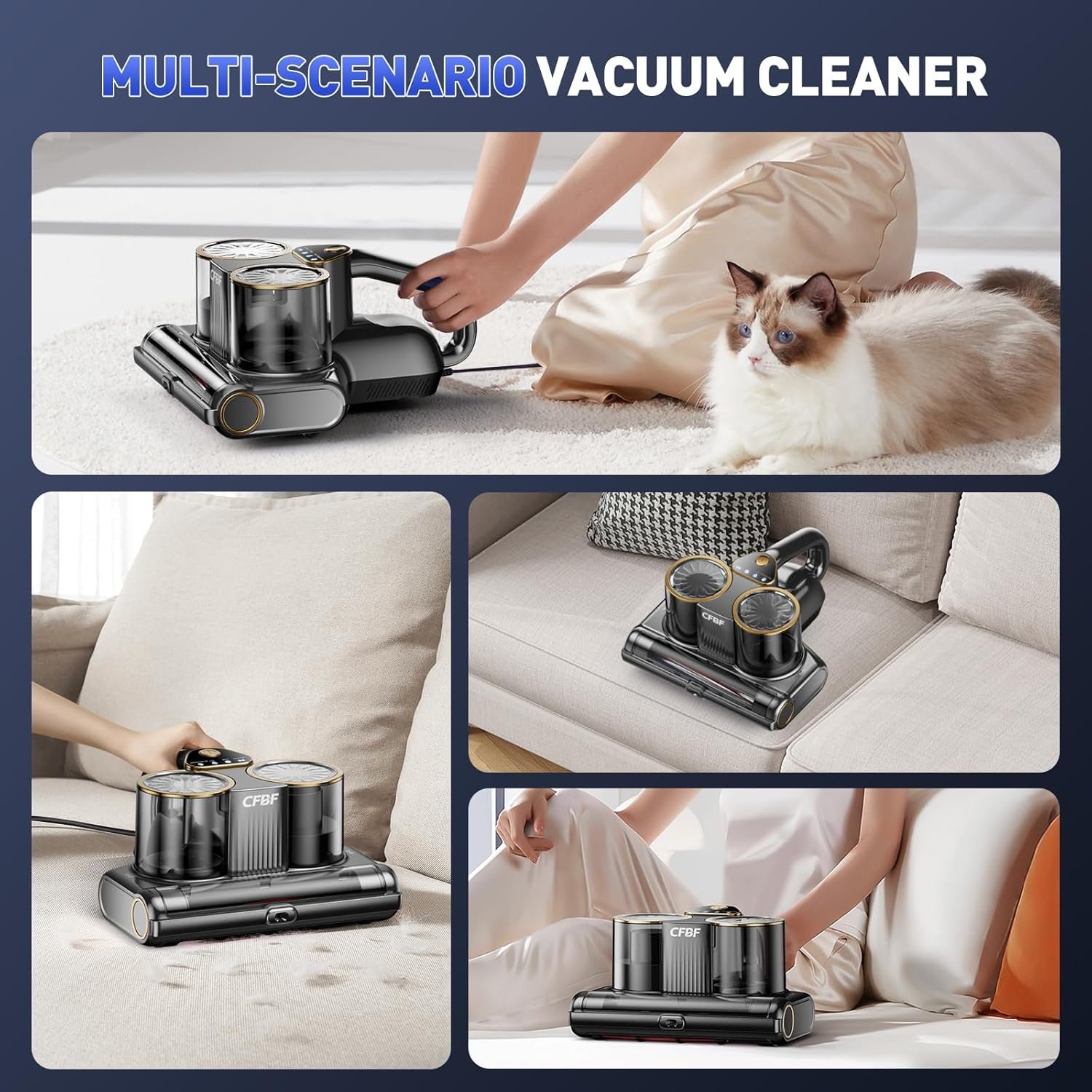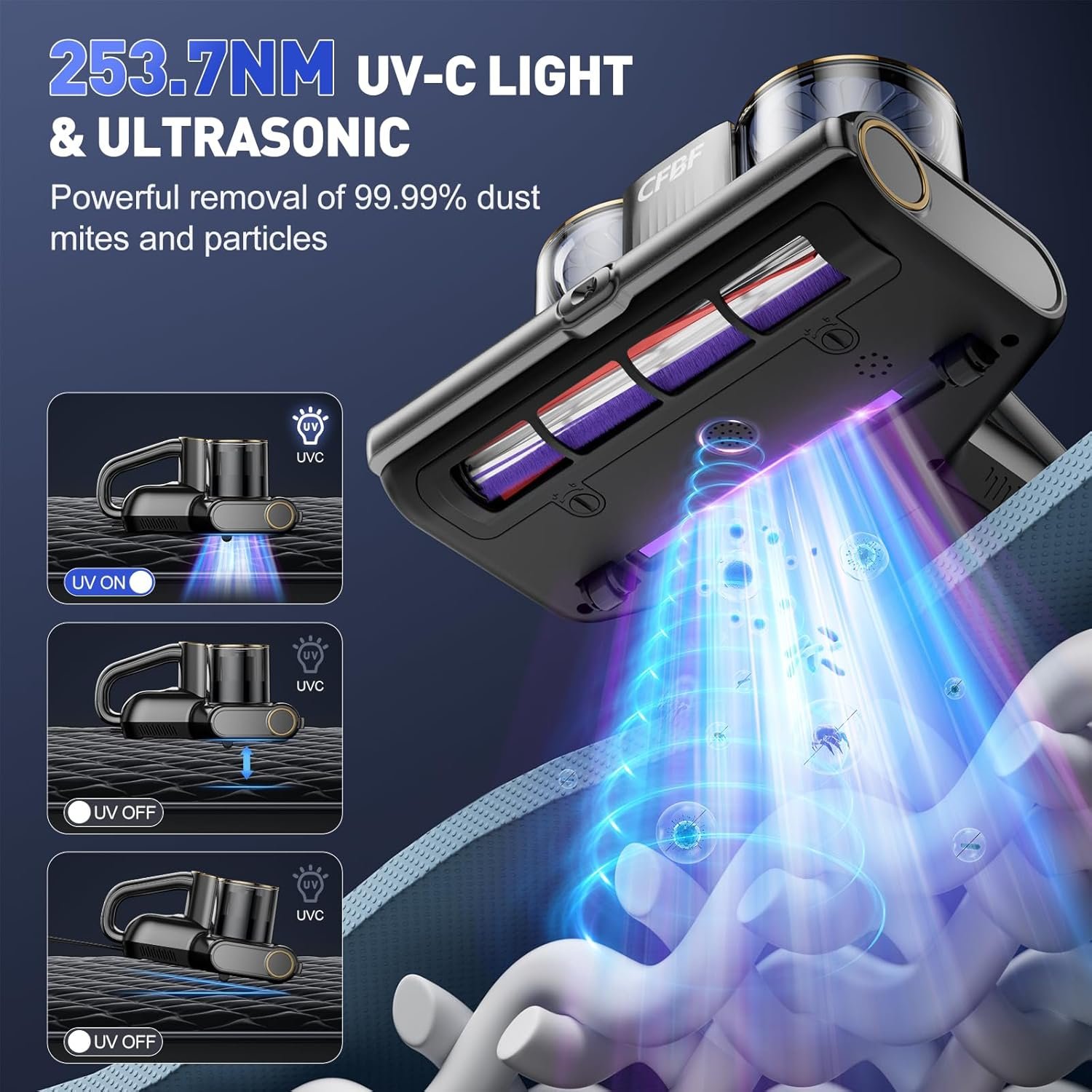 - 99.99% de eliminación de alérgenos: utiliza luz UV de 253.7 nm y tecnología ultrasónica. La luz ultravioleta elimina varios alérgenos y limpia profundamente colchones y otras telas. Las ondas ultrasónicas pueden destruir la estructura interna de los alérgenos e inhibir su ciclo de vida. La aspiradora UV elimina eficazmente el 99.99% de los alérgenos de camas, colchones, almohadas, cunas, alfombras, lo que te brinda un ambiente doméstico más saludable