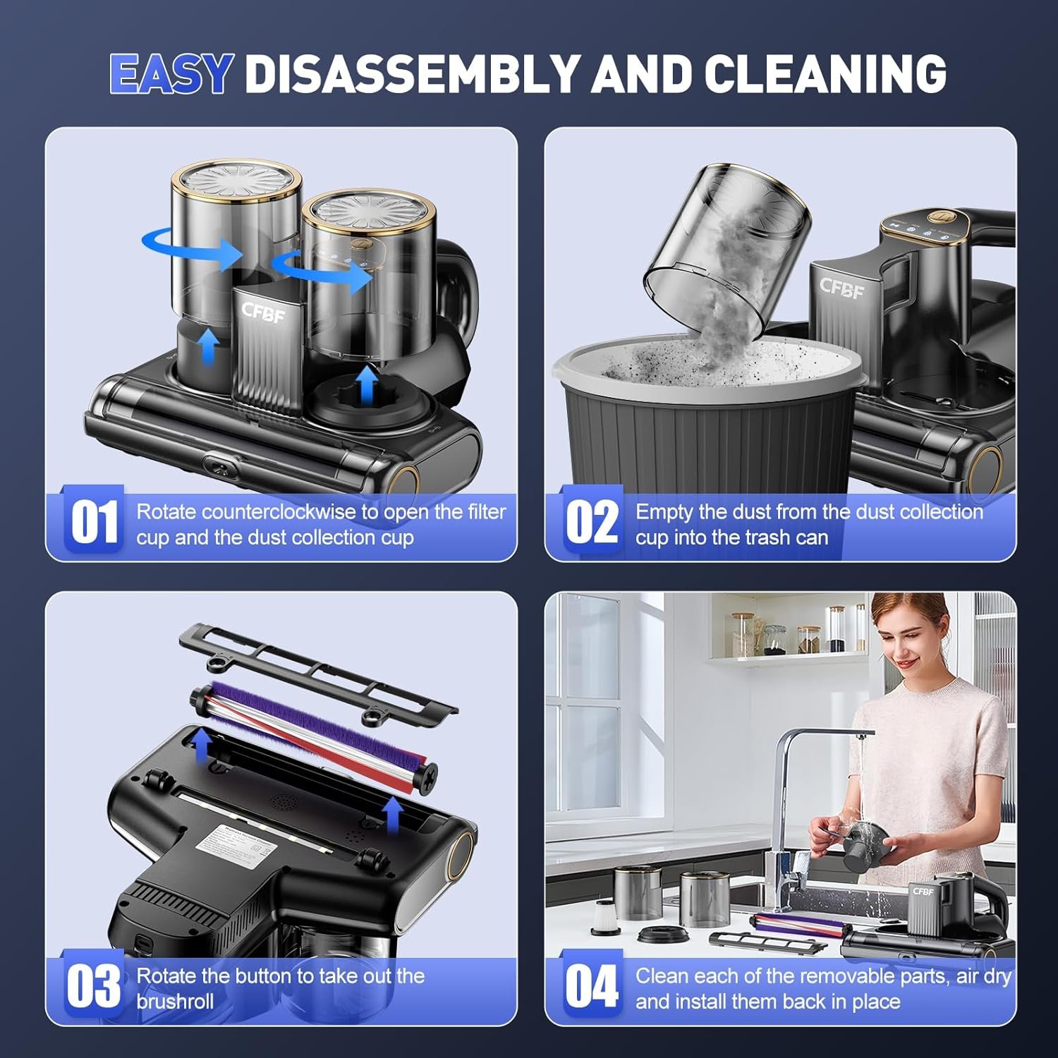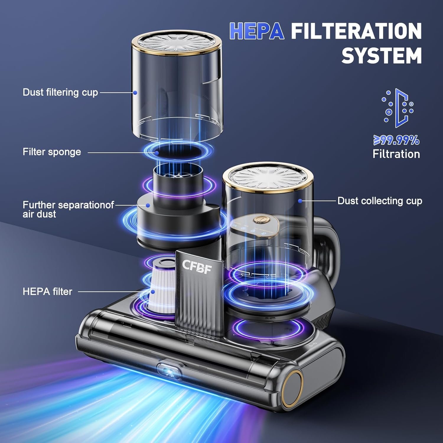 - 【Sistema de filtración de doble taza】El limpiador de colchón adopta tecnología de filtración de doble ciclón de motor de alta velocidad, que puede separar fácilmente el polvo y el cabello, evitando eficazmente los problemas comunes de obstrucción de la aspiradora de cama normal. Equipado con un filtro HEPA que filtra eficazmente el 99.99% de las partículas diminutas. El diseño de doble taza y filtro lavable y reutilizable es fácil de desmontar, y con el cepillo pequeño incluido, la limpieza se vuelve más fácil y rápida
