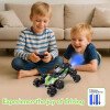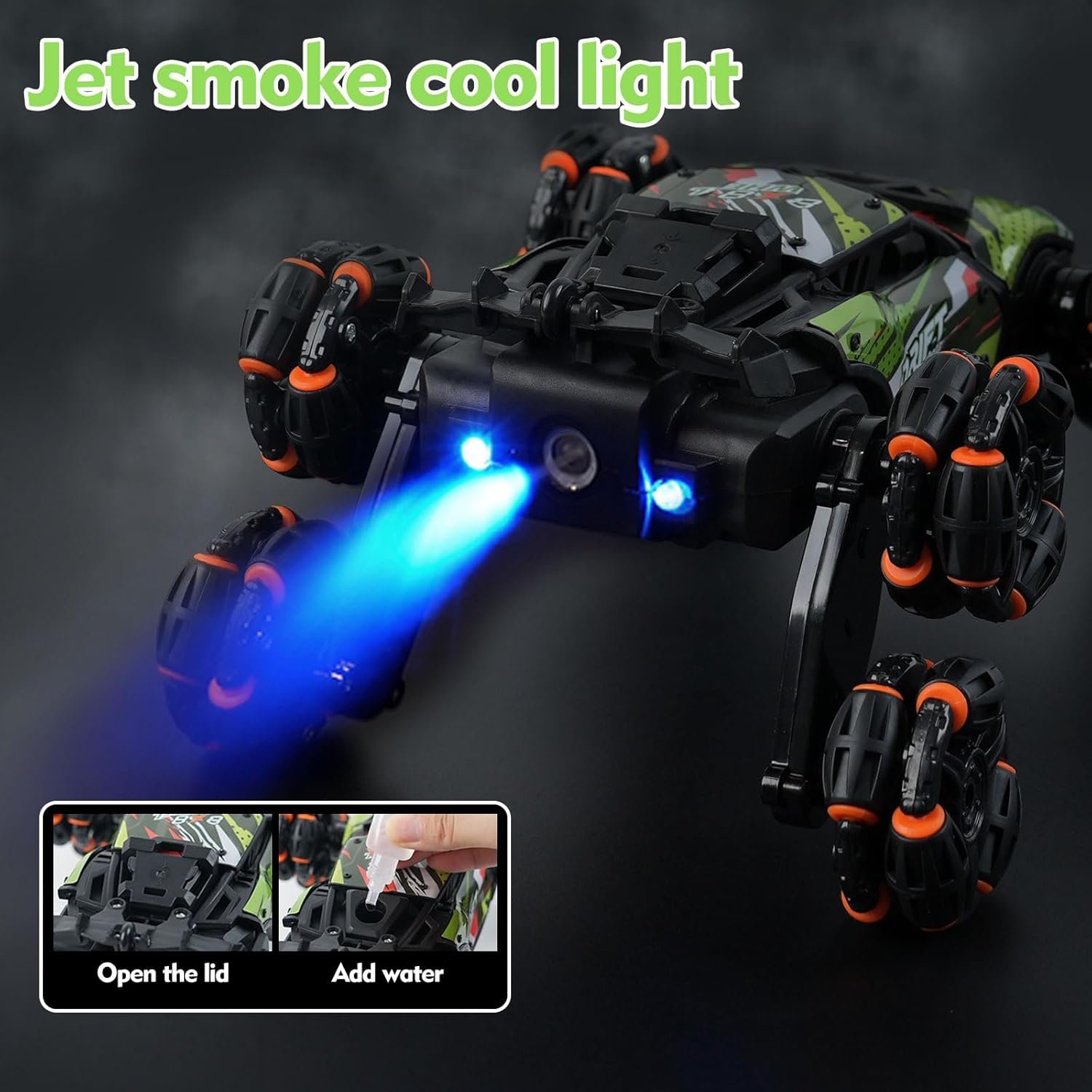- Espectáculo dinámico de luz y aerosol: nuestro coche a control remoto cuenta con luces vibrantes, música dinámica y efectos de pulverización, añadiendo un toque visual único para aventuras nocturnas o actuaciones de acrobacias. El cuerpo verde destaca bajo las luces, por lo que es adecuado para juegos en interiores o exteriores. ¡Esta combinación de efectos visuales y de sonido garantiza que cada acción sea emocionante!
