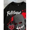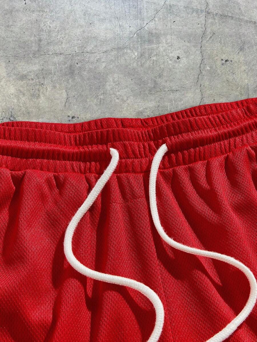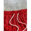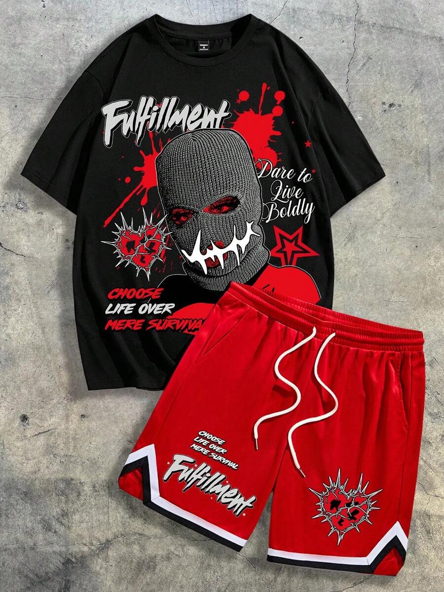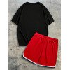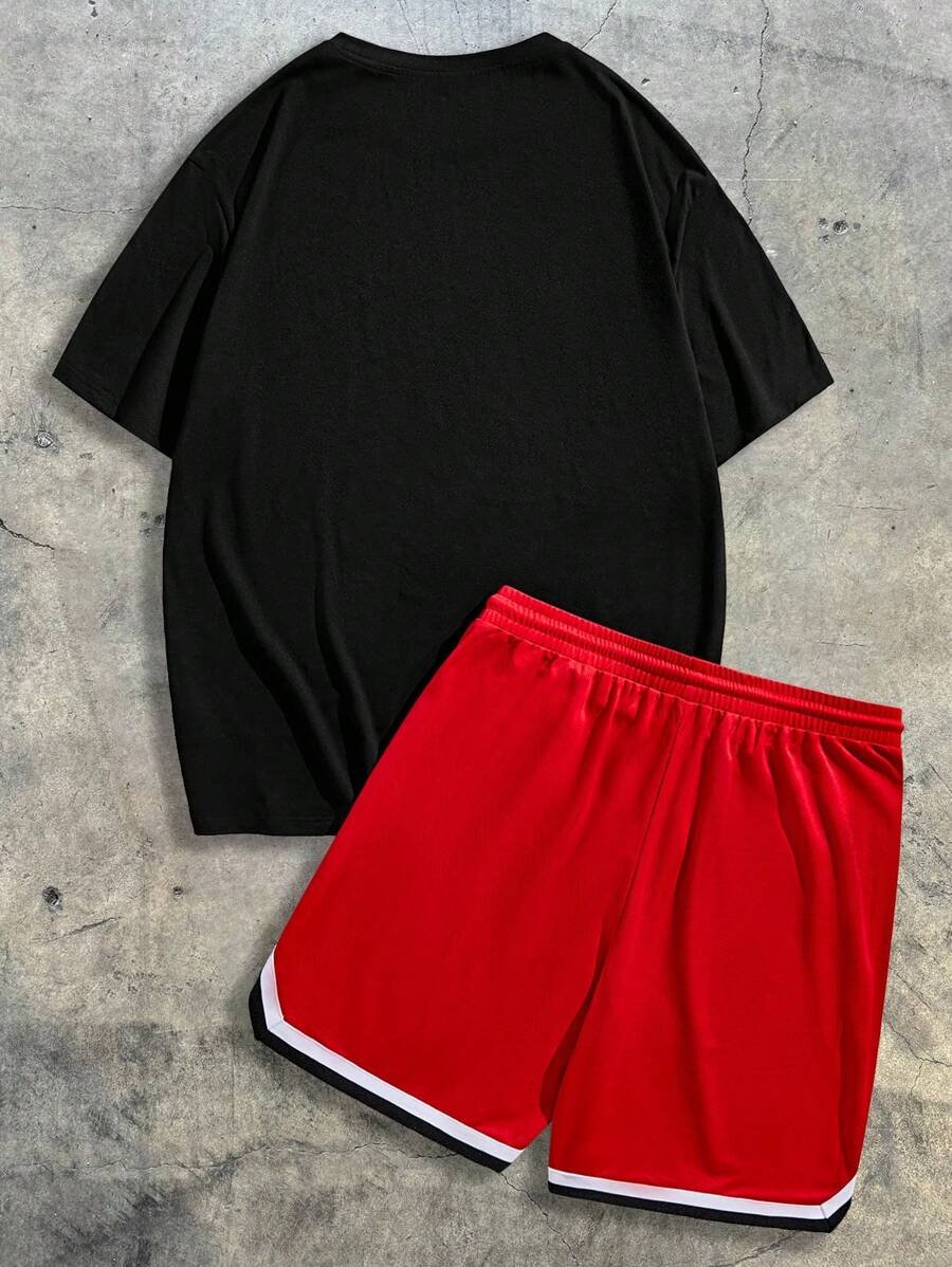AXEPEAK Conjunto deportivo de verano con camiseta negra estampada con lema + shorts rojos de baloncesto, listo para la ropa de calle