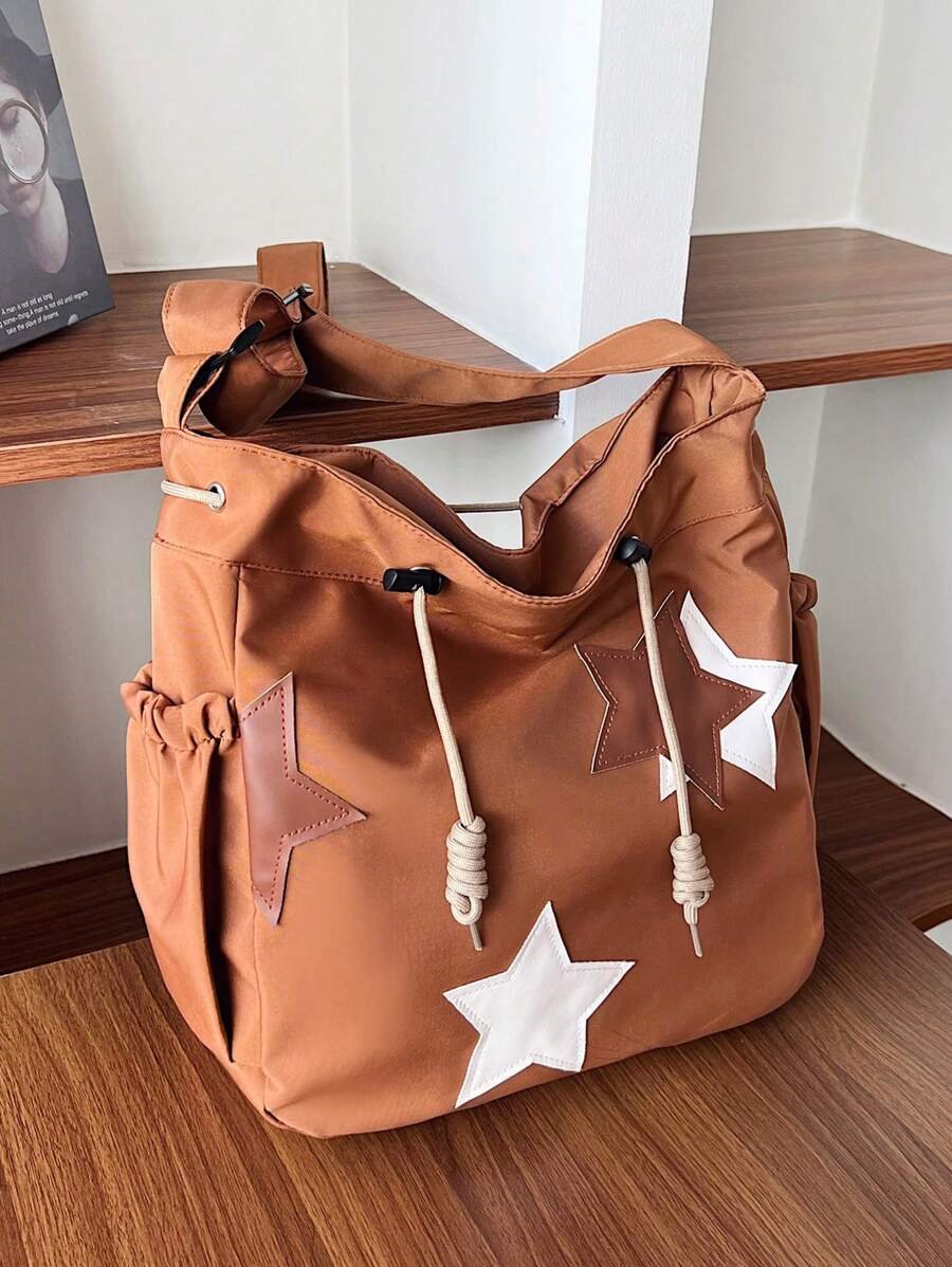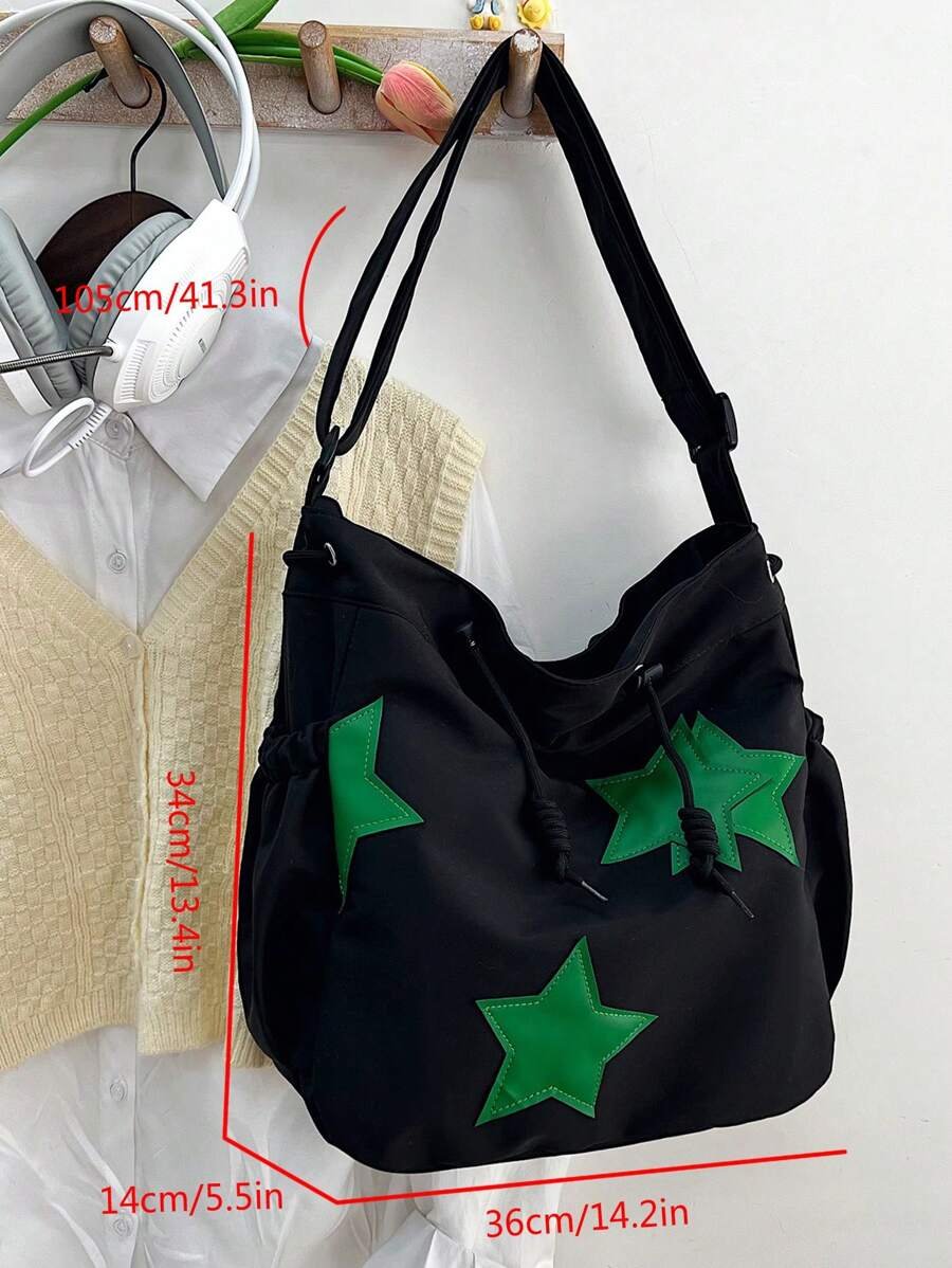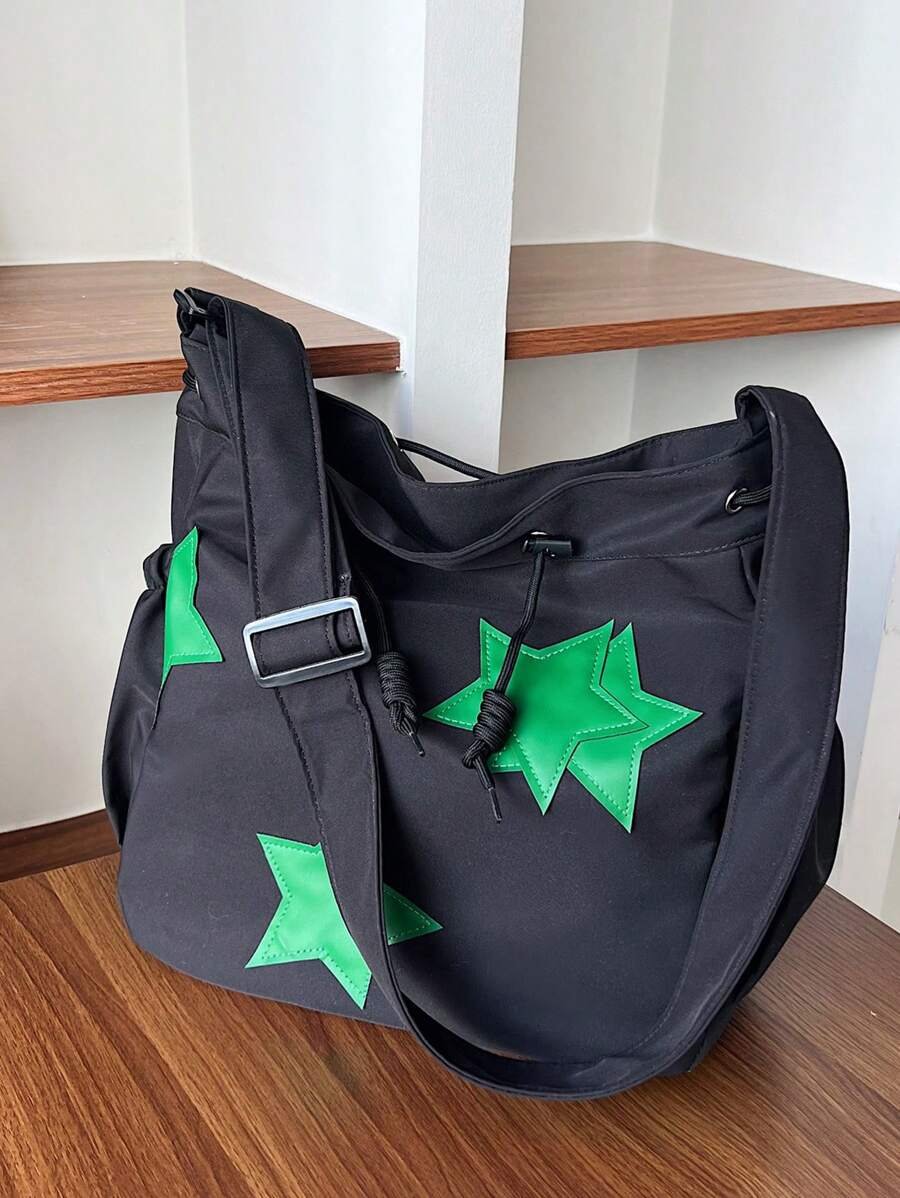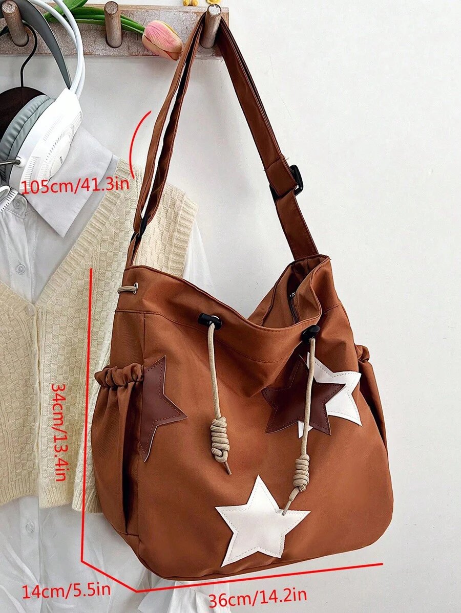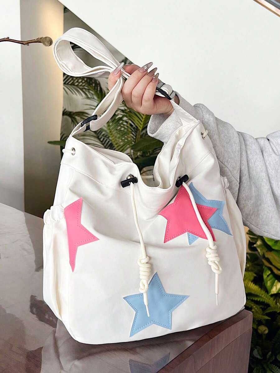 Bolsa de lona grande con decoración de estrella de 5 puntas sólida de nailon de nueva llegada para primavera/verano. Bolso de hombro y bandolera para mujeres, estudiantes y universitarias. Bolsa escolar, bolso escolar, bolsa de libros, impermeable, ligera, plegable, clásica y casual, adecuada para adolescentes, mujeres y estudiantes universitarias, perfecta para volver al colegio, primer día de clases, conciertos