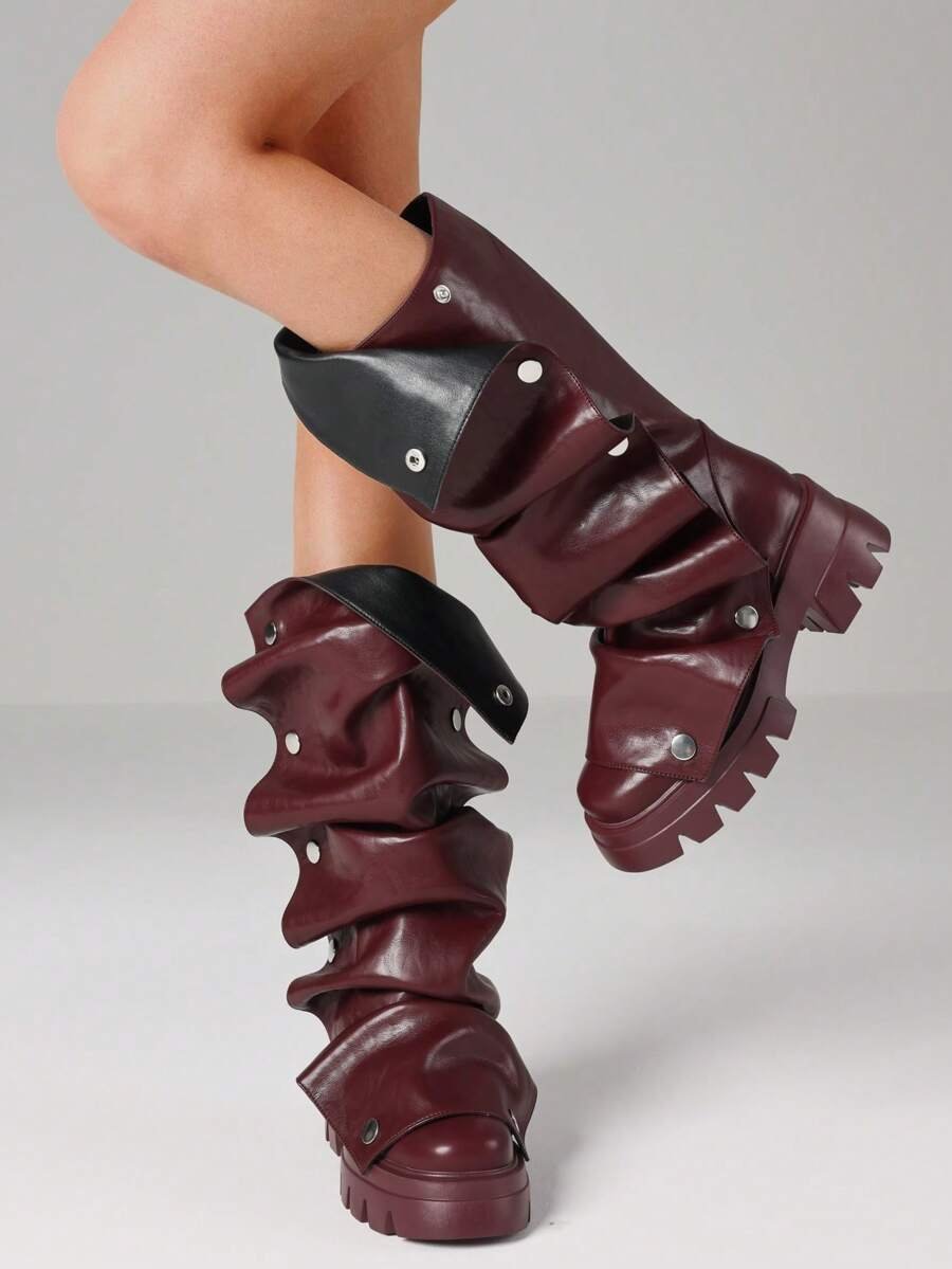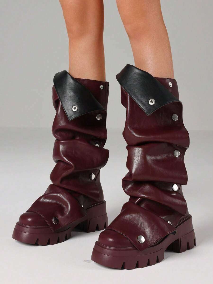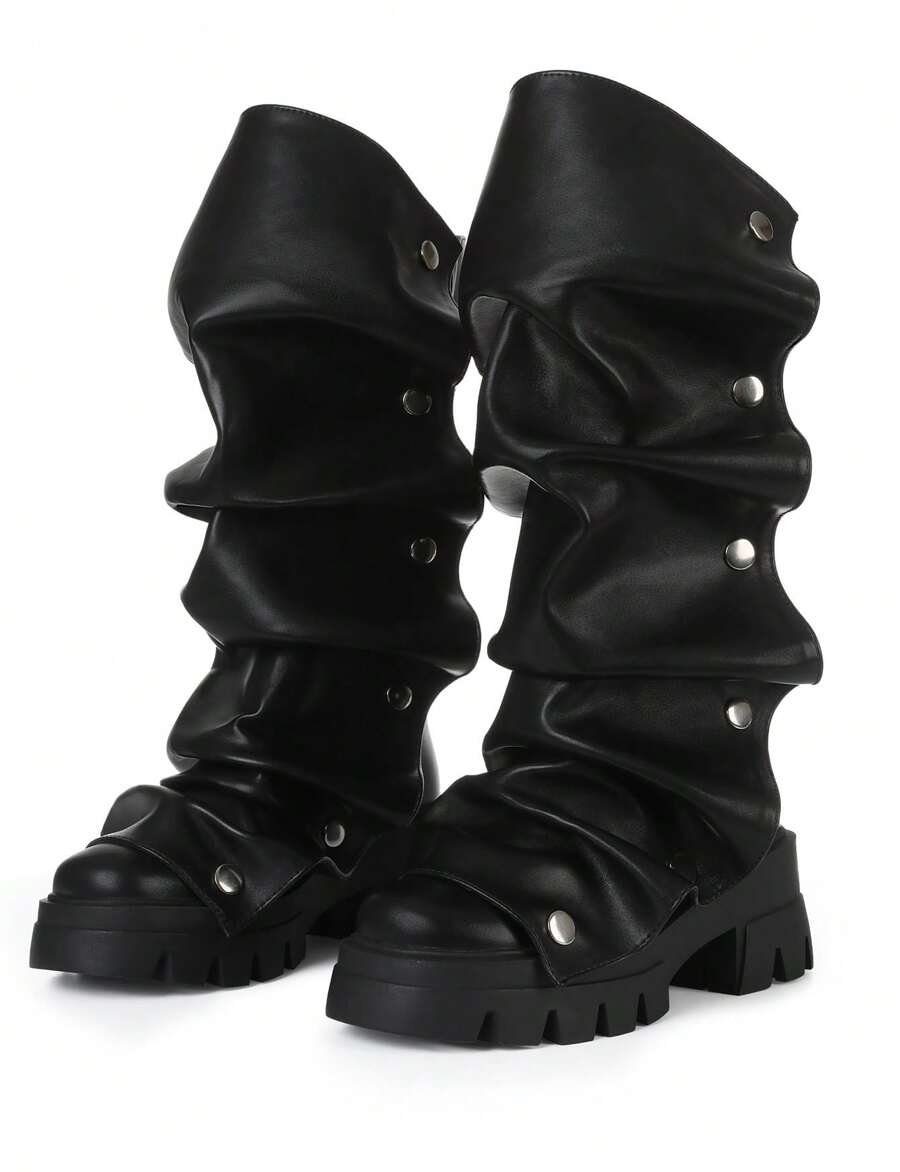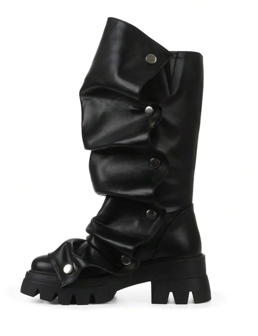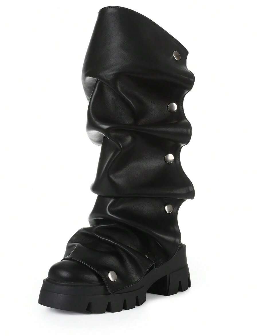 Botas de plataforma hasta la rodilla para mujer, de color liso, con pliegues, tacón de bloque, punta redonda, estilo western, para todas las estaciones