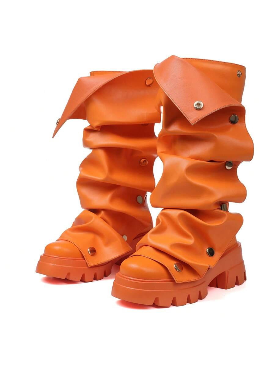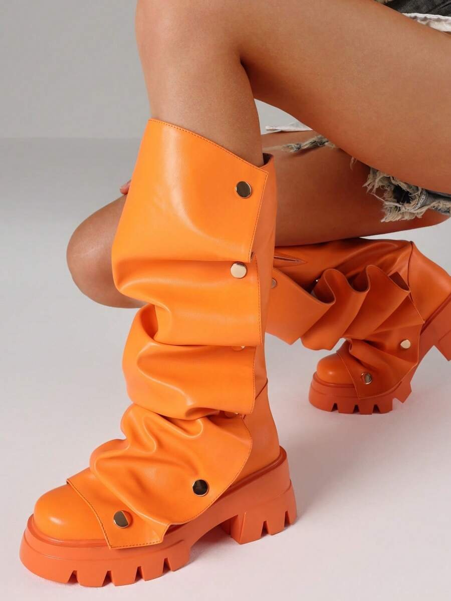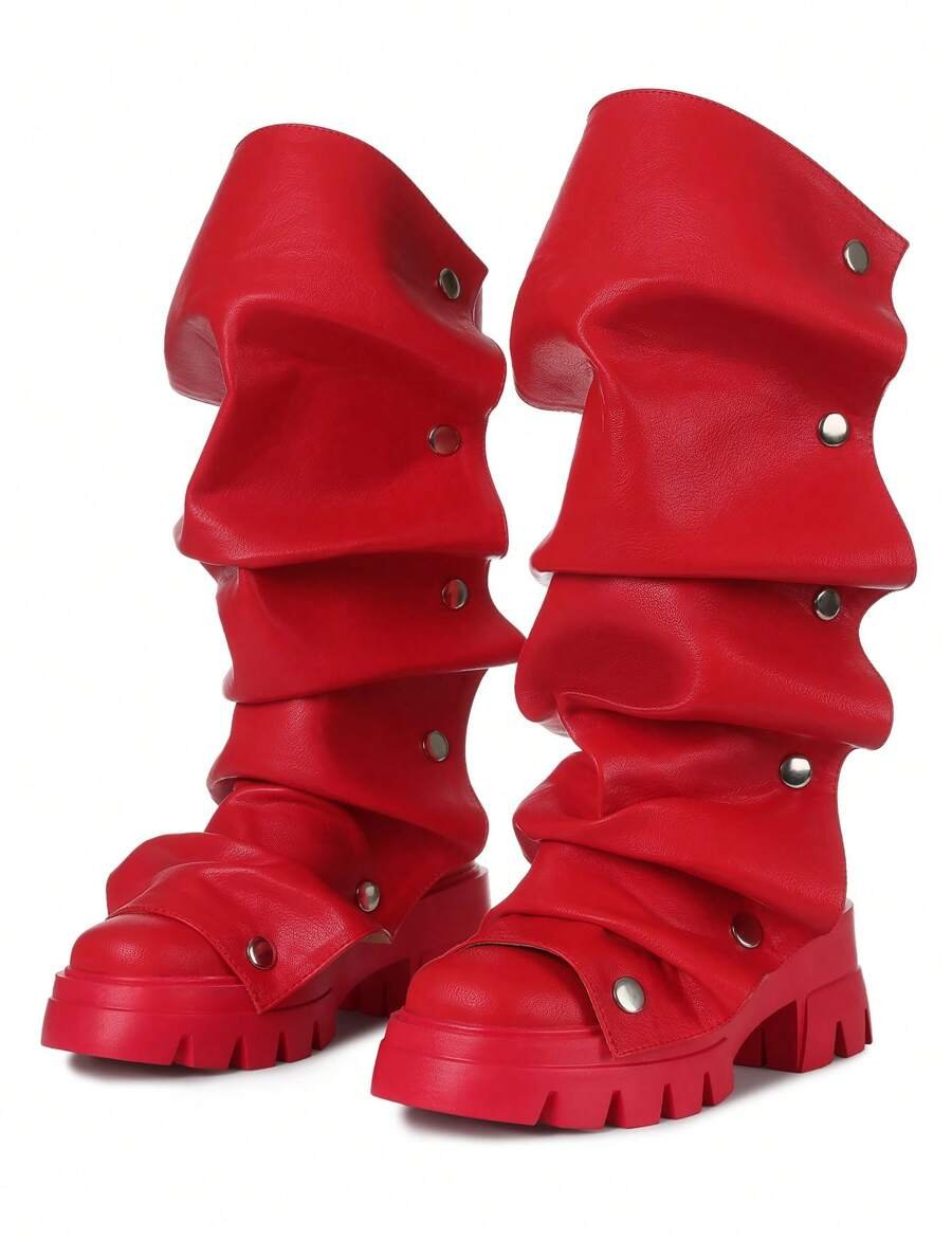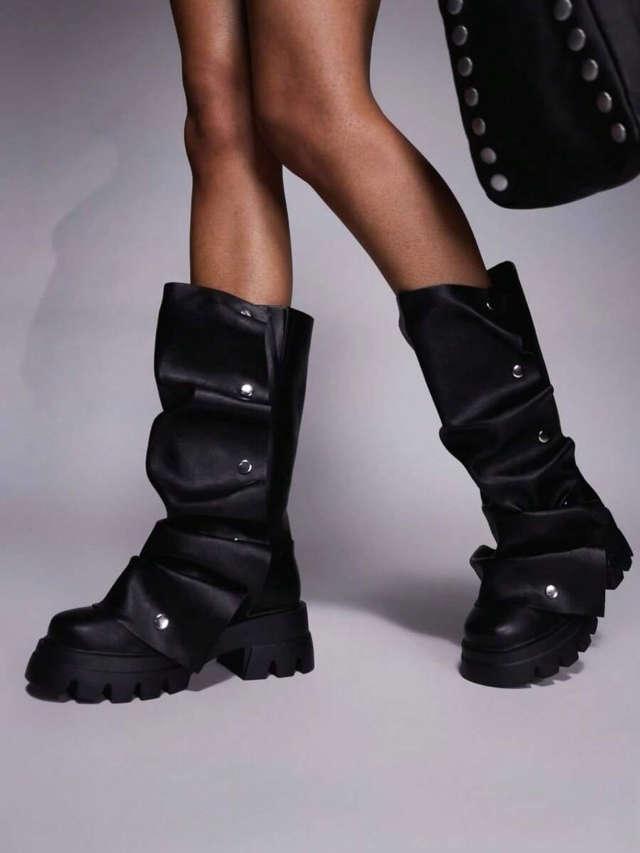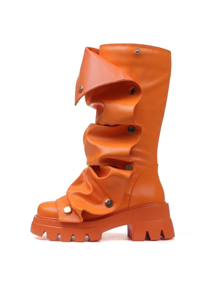 Botas de plataforma hasta la rodilla para mujer, de color liso, con pliegues, tacón de bloque, punta redonda, estilo western, para todas las estaciones