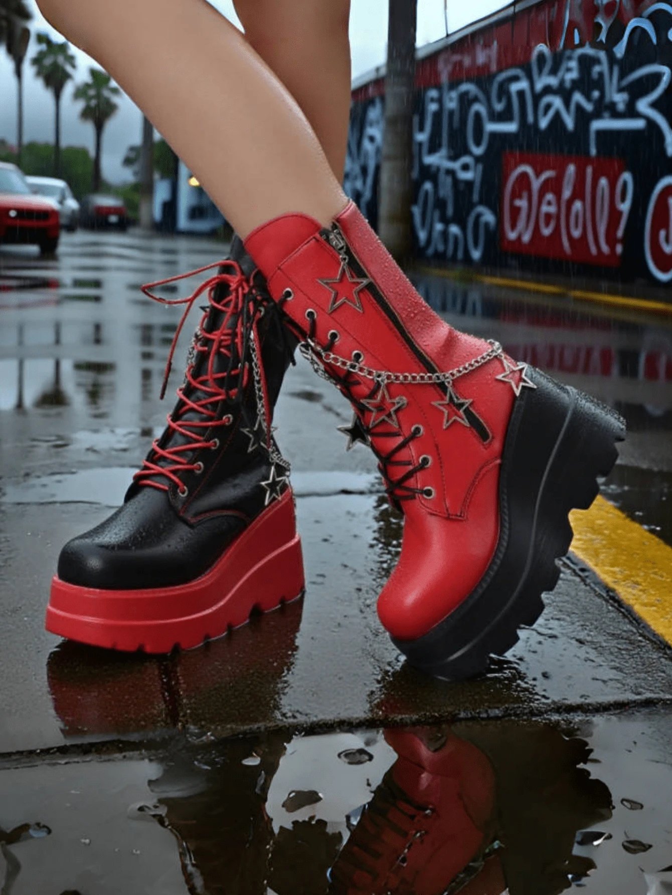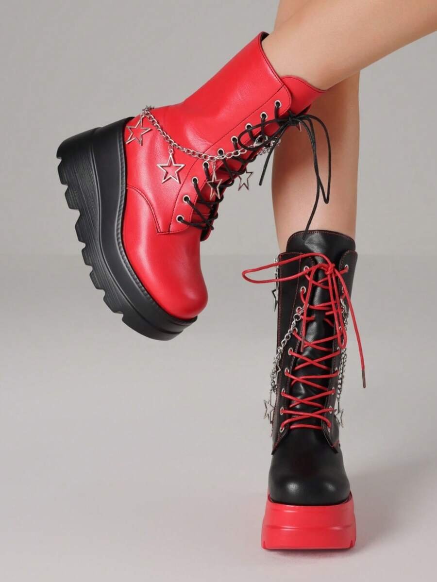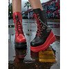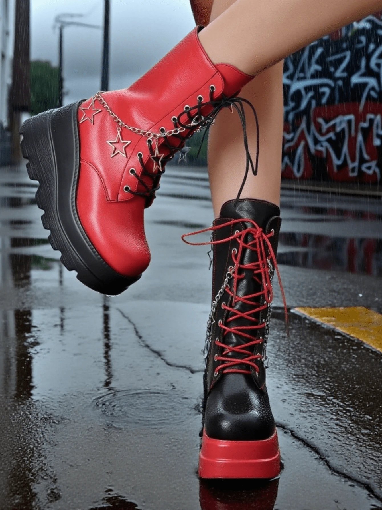 Botas góticas de punta redonda con tacón de plataforma para mujer, botas de combate estilo punk con cordones y cremallera lateral