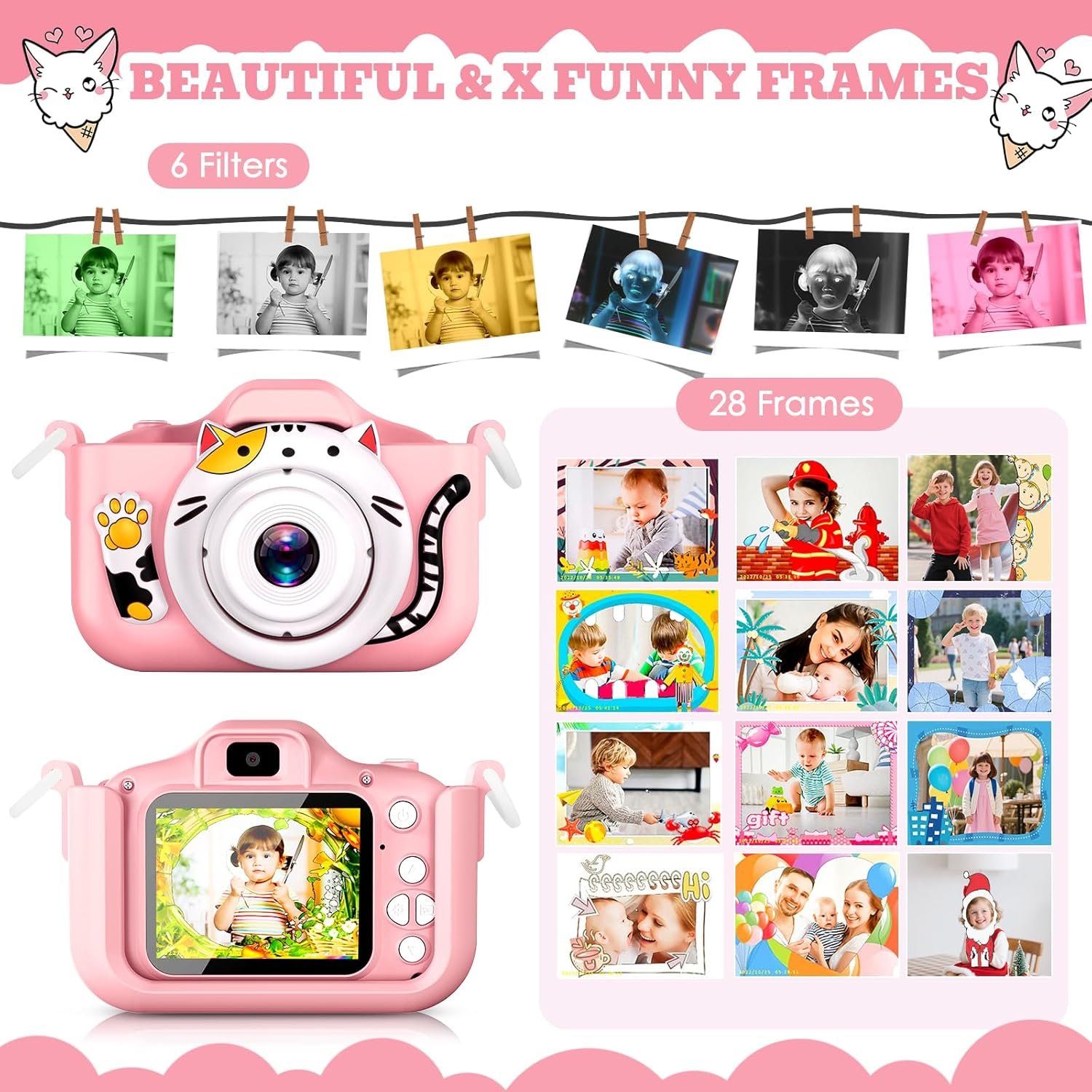 Múltiples funciones y juegos: nuestra cámara para niños es más que una cámara. Viene con 28 marcos de fotos de dibujos animados y 6 filtros, así como características como selfies, video, reproducción, grabación y juegos de rompecabezas. Incluso incluye cinco juegos controlados por movimiento para aún más diversión para su hijo. La cámara tiene una lente de alta calidad y una pantalla de protección ocular IPS para la seguridad y comodidad de tu hijo.