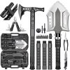 28-in-1 Survival Toolsshovel, flashlight,saw, axe, hoe, hexagon wrench, scissors, multi-function tools,bottle opener, screw set, compass,whistle,hunting knife,etc. | Ultimate Camping ToolsThe thickened shovelhead is made of 3CR13 stainless steel, with super hardness, strong and not easy to corrode. You can use this folding shovel for anything like digging snow, sand, dirt, mud and more. | Survival AxesThe hatchet head is made from steel with a hammer at the back. It has an excellent grip and a balanced weight.Make your outdoor work become easily. |