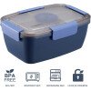 Product Specifications: Size: 9.25”L x 6.5”W x 3.85”H | Compartment Capacity: Salad Bowl Capacity: 68 oz; Sauce Container Capacity: 3 oz; 2 x Large Compartments 5 oz ; 2 x Small Compartments 3.5 oz | Materials: FDA-approved, food-safe materials (BPA-Free)