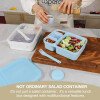 - Mantiene las ensaladas y comidas frescas: la tapa hermética cuenta con un anillo de sellado de silicona y los clips de bloqueo seguros sellan la frescura, mientras que el recipiente de alimentos de 2 compartimentos, la bandeja de aderezos extraíble integrada y el recipiente para salsa mantienen las ensaladas y los ingredientes separados, por lo que todo se mantiene crujiente todo el día y nunca se empapa.
