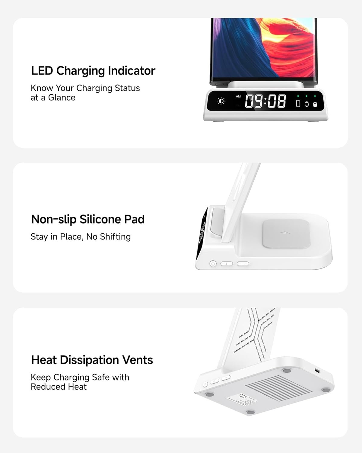 Hay cuatro almohadillas antideslizantes en la parte inferior de la base del cargador inalámbrico, así como una almohadilla antideslizante para el teléfono y una almohadilla antideslizante para la posición de carga de auriculares. Este diseño evita que la carga inalámbrica se caiga, evitando así daños en el teléfono y la funda de carga de auriculares inalámbricos.