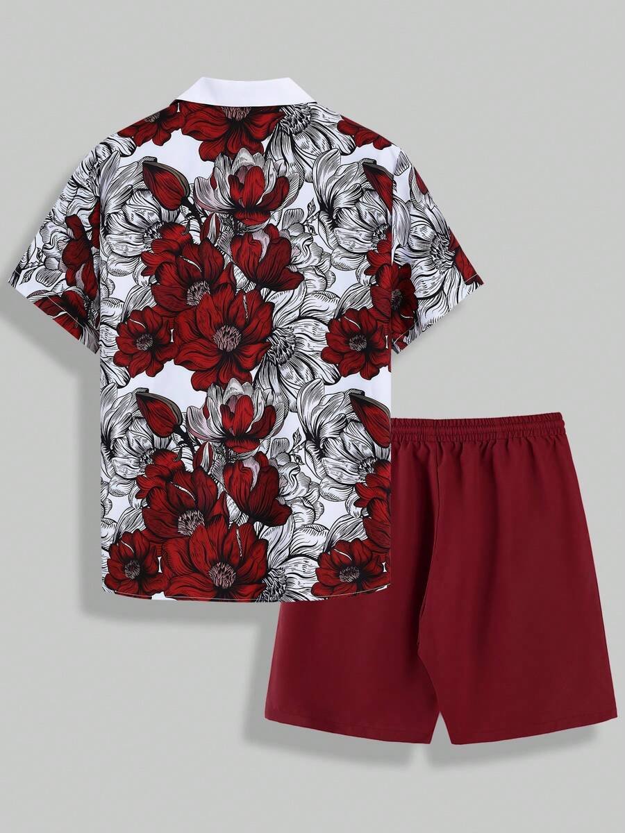 Conjunto de camisa y pantalones cortos con estampado floral burdeos para hombre, atuendo cómodo de verano