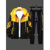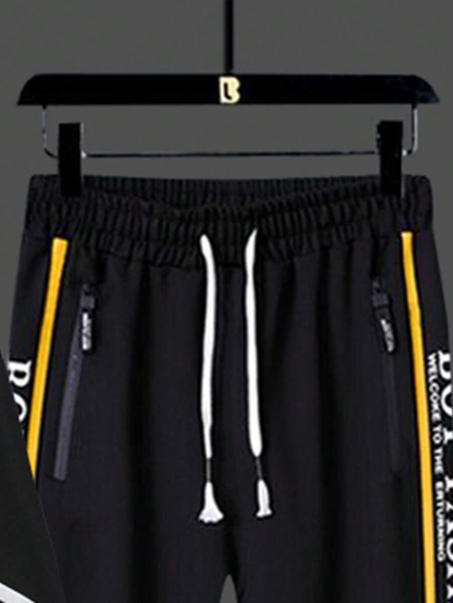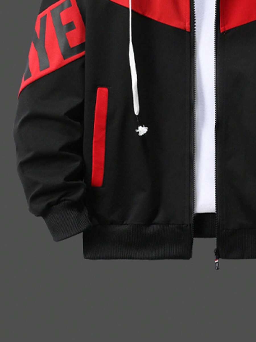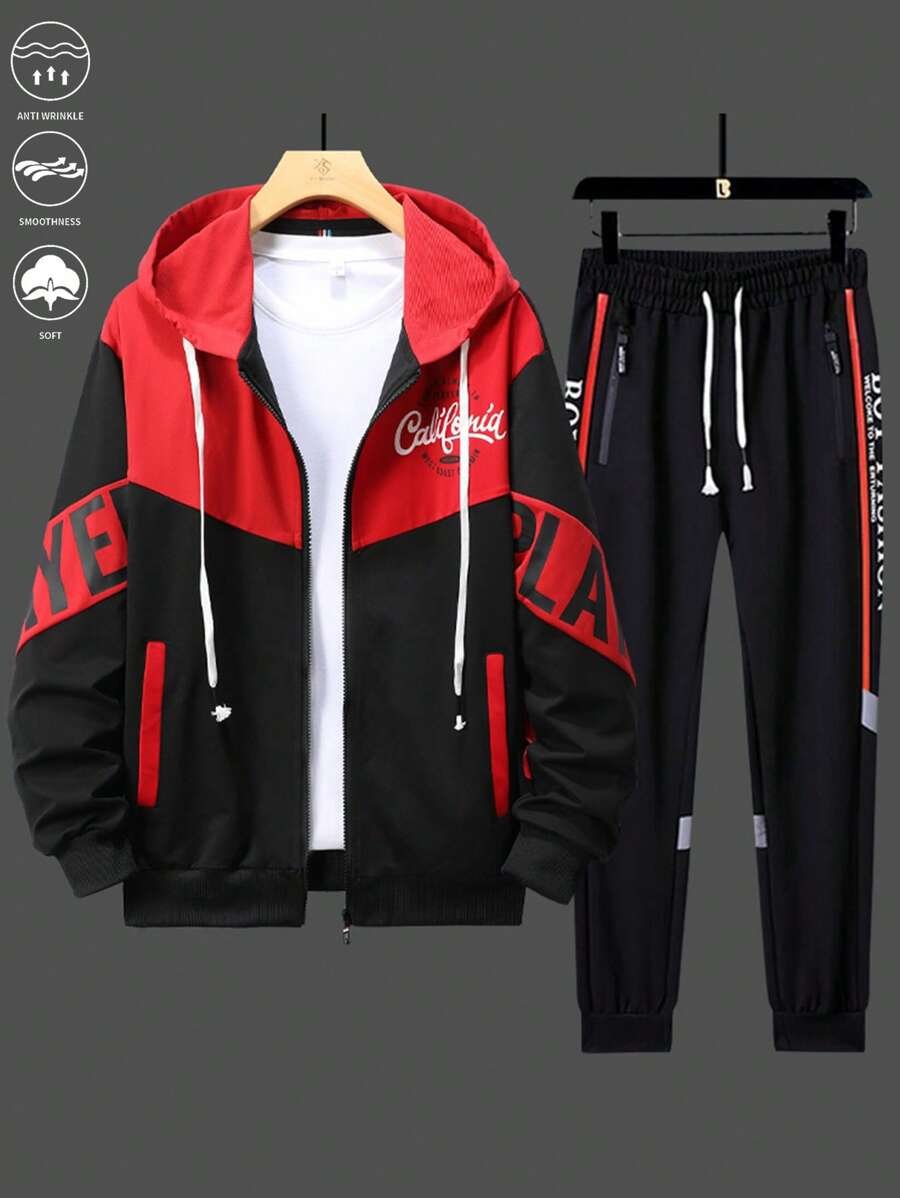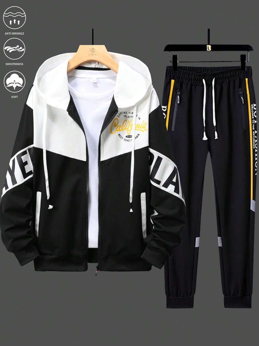 Conjunto de chaqueta y pantalones casuales y versátiles para hombres con parches de colores contrastantes y estampado de letras, ropa de otoño