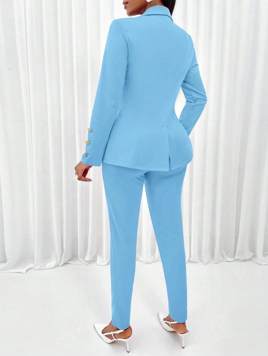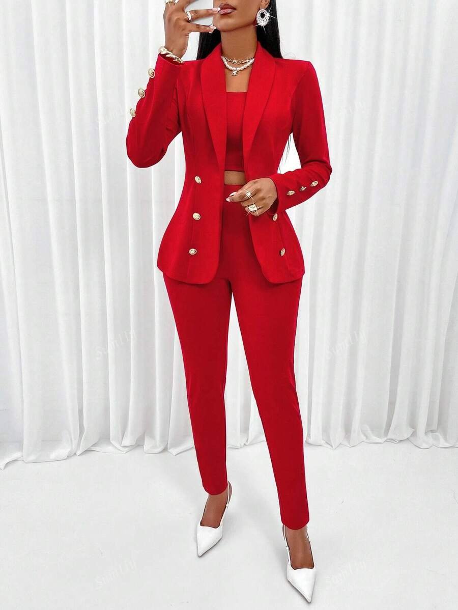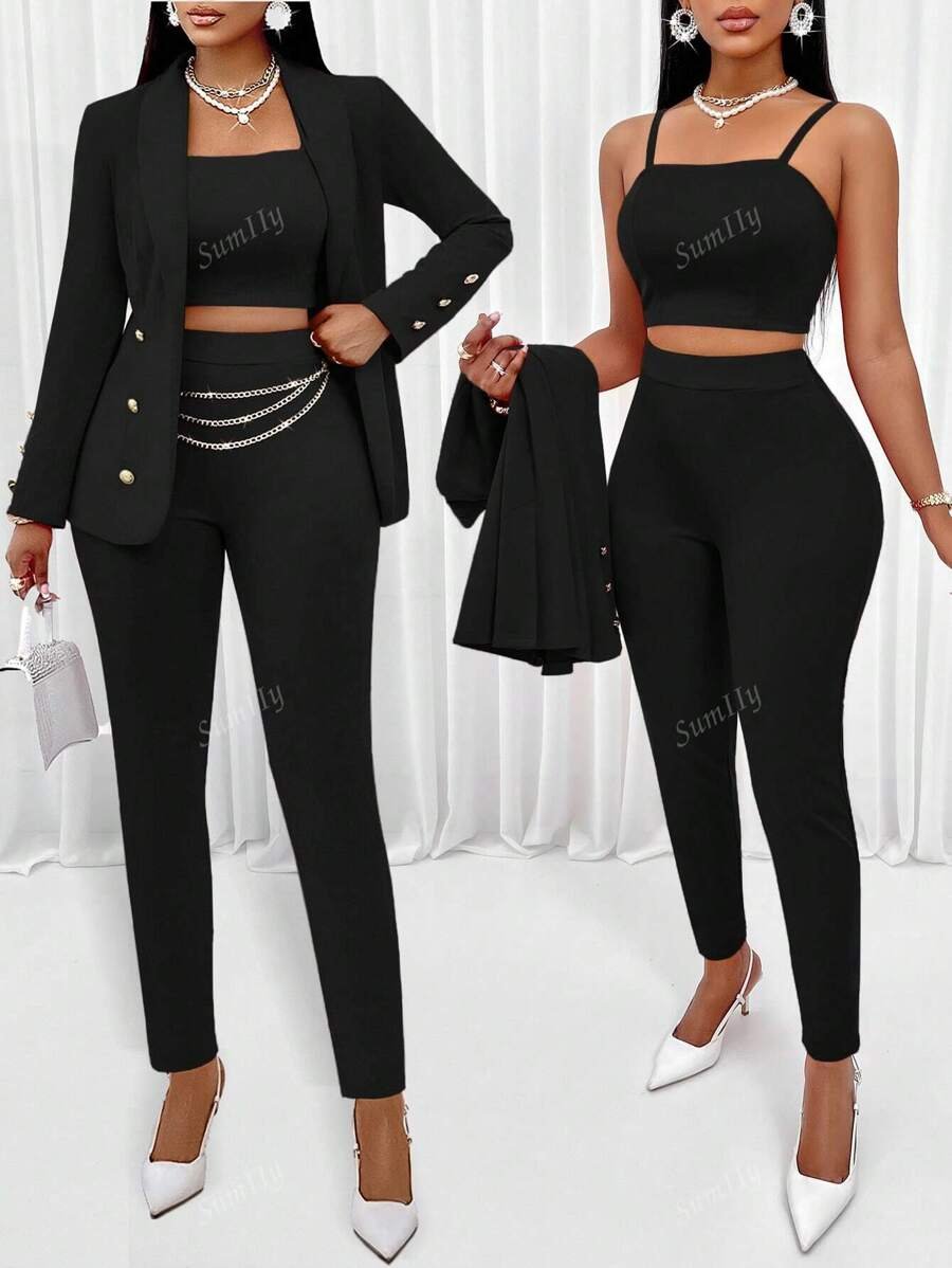Conjunto de tres piezas para mujer con blazer de cuello chal de frente abierto, camiseta de tirantes y pantalones para un aspecto de oficina
