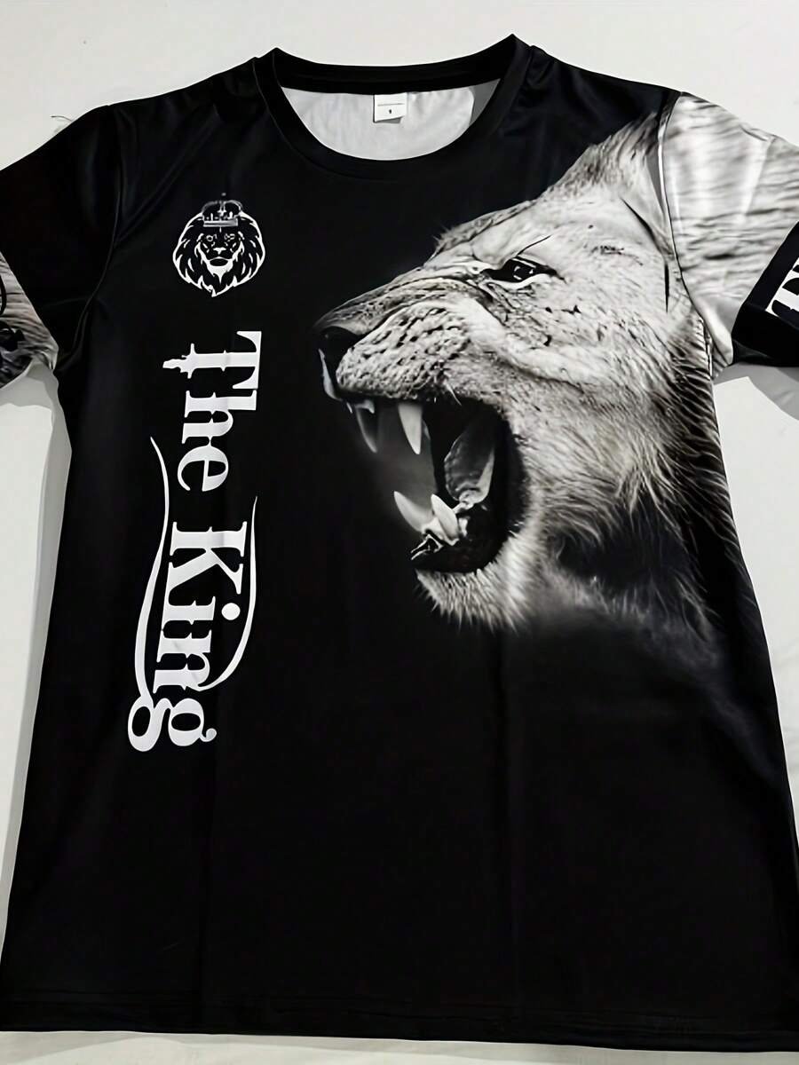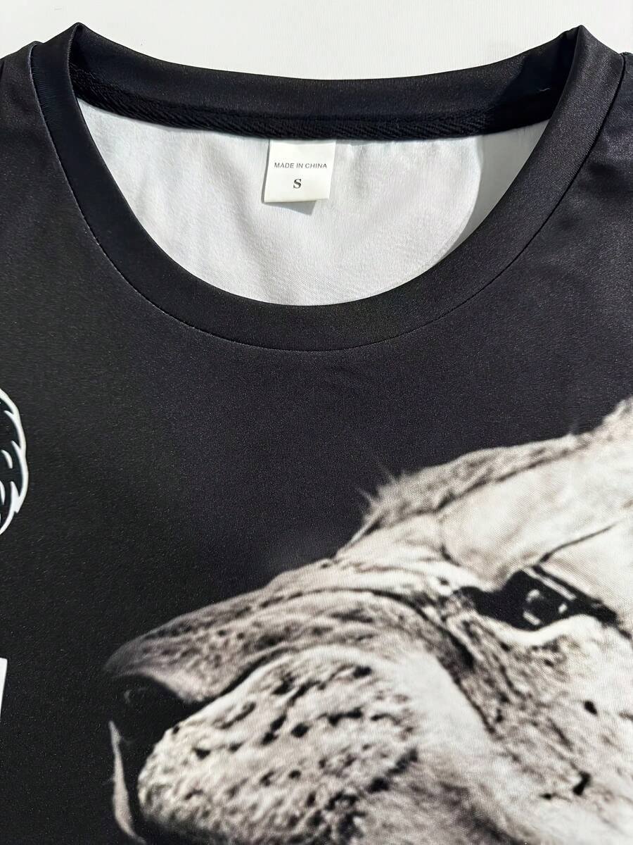 Conjunto deportivo con estampado de león 3D para hombre: equipo de ejercicio de poliéster para todo el año, con camiseta de cuello barco y pantalones a juego, estilo regular, tejido de punto ligeramente elástico, ropa deportiva con estampado animal