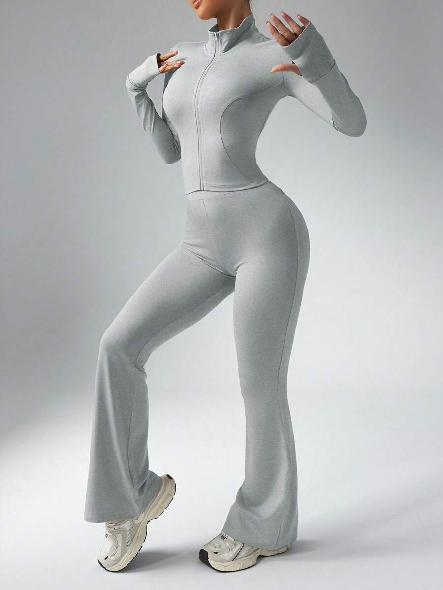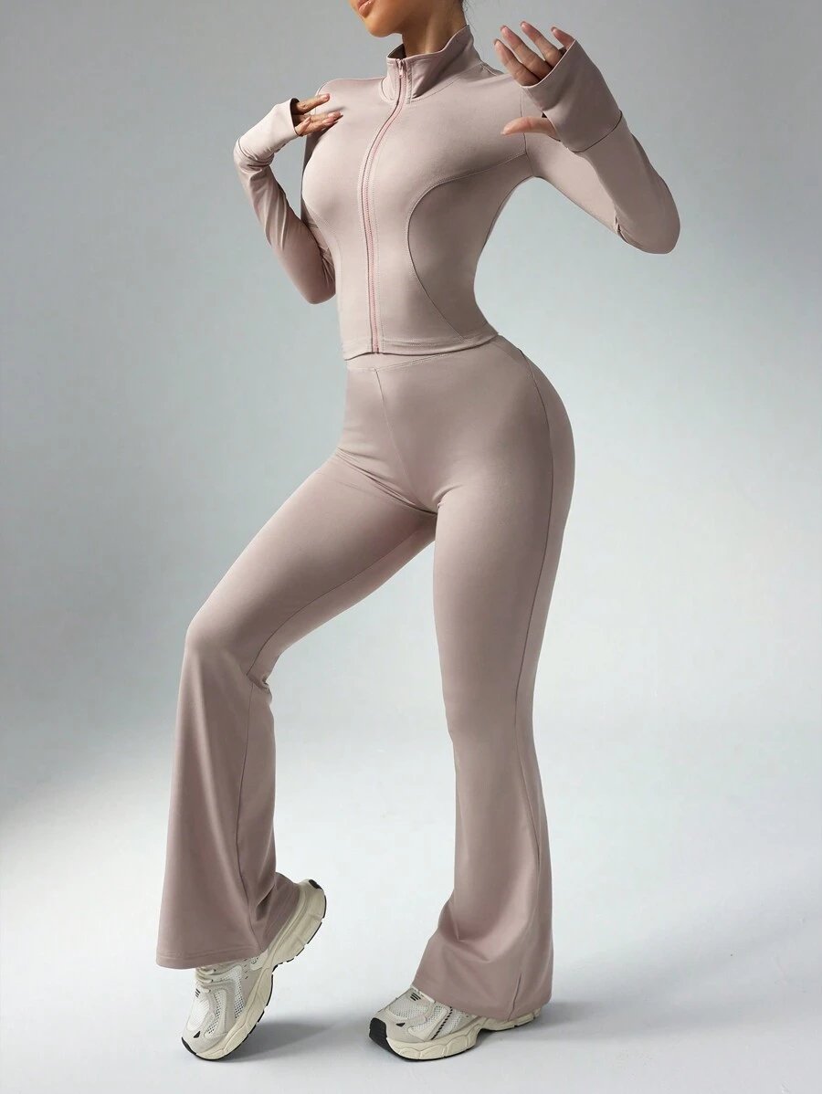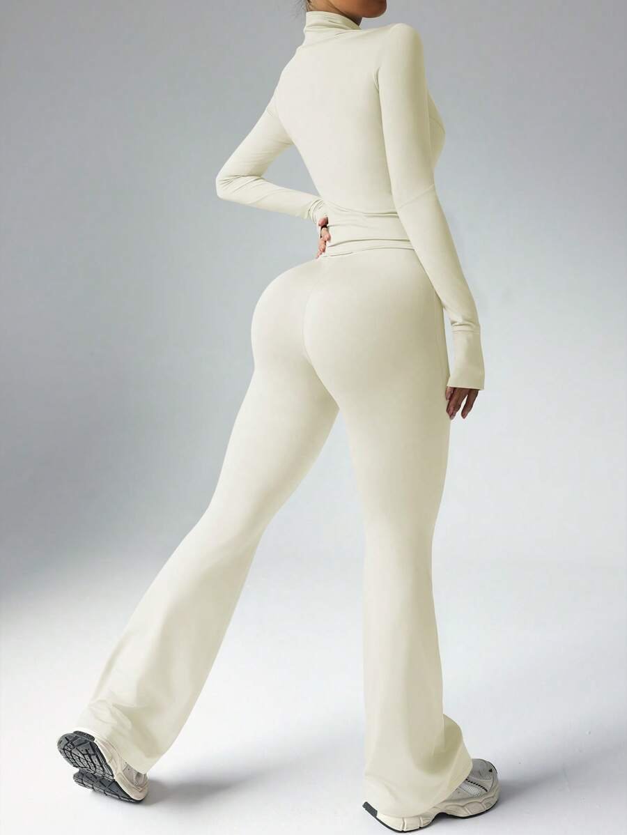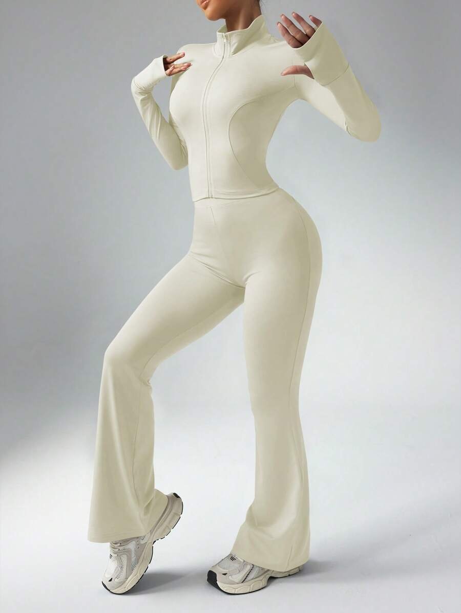 Dewbera Conjunto activo de mujer con top de manga larga de unicolor y pantalones de ajuste ceñido – Conjunto de entrenamiento de mujer – Conjunto de gimnasio para mujer