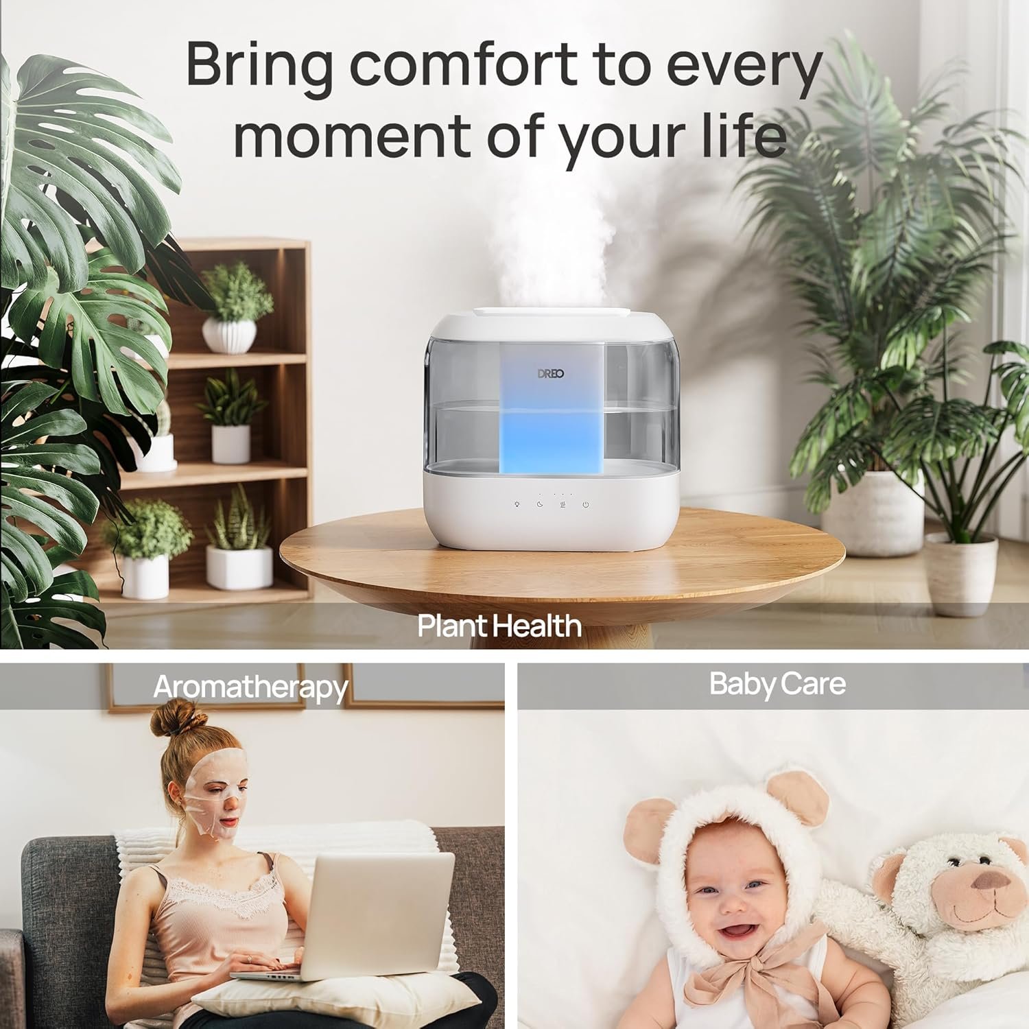 • Los humidificadores de niebla fría Dreo son compañeros perfectos para una vida más saludable, desde ayudarte a respirar más fácilmente, hasta hacer tus propias sesiones de aromaterapia hasta cambiar el estado de ánimo de tu habitación con su luz ambiental (aceites esenciales no incluidos).