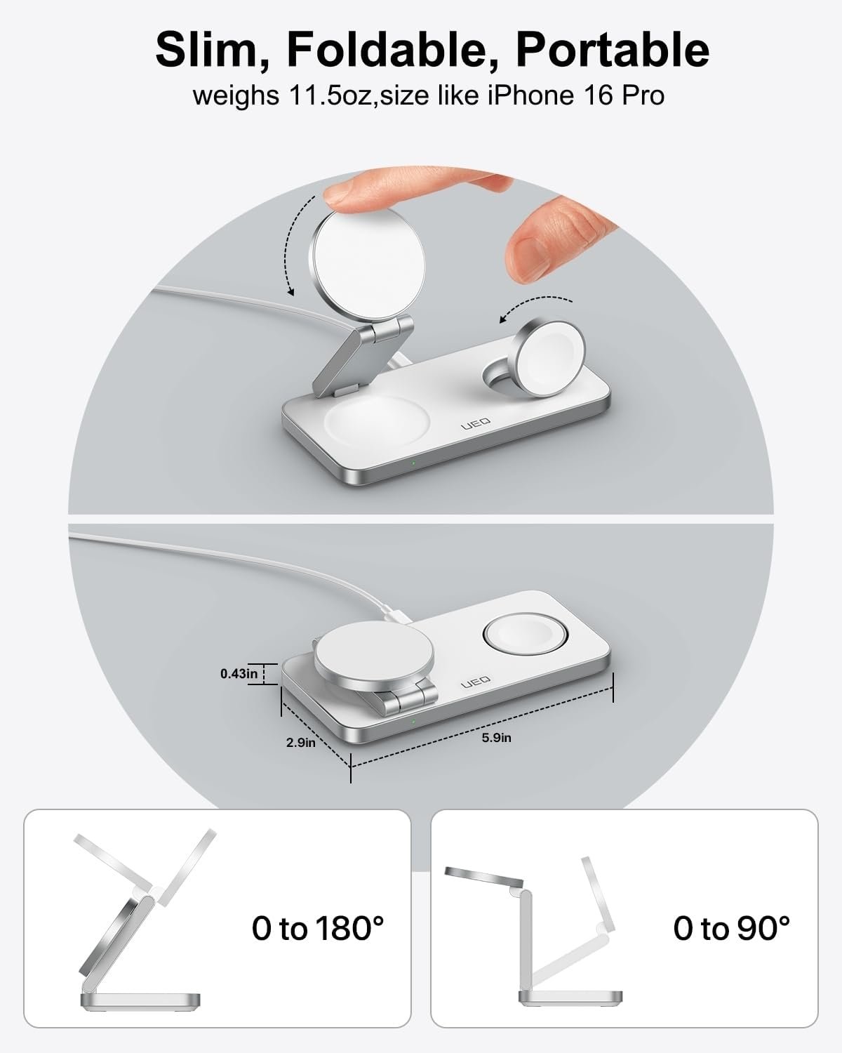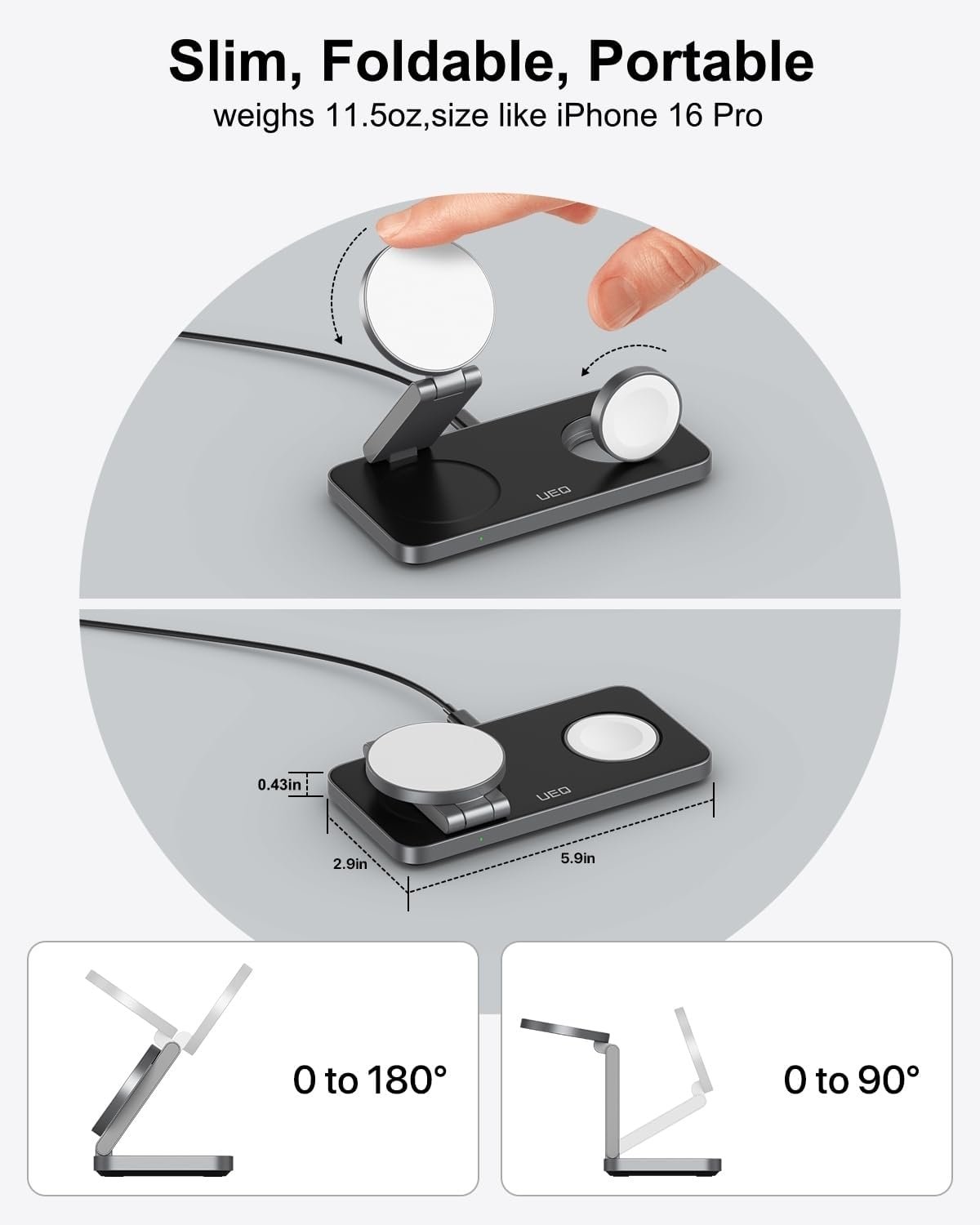 - Ajustable y ahorra espacio: con un diseño plegable, delgado y eficiente de espacio con módulos de carga de teléfono y reloj ajustables en ángulo, esta estación de carga segura te permite encontrar un mejor ángulo de visión. También el tamaño compacto de este cargador plegable lo hace perfecto como cargador de viaje. La base pesada y estable y la almohadilla inferior antideslizante garantizan que puedas quitar tu iPhone con una mano sin que se vuelque. El ingenioso diseño de estructura hace que no bloquee la cámara de tu iPhone mientras se carga.
