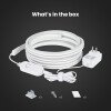 Revoluciona tu experiencia de TV y juego con la retroiluminación inteligente para TV con sensor de color de Feit Electric. Estas luces de cinta inteligente están optimizadas para pantallas de 55 a 85 pulgadas, envolviéndote en colores vibrantes y ambiente. Con su sensor de color ajustable, las luces de cinta coinciden con los colores en pantalla para extender la luz más allá de tu pantalla. Elija escenas predefinidas o experimente una experiencia visual sincronizada. Sincroniza las luces para transformar todo tu espacio en un espacio de entretenimiento reactivo para películas y juegos. Mejora las fiestas con espectáculos de luz épicos que coincidan con tu música usando Music Sync. El micrófono integrado significa que ni siquiera tienes que mantener la pantalla de tu teléfono encendida. La retroiluminación de TV inteligente capta cualquier sonido ambiental. Estas luces también sirven como iluminación sesgada, proporcionando un contraste equilibrado entre la pantalla y la iluminación ambiental. Di adiós a la fatiga ocular y disfruta de colores realistas que mejoran cada escena. A diferencia de otros complicados sistemas de iluminación para el hogar inteligente, configurar la retroiluminación de TV inteligente es sin esfuerzo. No se requiere concentrador ni calibración. Simplemente centre el sensor ajustable en la parte superior de su pantalla. Adhiere las luces a la parte posterior de su televisor con la parte trasera adhesiva y los clips de montaje, luego conéctalas. El sensor captura automáticamente los colores de la pantalla. Conéctate a la aplicación Feit Electric en tu Wi-Fi doméstico de 2.4 GHz y disfruta de efectos de iluminación inmersivos. Eleva tu experiencia de visualización de TV con estas elegantes luces de cinta inteligente de vanguardia.