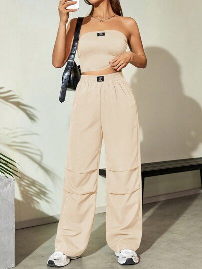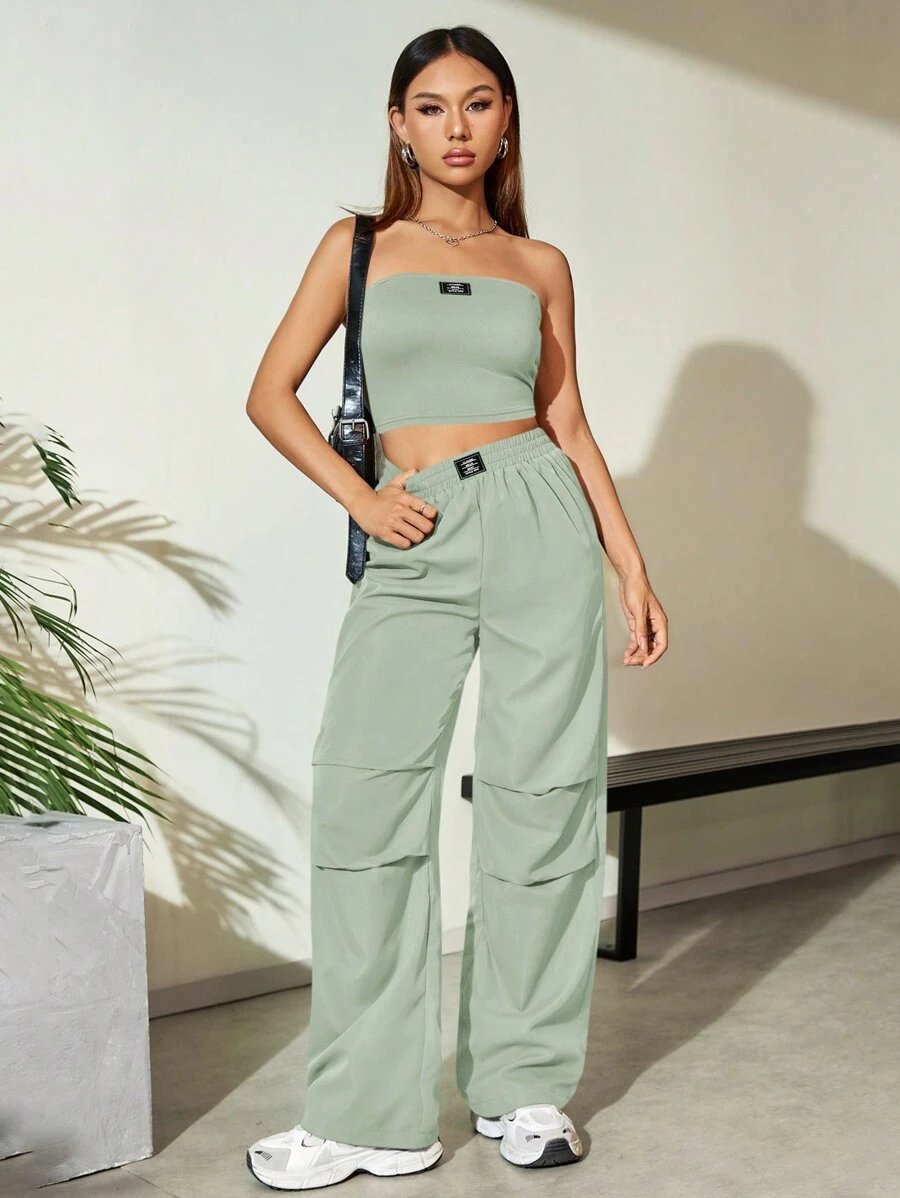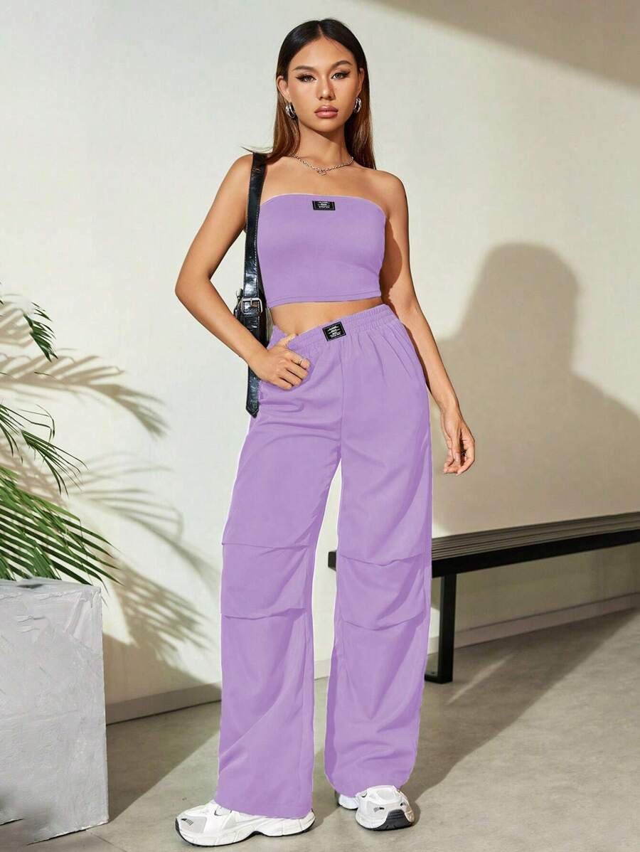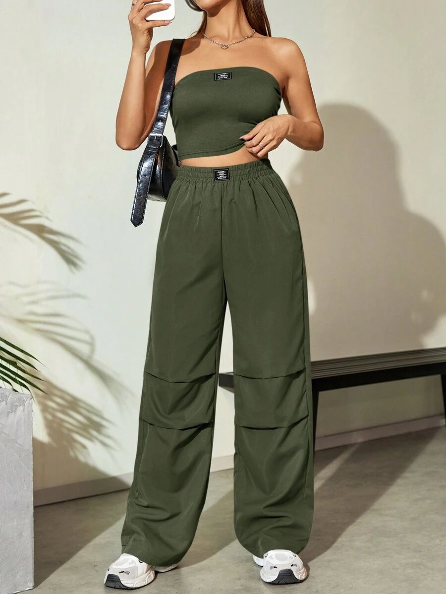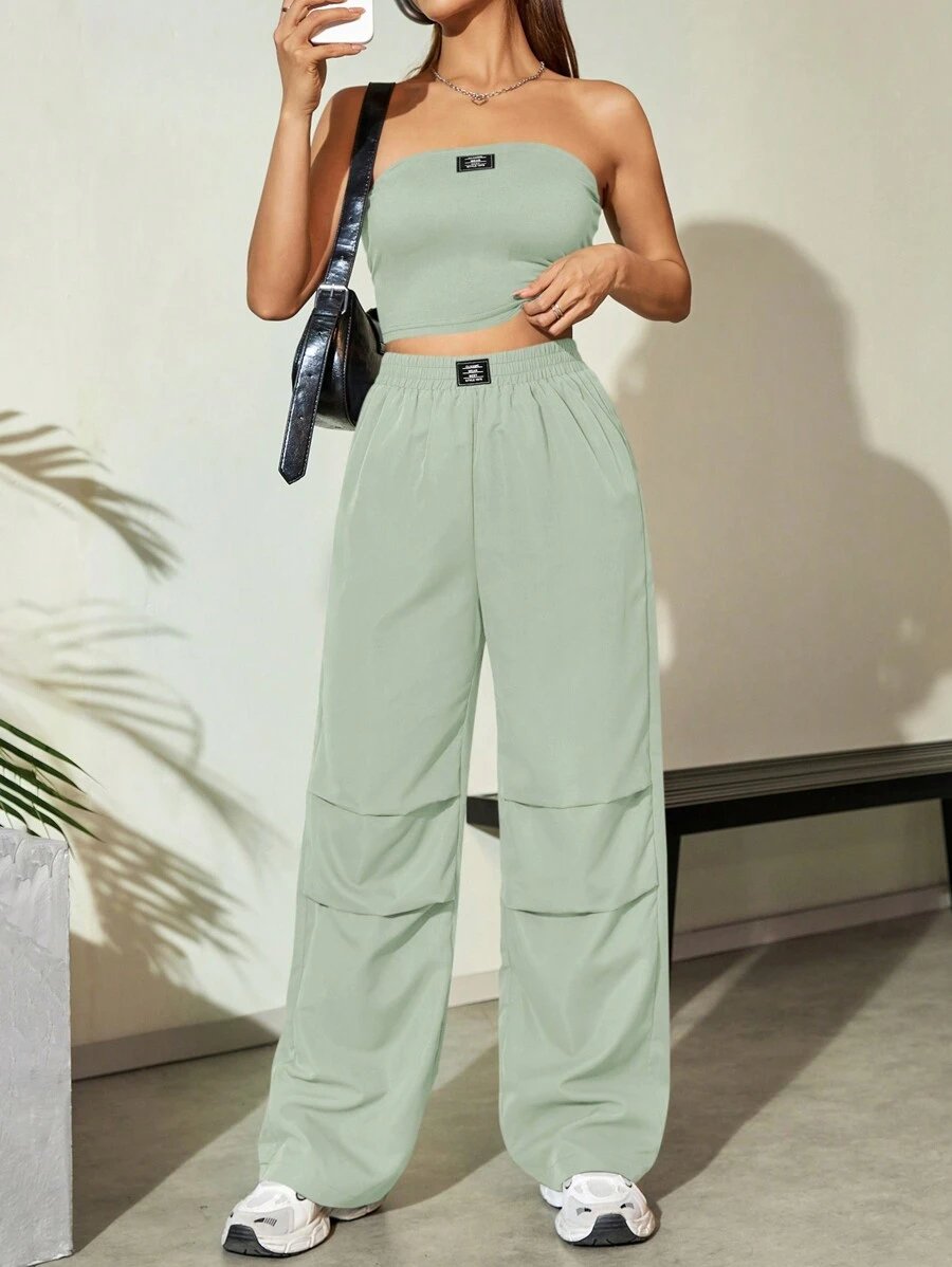 Flirla Conjunto para mujer de 2 piezas suelto y casual de verano: top corto bustier con estampado de letra y pantalones plisados de pierna ancha
