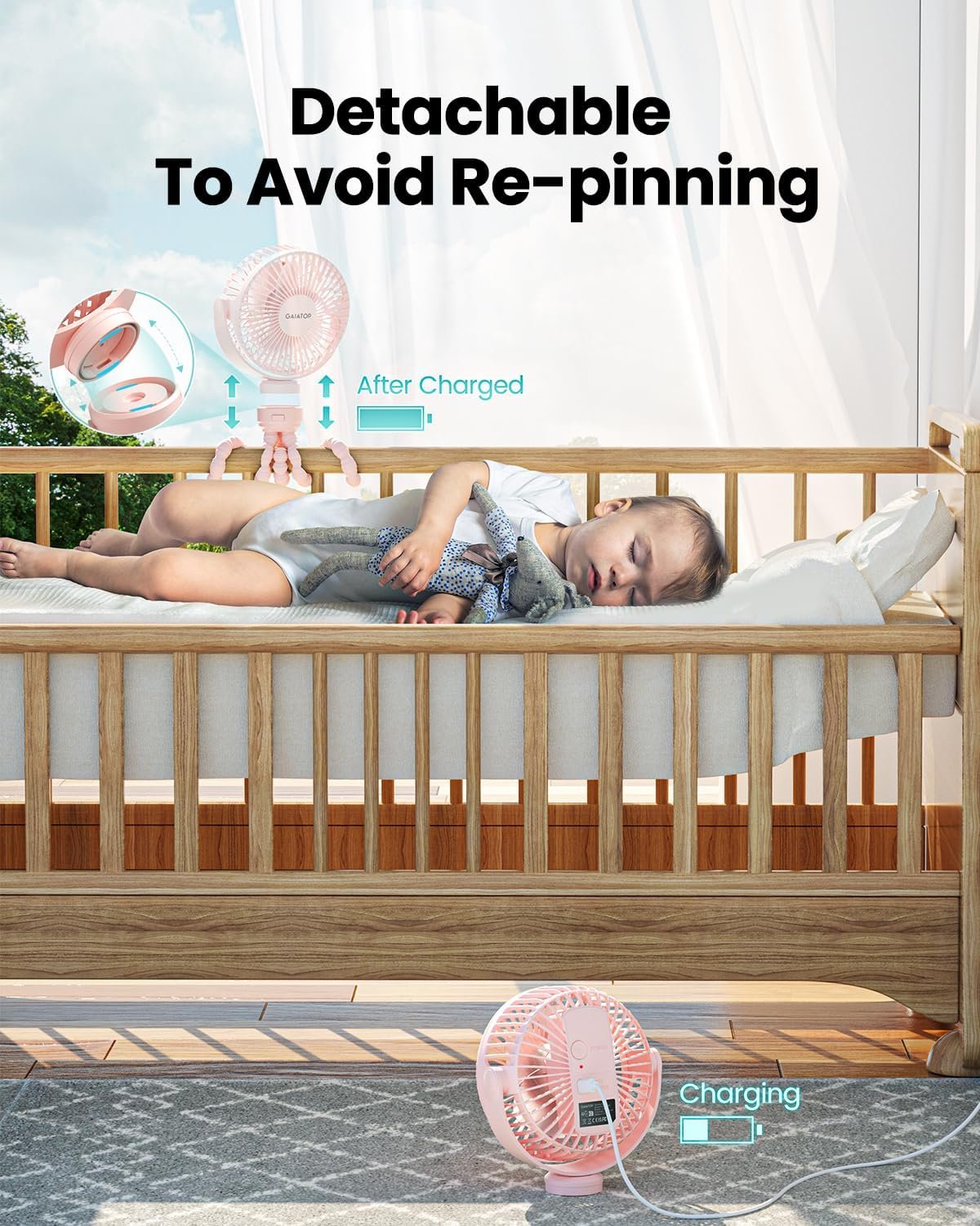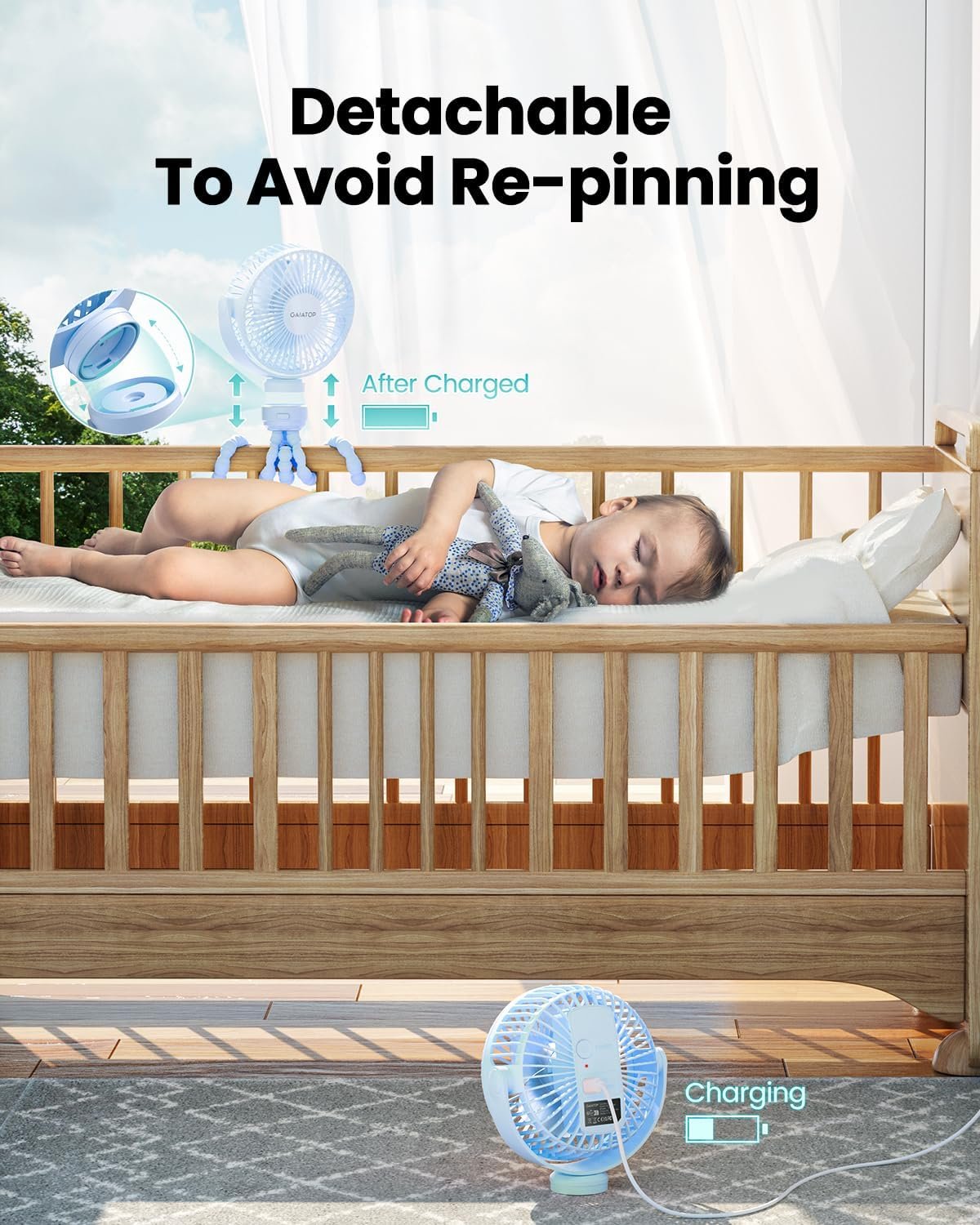 - Trípode flexible y duradero mejorado: carcasa hecha de silicona de grado alimenticio, seguro para el bebé; optimizado el método de fijación del trípode, que es más duradero y no se cae fácilmente; puede quitar la cabeza del ventilador para cargar a voluntad, sin necesidad de fijación repetida