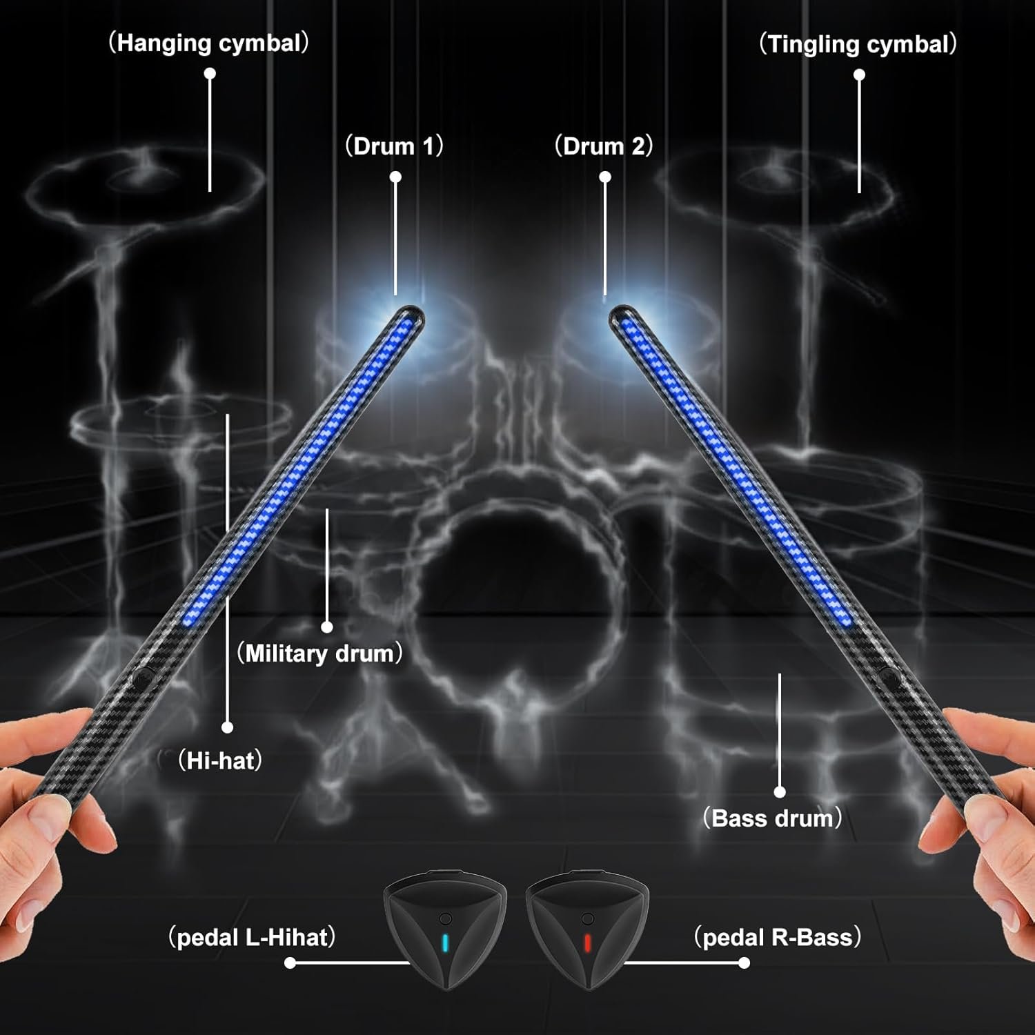 - Tambor de aire divertido e inmersivo: diseñado con luces ambientales RGB, las baquetas de aire añaden un factor lúdico e inmersivo a tu interpretación musical. Al mismo tiempo, nuestros altavoces y baquetas se combinan para reproducir varios colores, siguiendo el ritmo de la percusión musical. Las luces vibrantes mejoran la experiencia general y crean un ambiente visual. Y nuestras baquetas virtuales tienen retroalimentación de vibración para una gran sensación