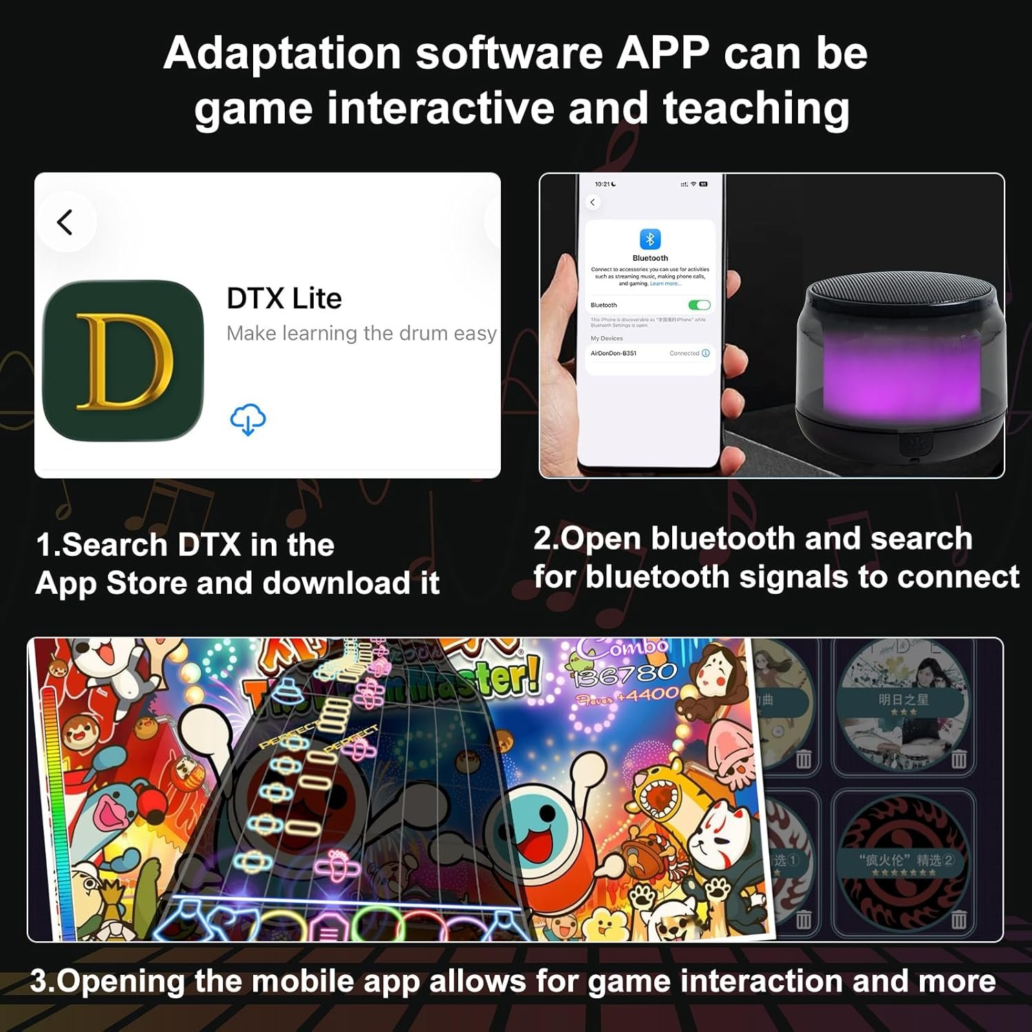 - [Adaptación de la APP exclusiva]: Busca DTX en la App Store y descárgala. 0pen bluetooth y busca señales bluetooth para conectar. 0pening la aplicación móvil permite la interacción del juego y más. Incluye un modo de enseñanza con un gran número de canciones y se actualiza constantemente