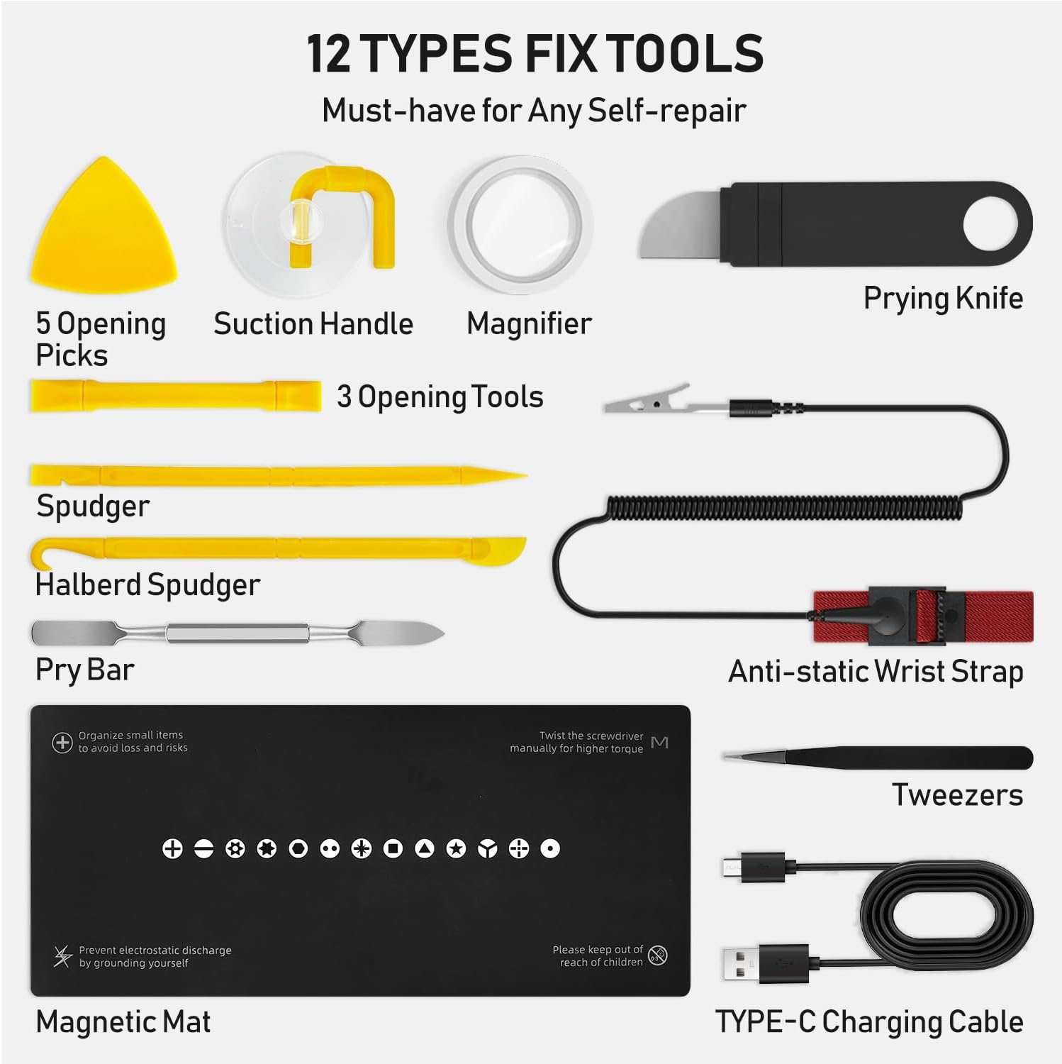 • Contenido del juego de destornilladores de precisión: 1 destornillador eléctrico, 1 cable de carga tipo C, 1 desmagnetizador/área magnetizada, 42 puntas de destornillador (destornillador LTT, juego de destornilladores hexagonales, destornillador P5 pentalobe), 1 lupa, 1 ventosa, 4 barras de palanca de plástico, 1 destornillador de metal, 1 puntiagudo. Destornillador, 1 x Escobilla curva, 1 x pinzas curvas, 1 x púas de extremo abierto, 1 x escobilla de metal, 1 x pinzas, 5 x cuchillas de acoplamiento, 1 x almohadillas magnéticas, 1 x pulsera estática, 1 x manual de instrucciones (idioma español no garantizado), destornillador múltiple