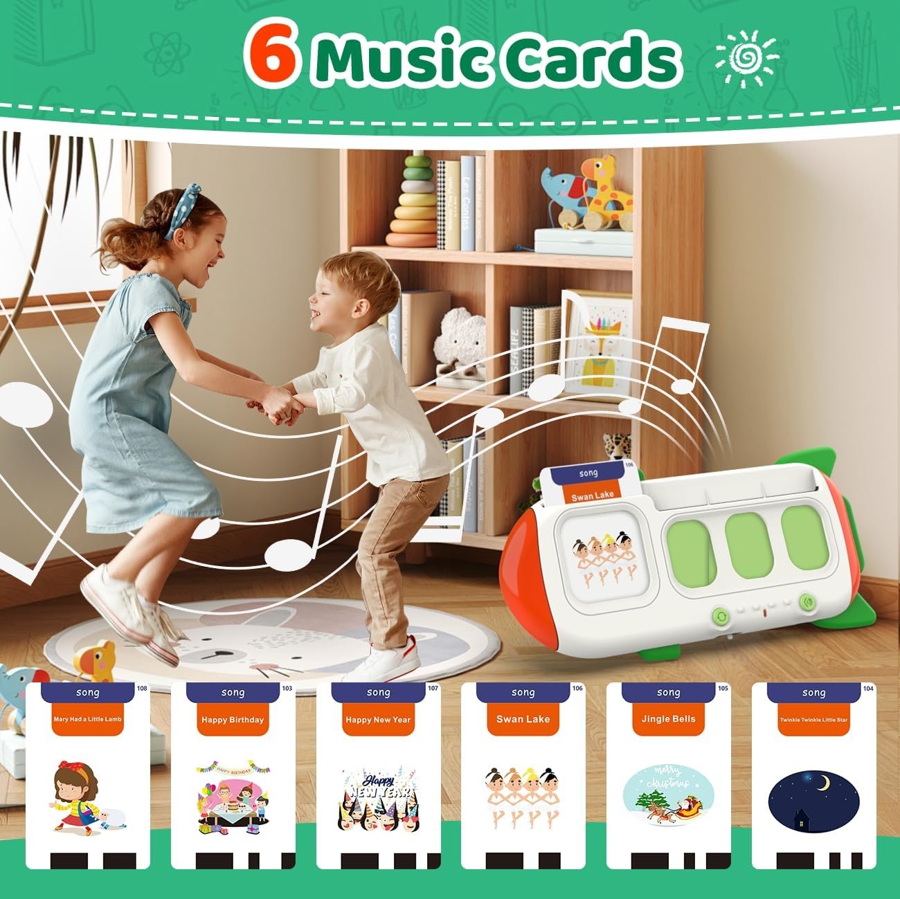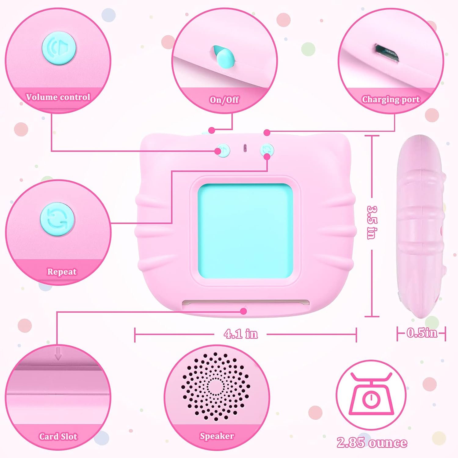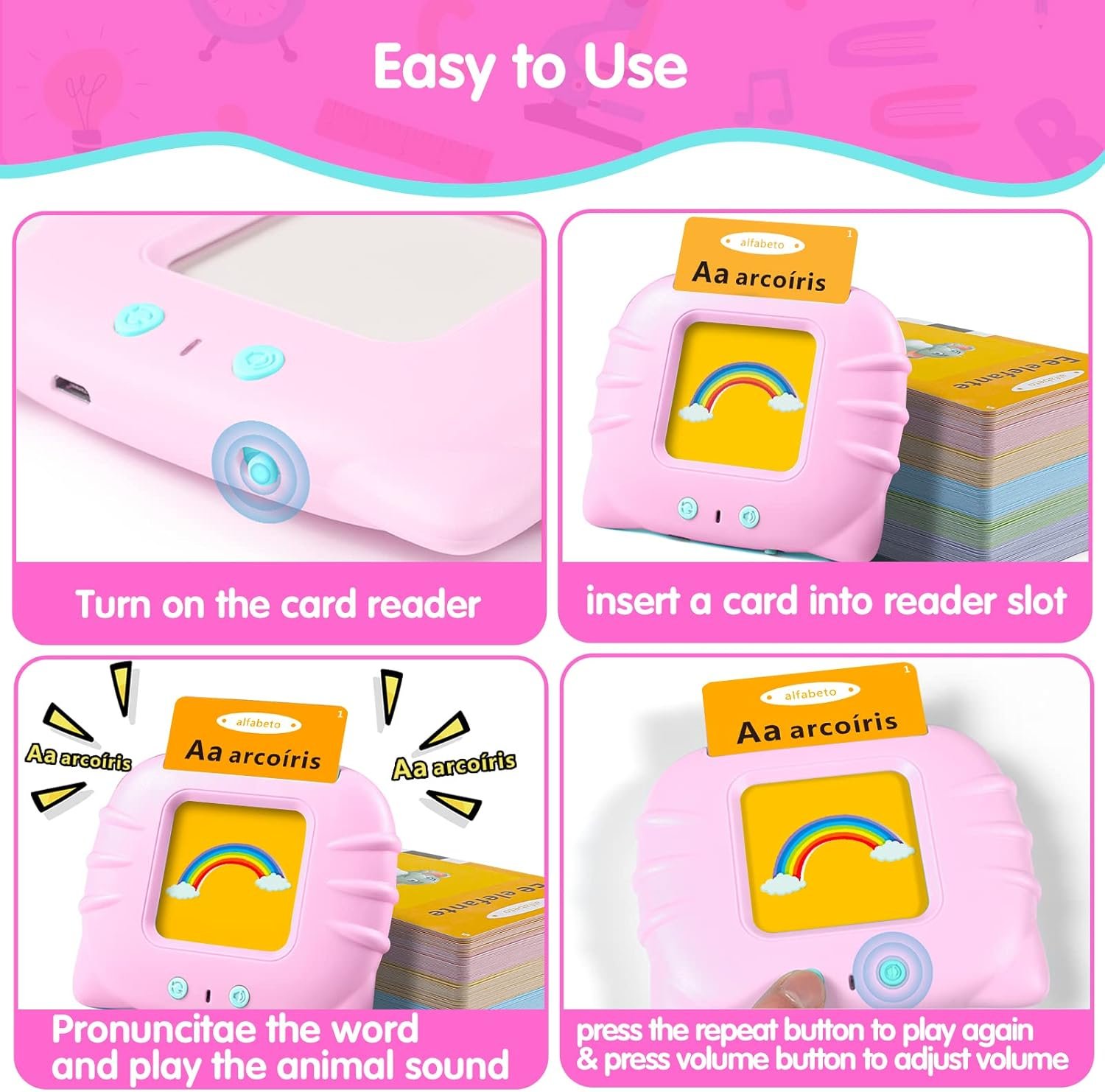 - Recargable y ligero: el juguete para niños pequeños viene con batería recargable integrada y se puede utilizar hasta 4.5 horas, sin necesidad de cargarlo con frecuencia. El lector de tarjetas pesa 2.50 oz y la dimensión es de 4 x 3.5 x 0.5 pulgadas, fácil de sostener para los niños. El volumen es ajustable. Se proporciona una bolsa portátil para un fácil almacenamiento de las tarjetas y el lector de tarjetas