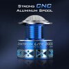 El carrete giratorio Verano/Centron tiene un carrete de aluminio mecanizado CNC más ligero y más fuerte que tiene una línea más uniforme, ranuras internas para retención de lubricante y más capacidad de línea de pesca.