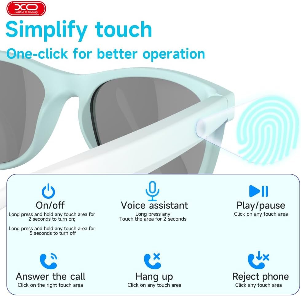 - Lentes de sol inteligentes Bluetooth: los lentes de sol Bluetooth XO cuentan con lentes de protección completa UV400 que protegen tus ojos con un color, claridad y contraste excepcionales. Las gafas de sol de audio Bluetooth inteligentes también tienen un sistema de altavoces que te permite escuchar tu música favorita y todo lo que te rodea. Los micrófonos HD proporcionan sonido de alta calidad durante las llamadas.