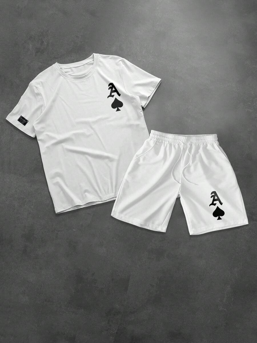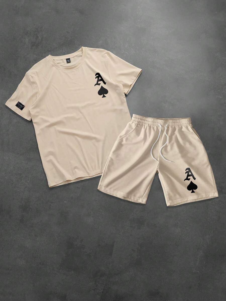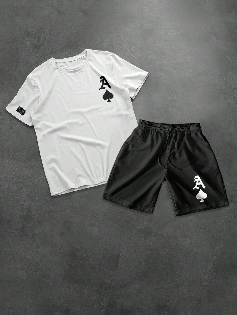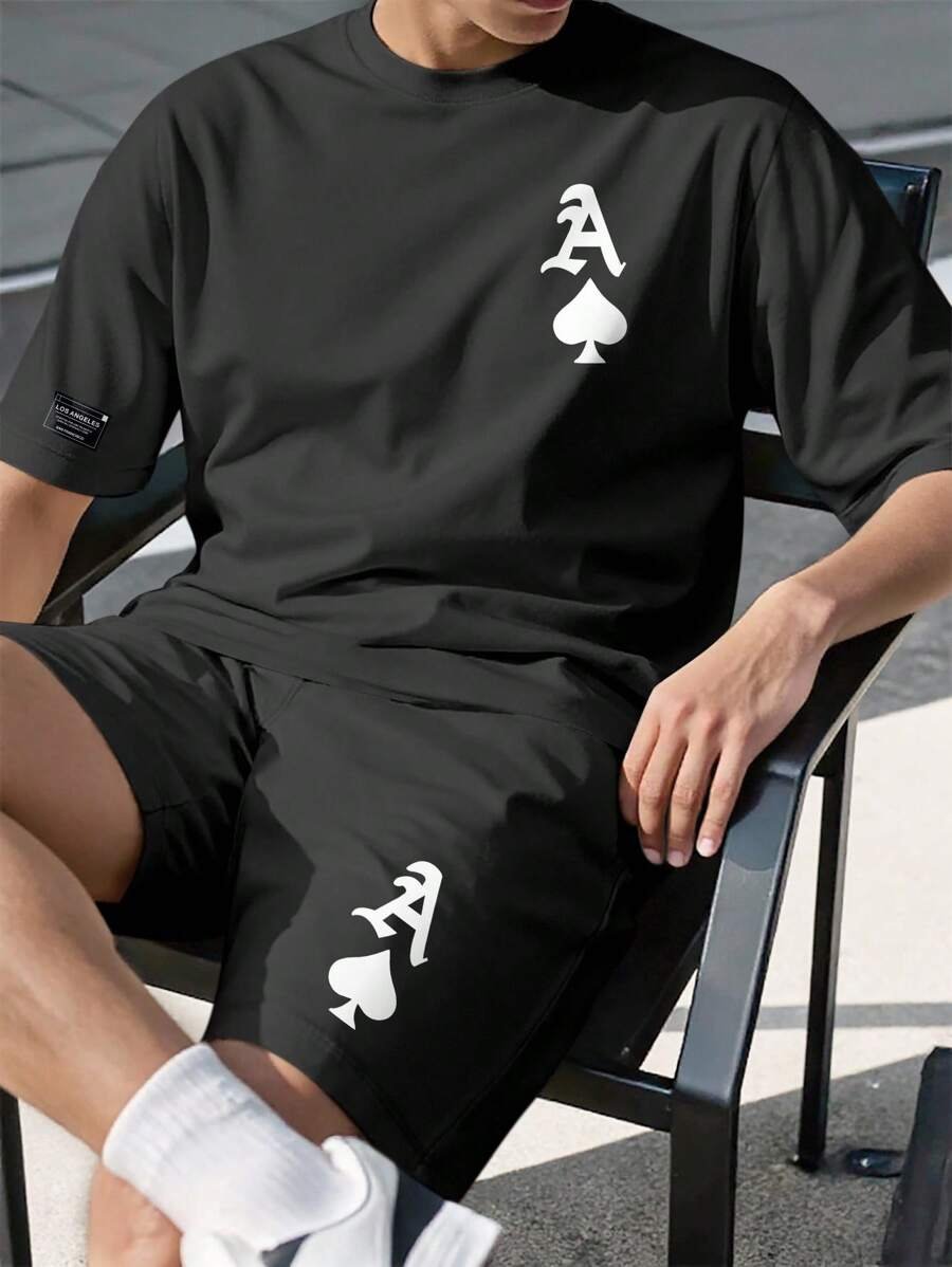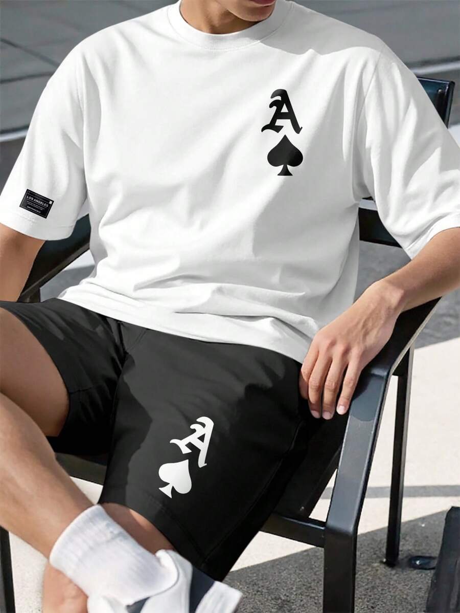 Manfinity Homme Conjunto de 2 piezas para hombres con camiseta de manga corta de cuello redondo con estampado de naipes y pantalones cortos con cordón en la cintura