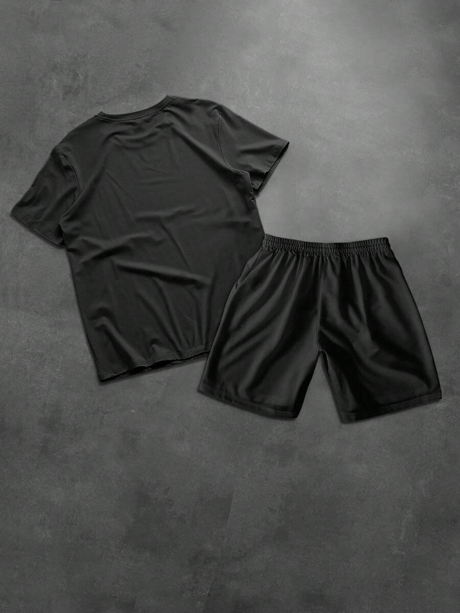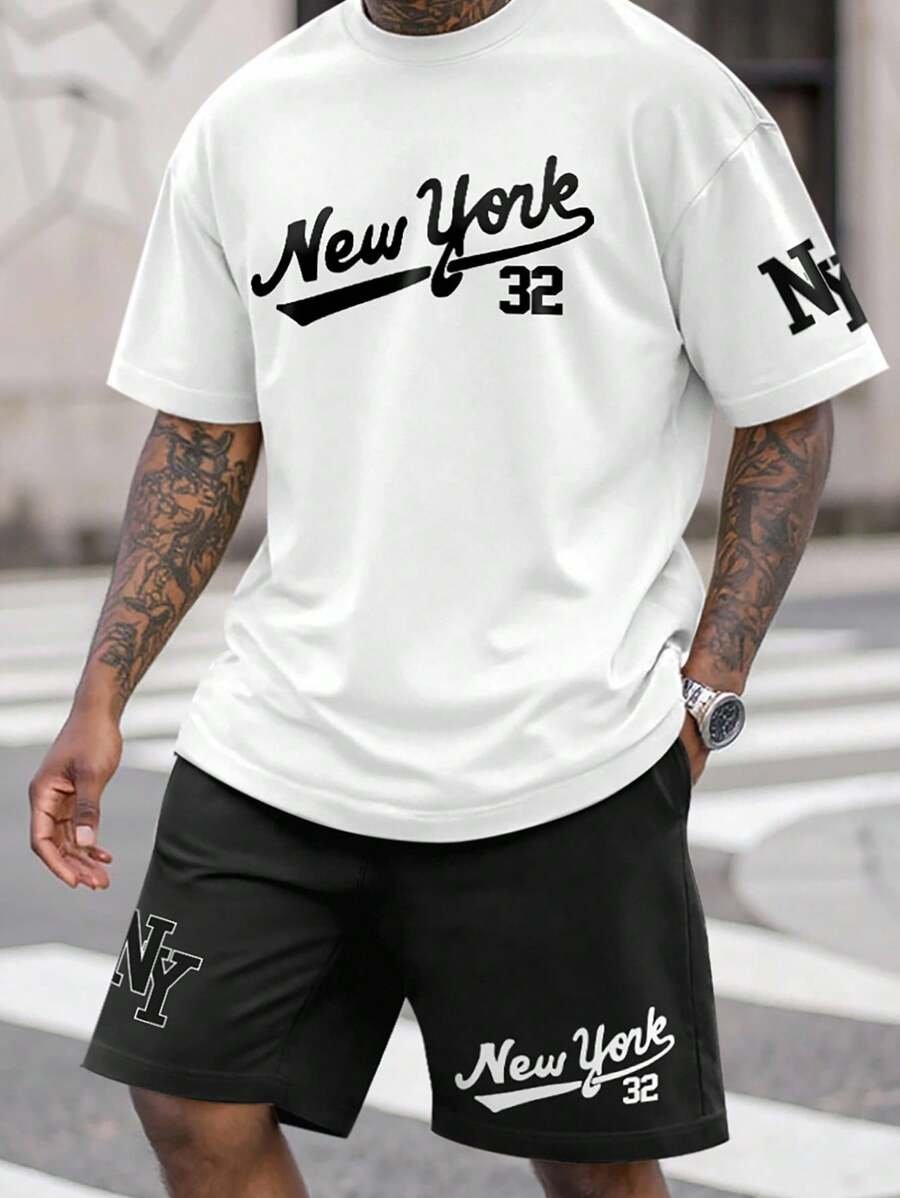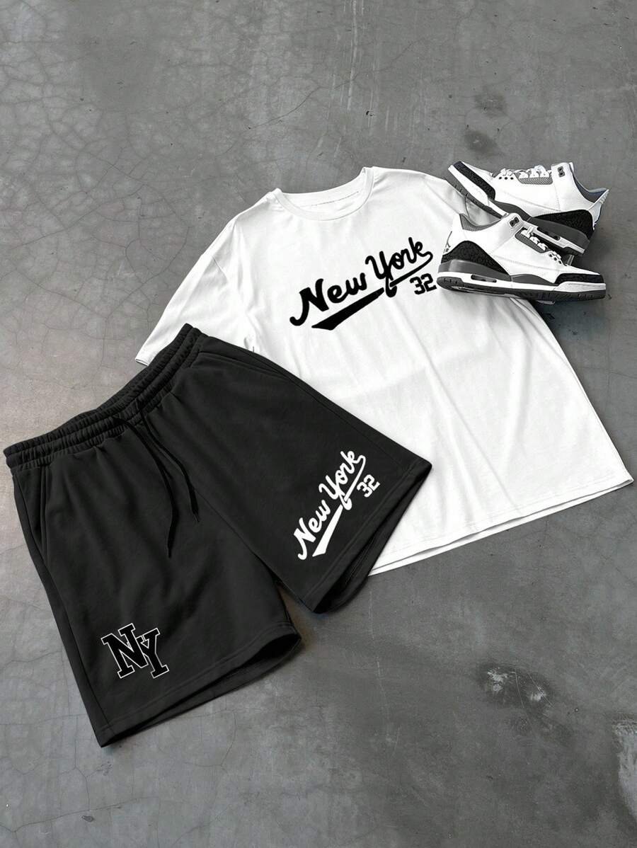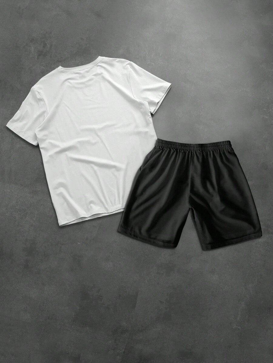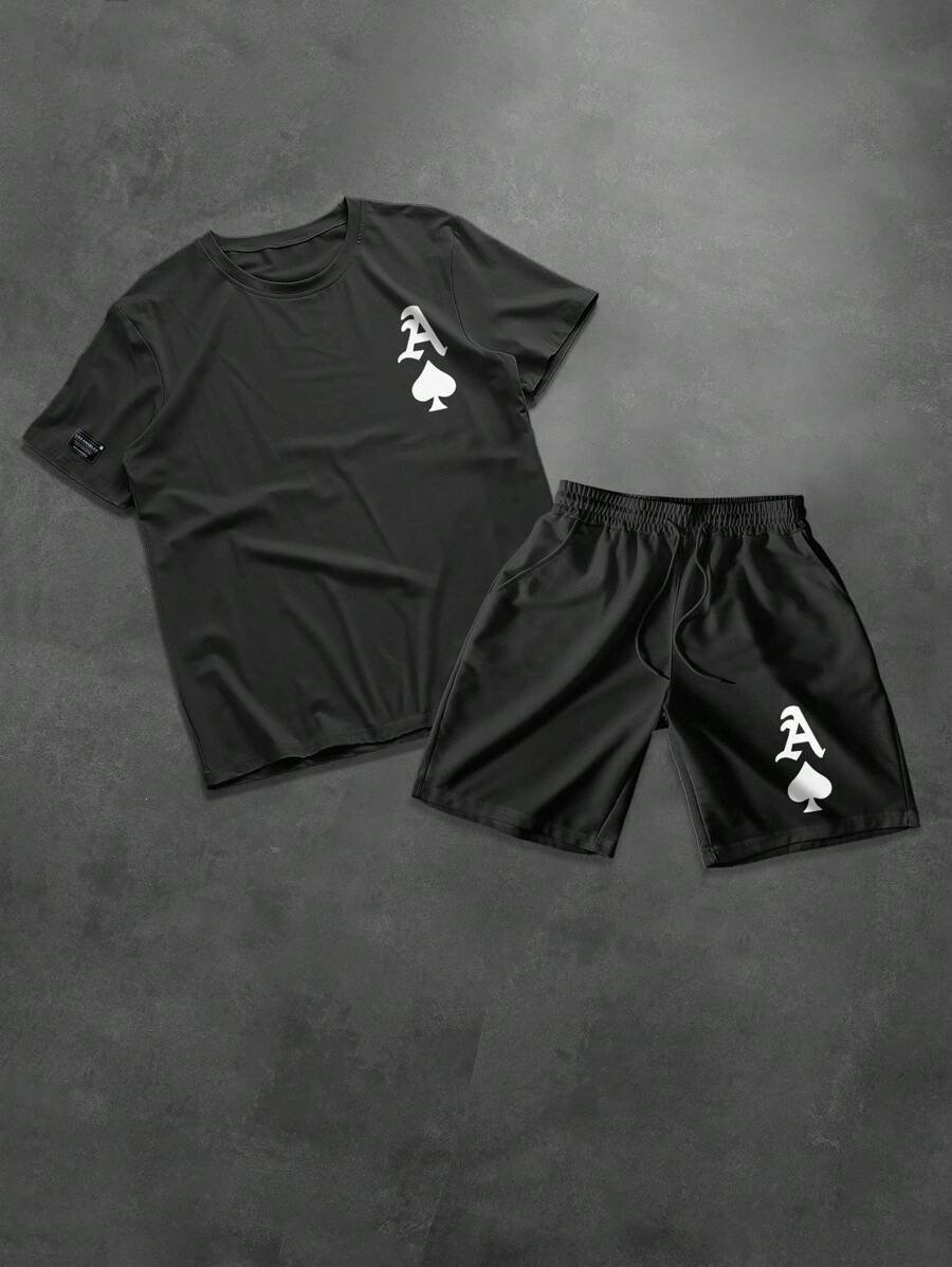 Manfinity Homme Conjunto de 2 piezas para hombres con camiseta de manga corta de cuello redondo con estampado de naipes y pantalones cortos con cordón en la cintura