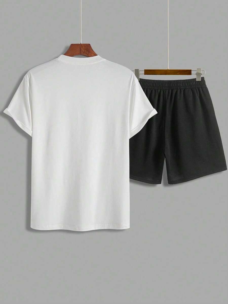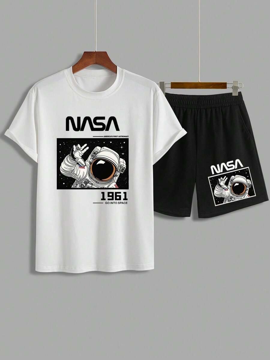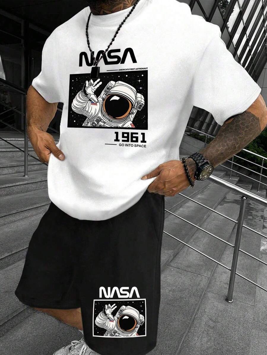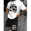 Manfinity Homme Conjunto de camiseta casual de manga corta con cuello redondo estampado con letras de astronauta y shorts para hombre para el verano