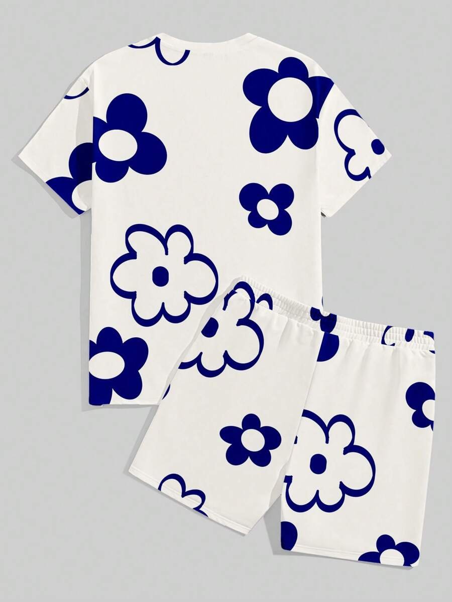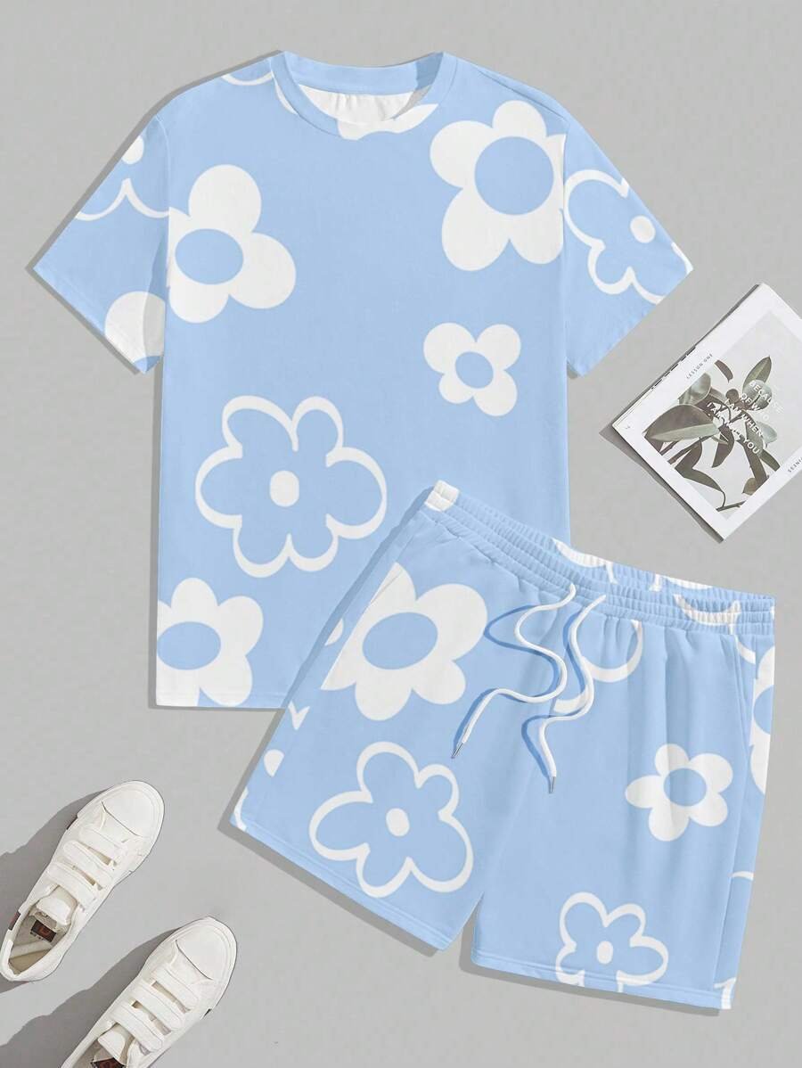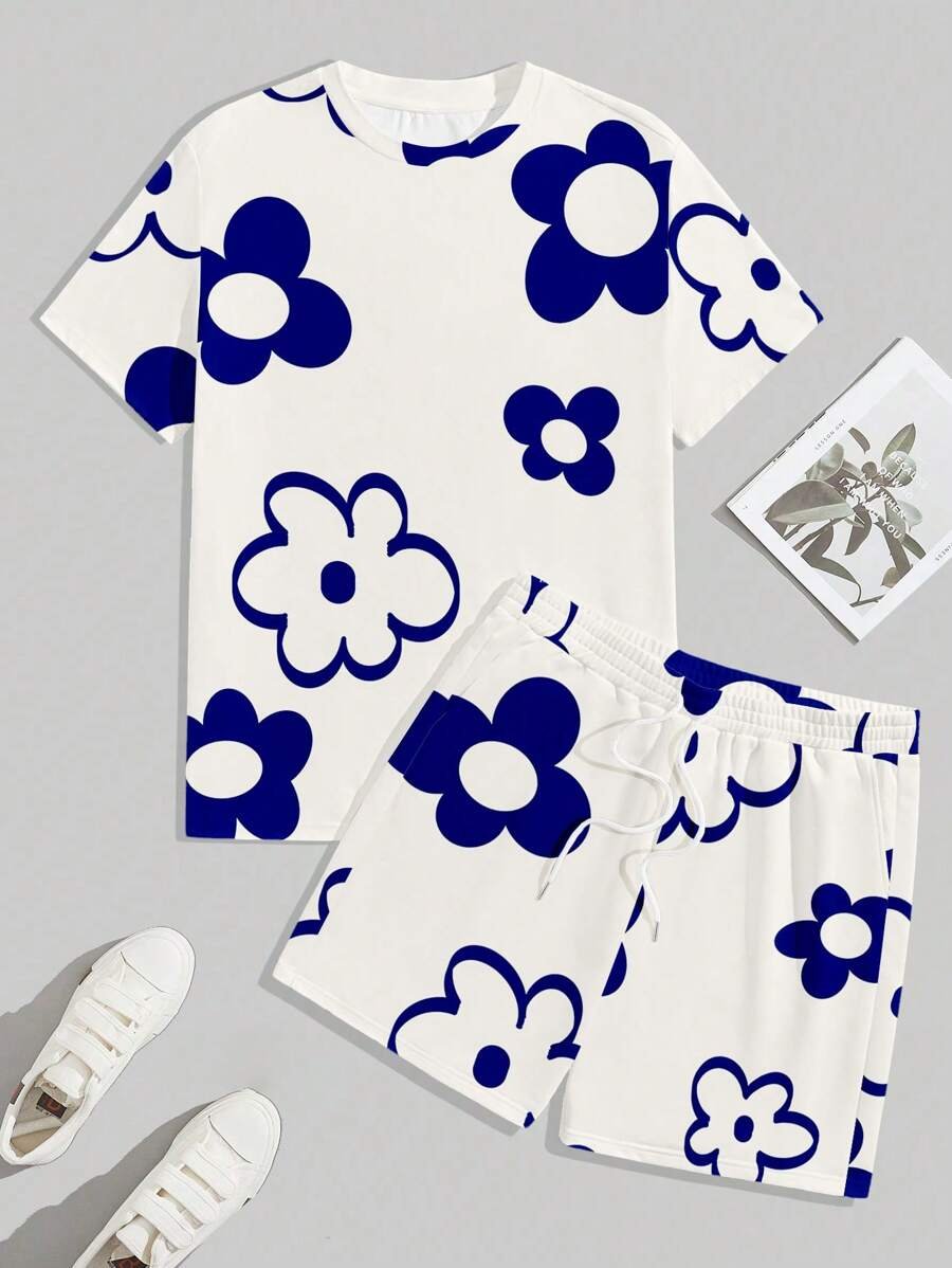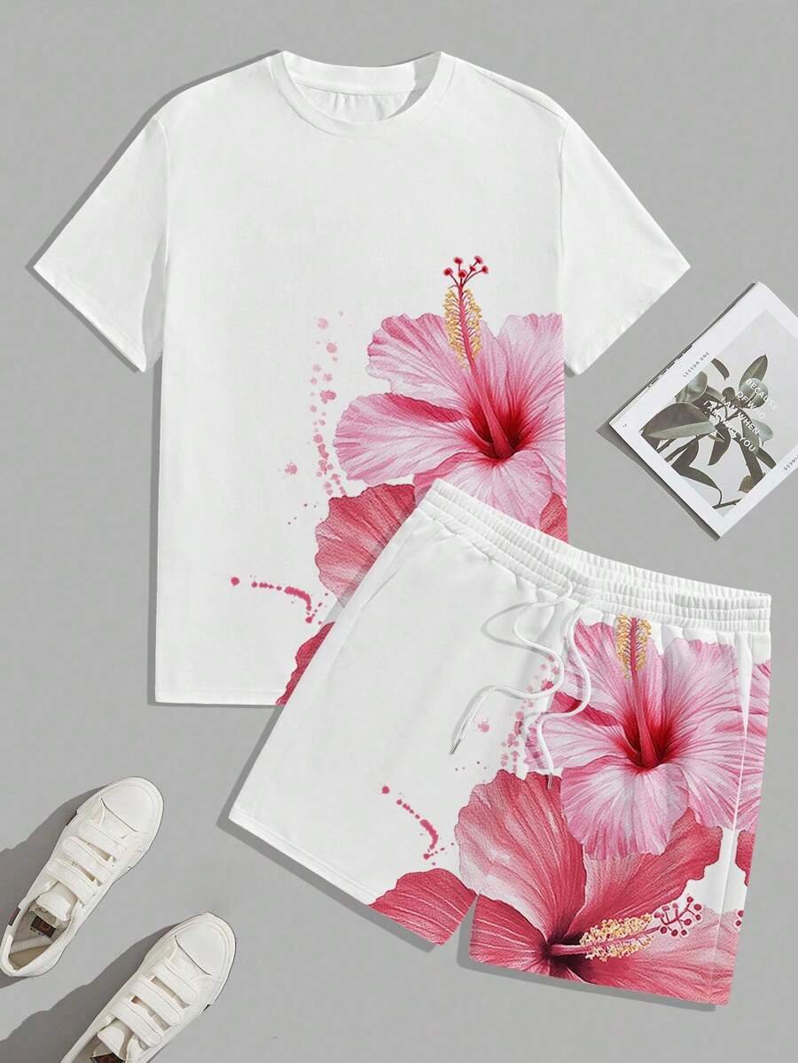 Manfinity Homme Set de 2 piezas de camiseta de manga corta casual y pantalones cortos holgados para hombres, conjunto de pantalones cortos de 2 piezas con flores, atuendos cómodos