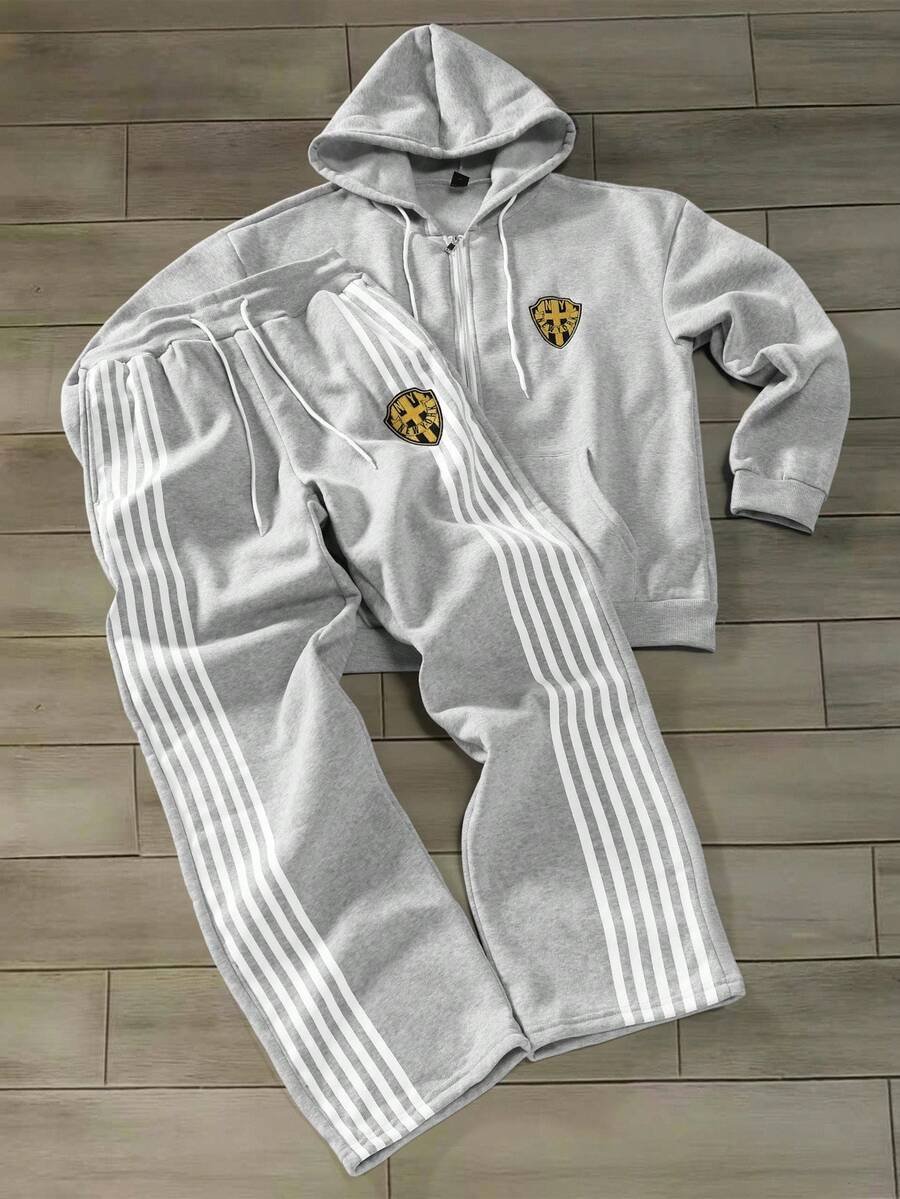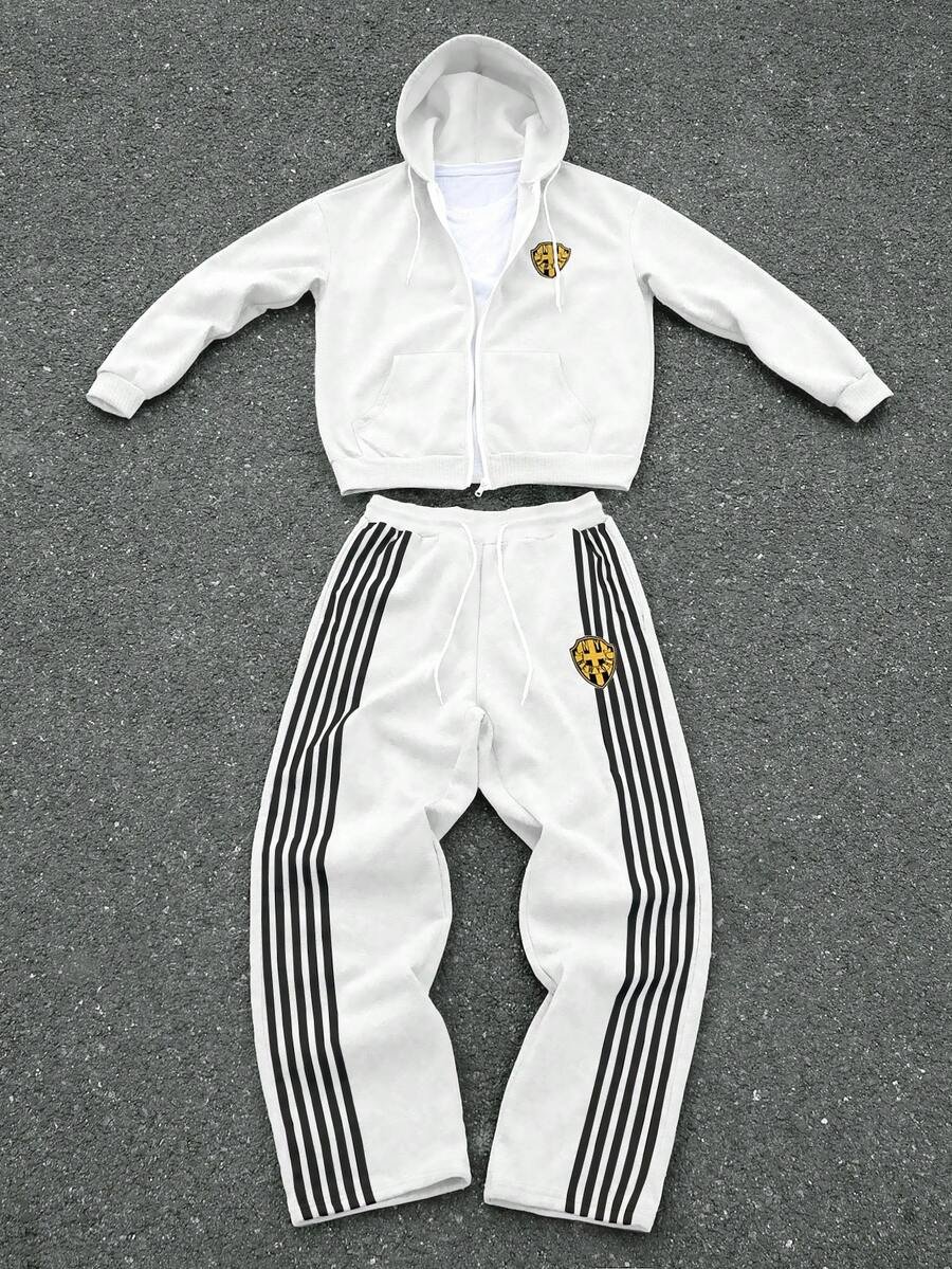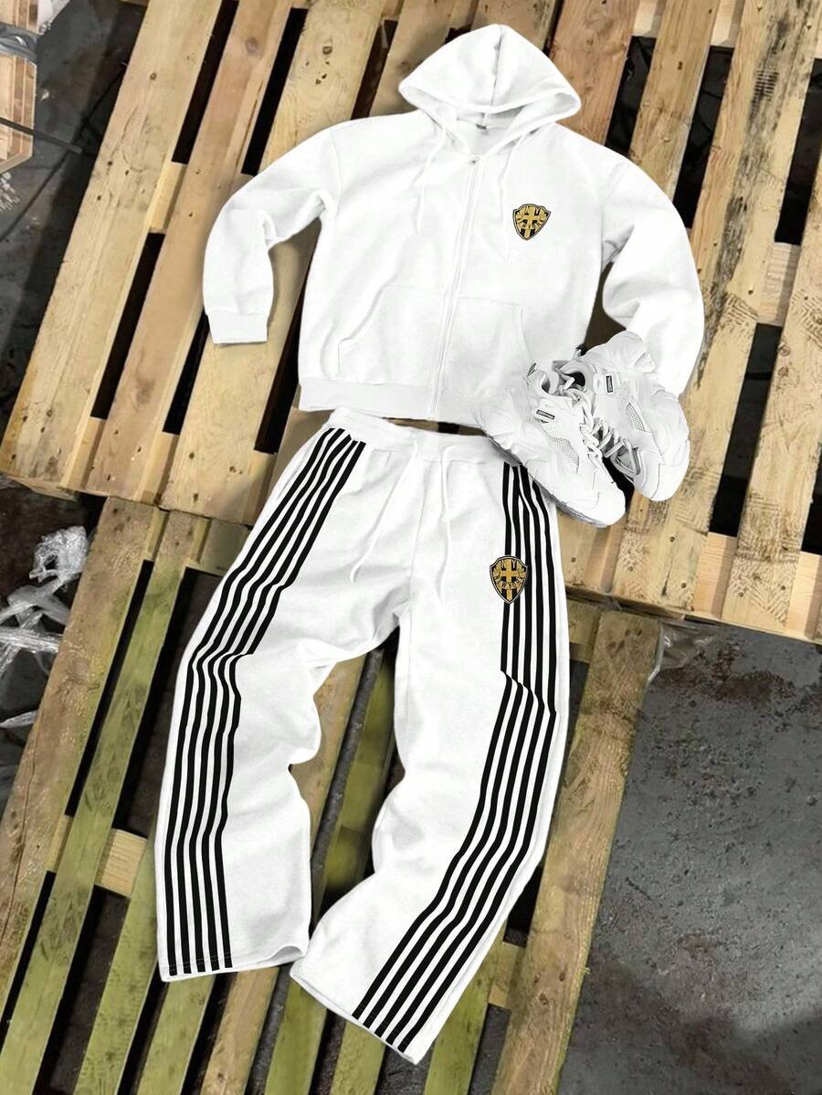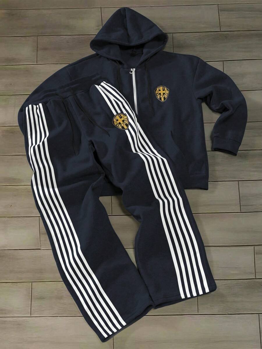 Manfinity Sporsity Conjunto de sudadera con capucha con cremallera delantera y pantalón de chándal a rayas para hombre, ropa de otoño e invierno