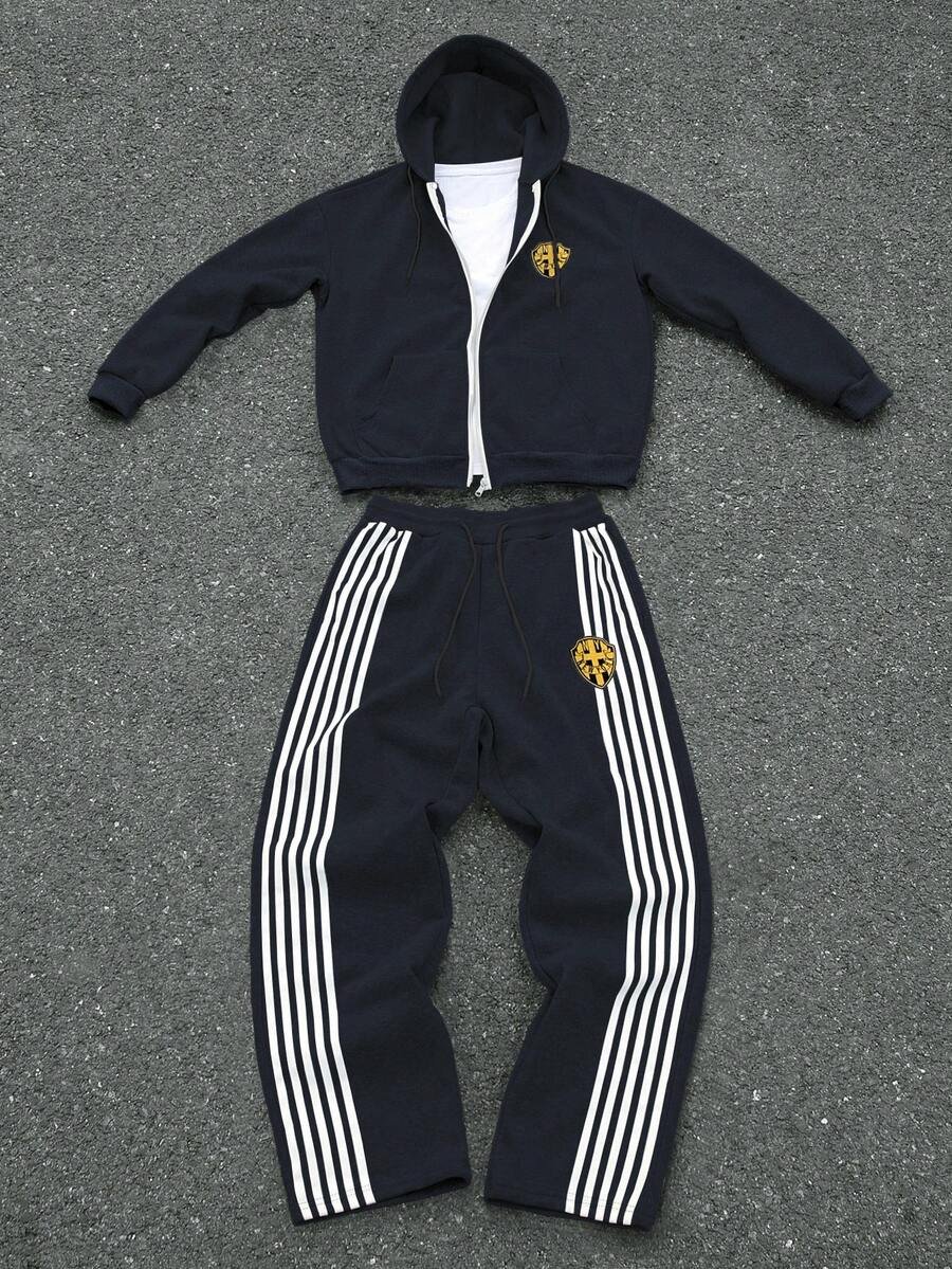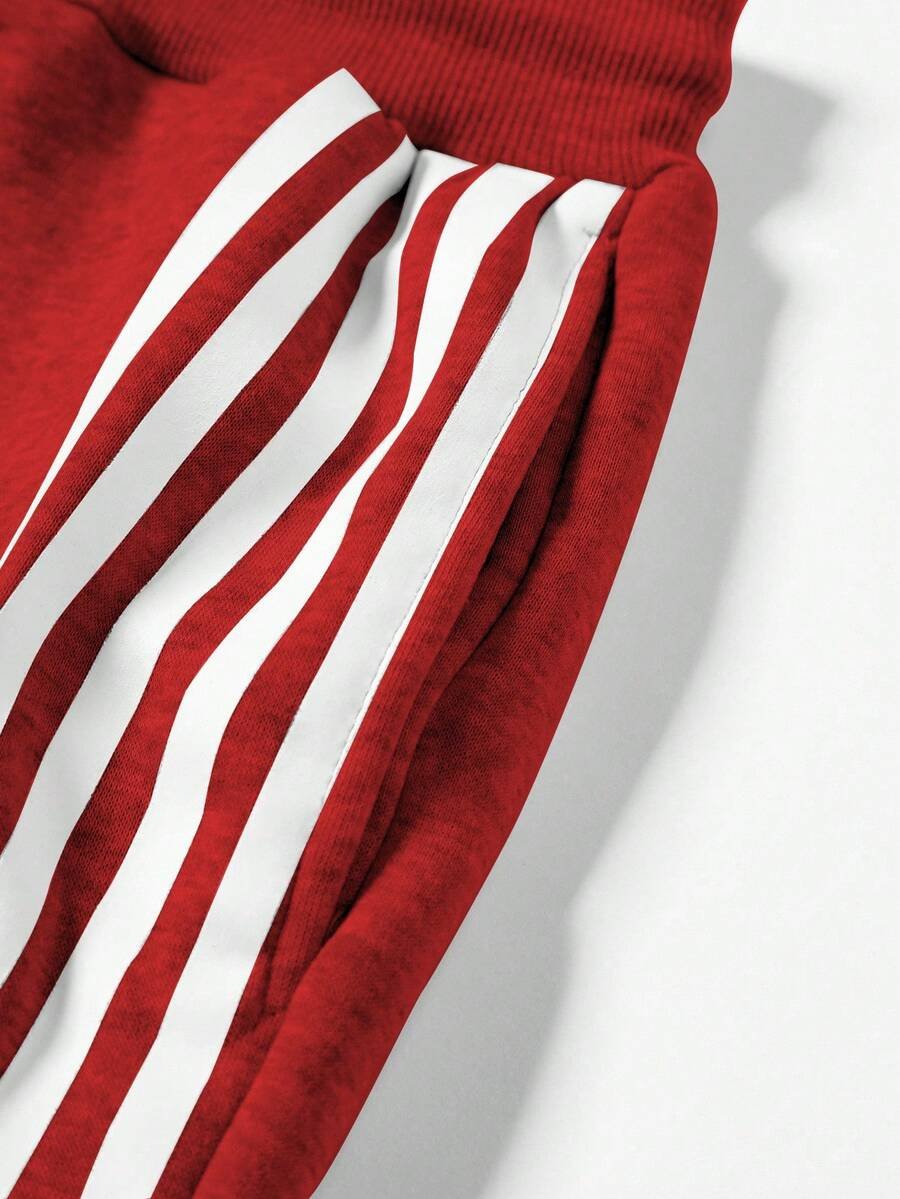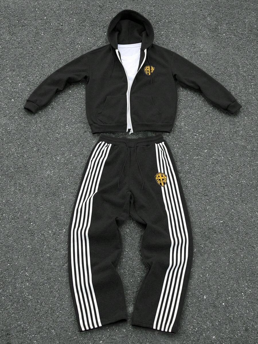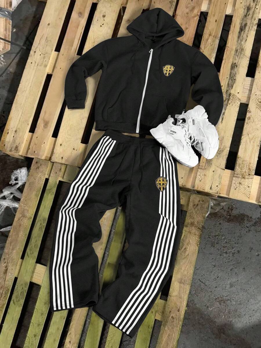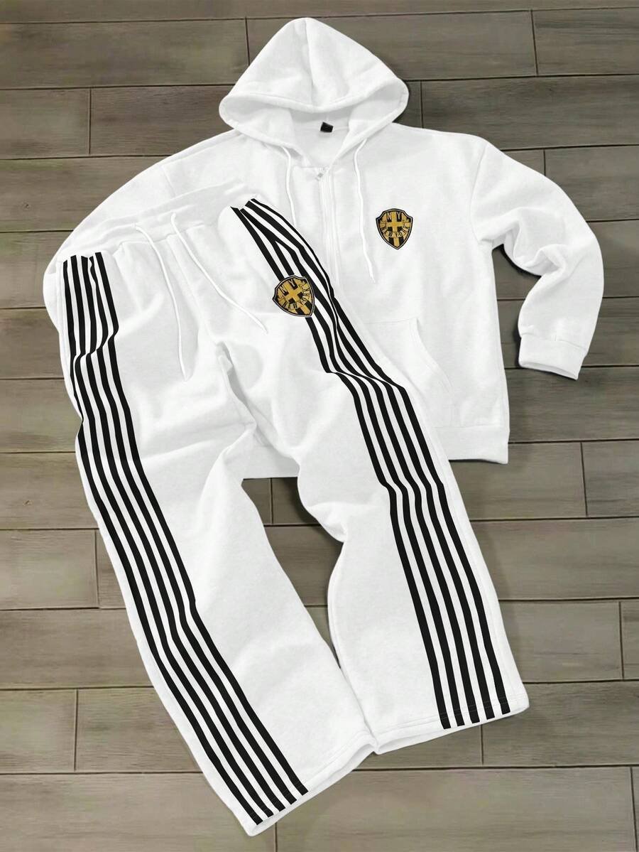 Manfinity Sporsity Conjunto de sudadera con capucha con cremallera delantera y pantalón de chándal a rayas para hombre, ropa de otoño e invierno