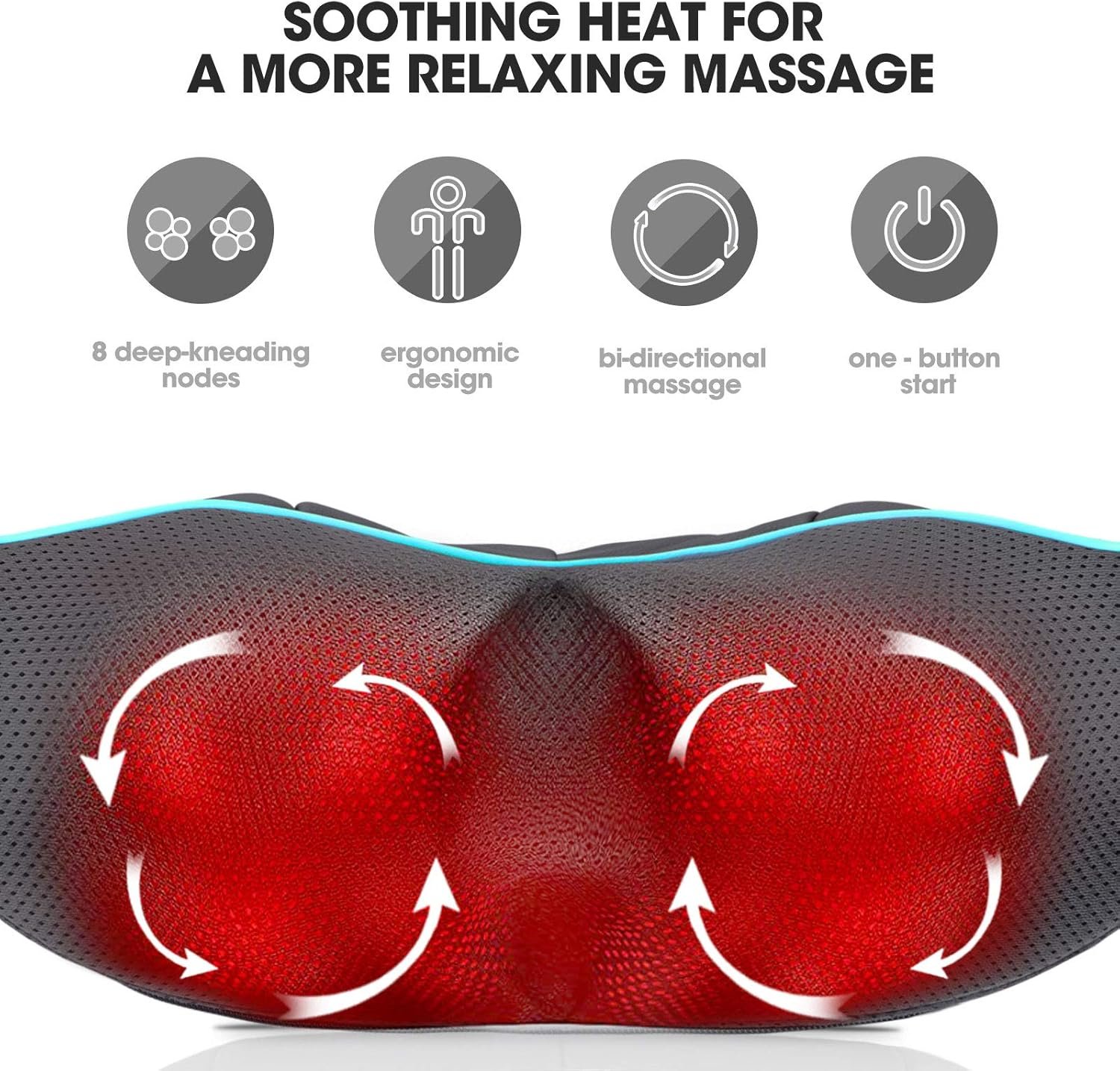 - Increíble masajeador relajante: explora la naturaleza multiusos de nuestra almohada masajeadora shiatsu hoy. ¡Hace milagros en todo tu cuerpo de la cabeza a los pies! Perfecto para oficina, vehículo y hogar. Incluye un adaptador de corriente alterna de 6 pies que garantiza el máximo uso ya sea en casa o en la oficina. ¡Disfruta de un masaje corporal completo y estimulante en la comodidad de tu sala de estar! El masajeador también incluye un adaptador de coche gratis para que puedas disfrutar de un masaje rejuvenecedor incluso sobre la marcha con nuestra almohada de masaje