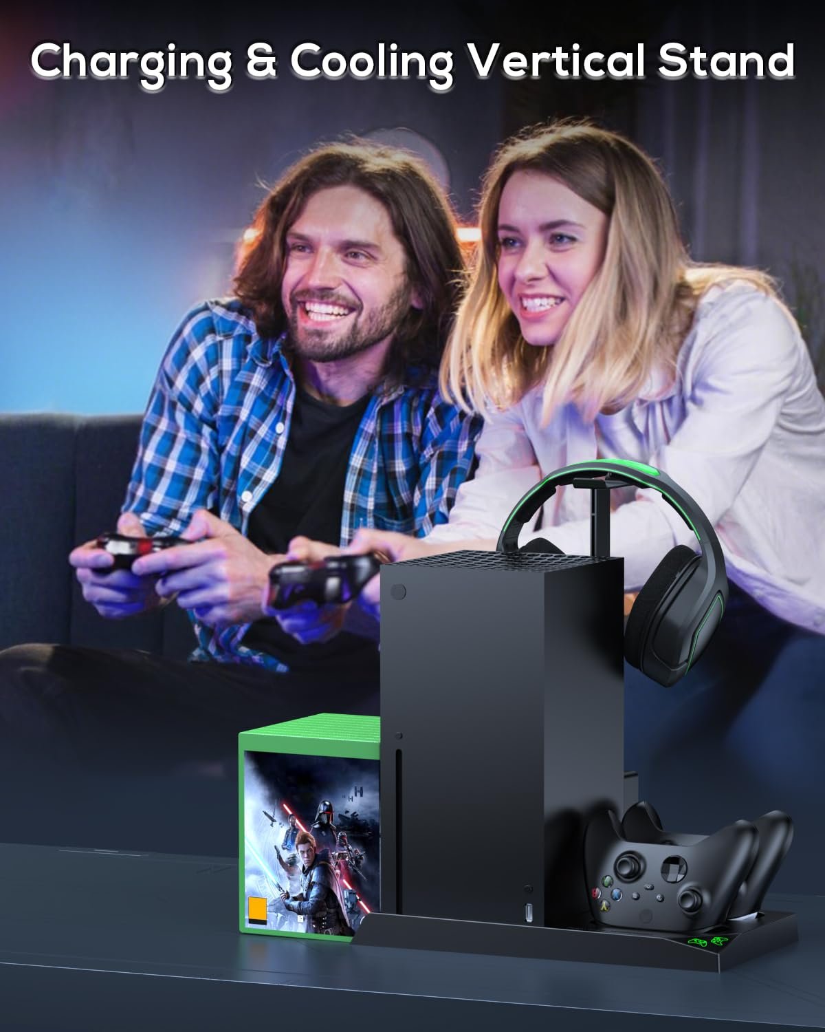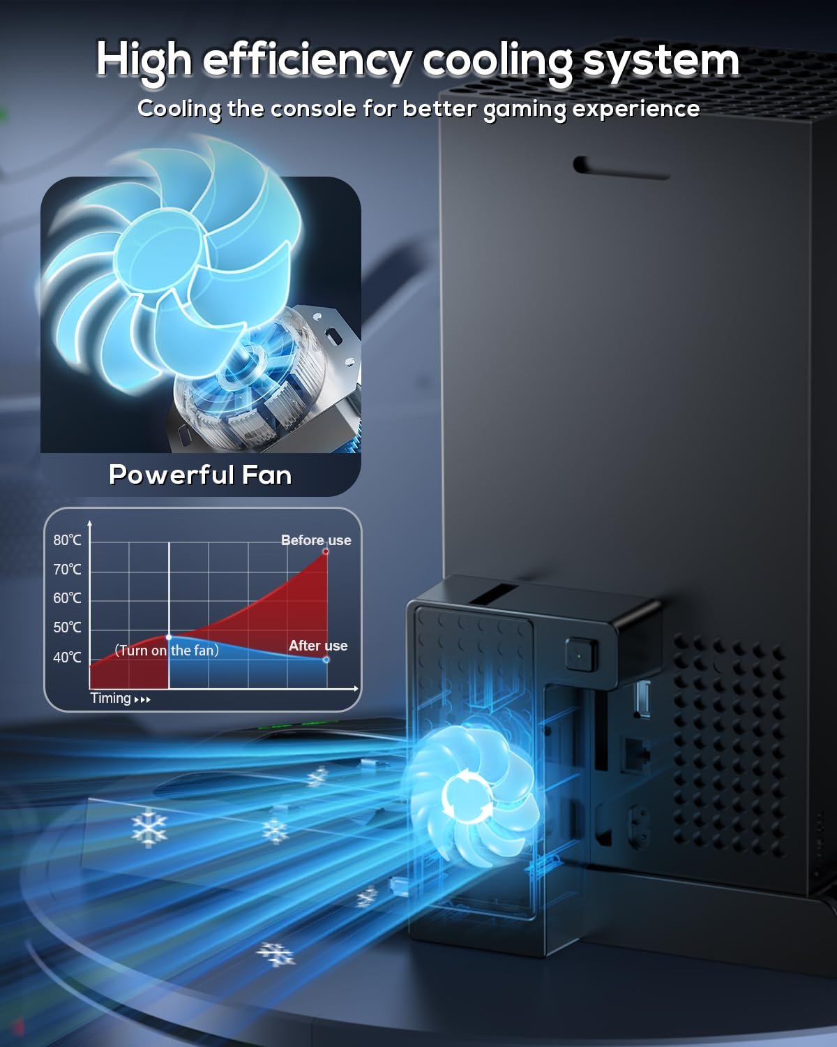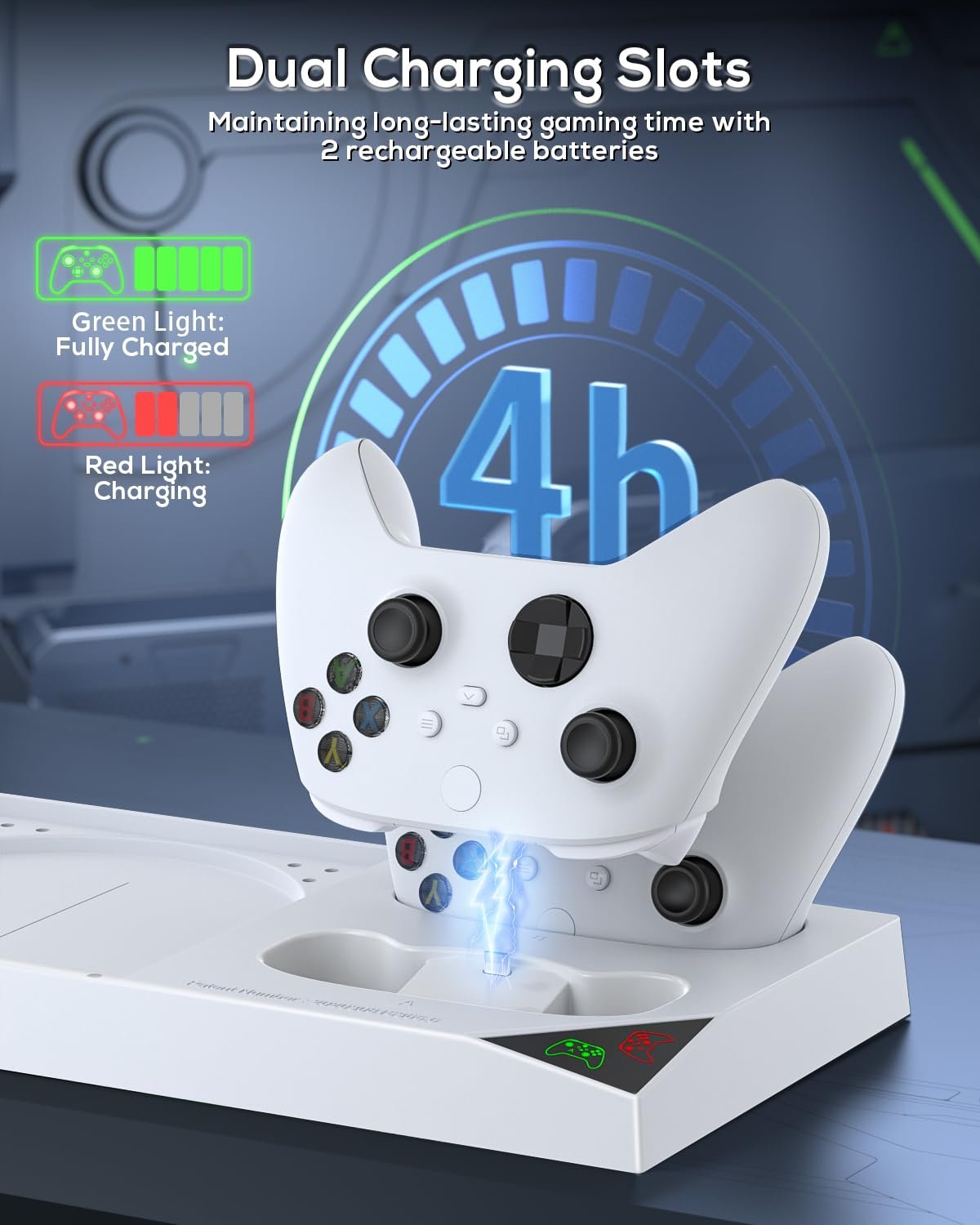 Diseño 5 en 1 para Xbox X: Soporte de ventilador de refrigeración para consola Xbox Series X, potente ventilador de refrigeración integrado, cargador de controlador dual, 2 baterías recargables de 1400 mAh, soporte para auriculares, almacenamiento de 10 discos de juego. lo que ahorra mucho espacio para equipos de juego para Xbox Series X Case. (Nota: El puerto USB extendido no admite la transmisión de datos. El soporte no funciona para Xbox One). El cargador dejará de funcionar cuando la consola está apagada, pero el modo de suspensión puede cargarse.