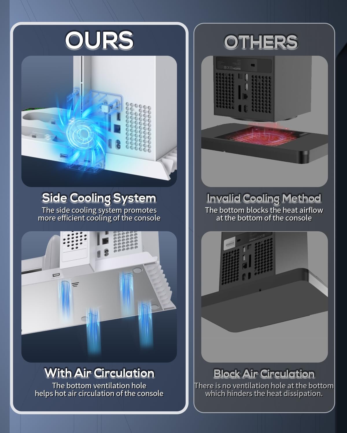 Sistema de enfriamiento para consola: A diferencia del diseño del ventilador en la parte inferior, el ventilador en el lateral puede acelerar la circulación de aire dentro del sistema de consola para enfriarlo mejor. El botón puede controlar el funcionamiento del ventilador en cualquier momento. La base de metal también puede enfriarse eficazmente para la consola Xbox Series X, lo que mejora la vida útil operativa. El diseño inferior de goma antideslizante mantendrá el soporte vertical firmemente y estable.