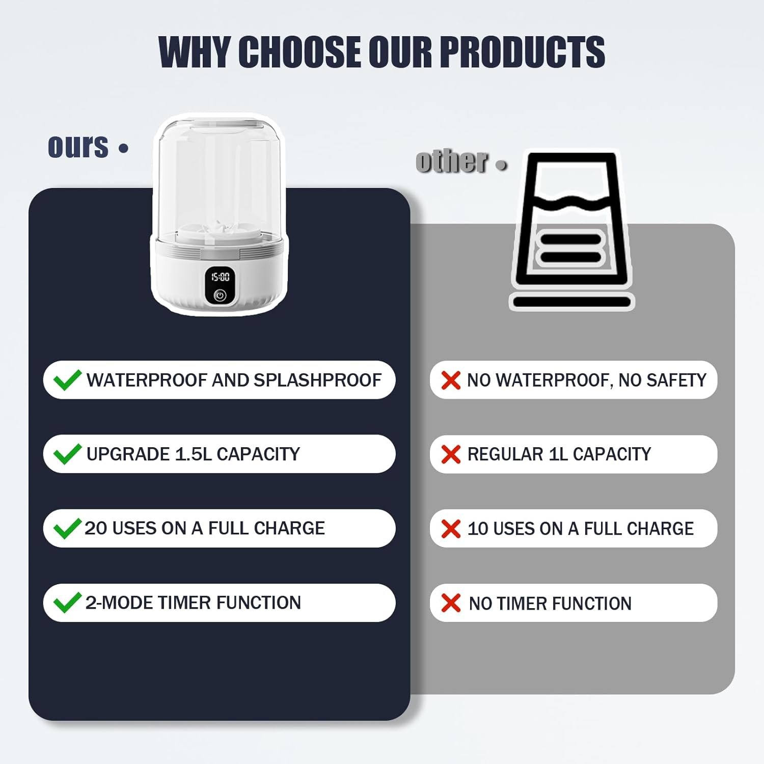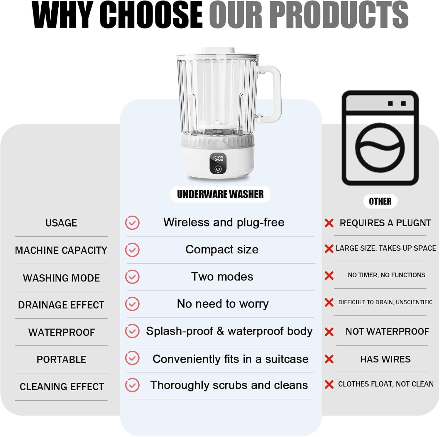 Diseño 2 en 1: Simplemente reemplaza la funda de silicona para limpiar ropa pequeña y pinceles de maquillaje. Compacto y portátil: No ocupa mucho espacio, se puede llevar en dormitorios, hoteles, caravanas y viajes. Capacidad de 1.6 litros: Nuestra mini capacidad de lavado de ropa interior se ha mejorado para lavar más ropa pequeña. Larga duración de la batería: Recién equipado con una batería de 4000 mAh, lo que te da más tranquilidad cuando viajas. Cuerpo desmontable: el recipiente se puede desmontar para una fácil limpieza y lavado, más cómodo de llevar. 3 modos de limpieza: Equipado con 2000r/m de alta velocidad giratorio, limpieza de 3 temporizadores para satisfacer tus necesidades de lavandería.