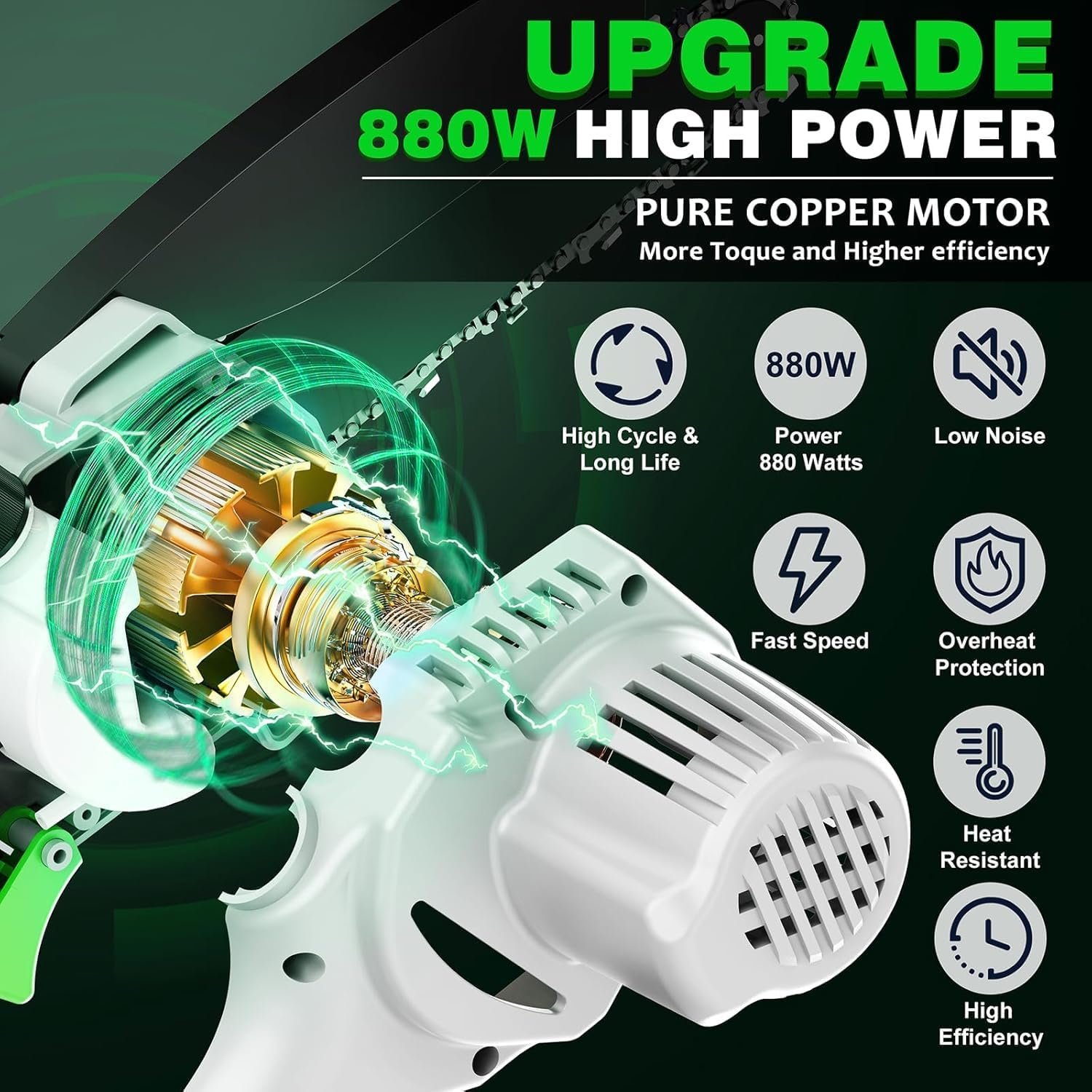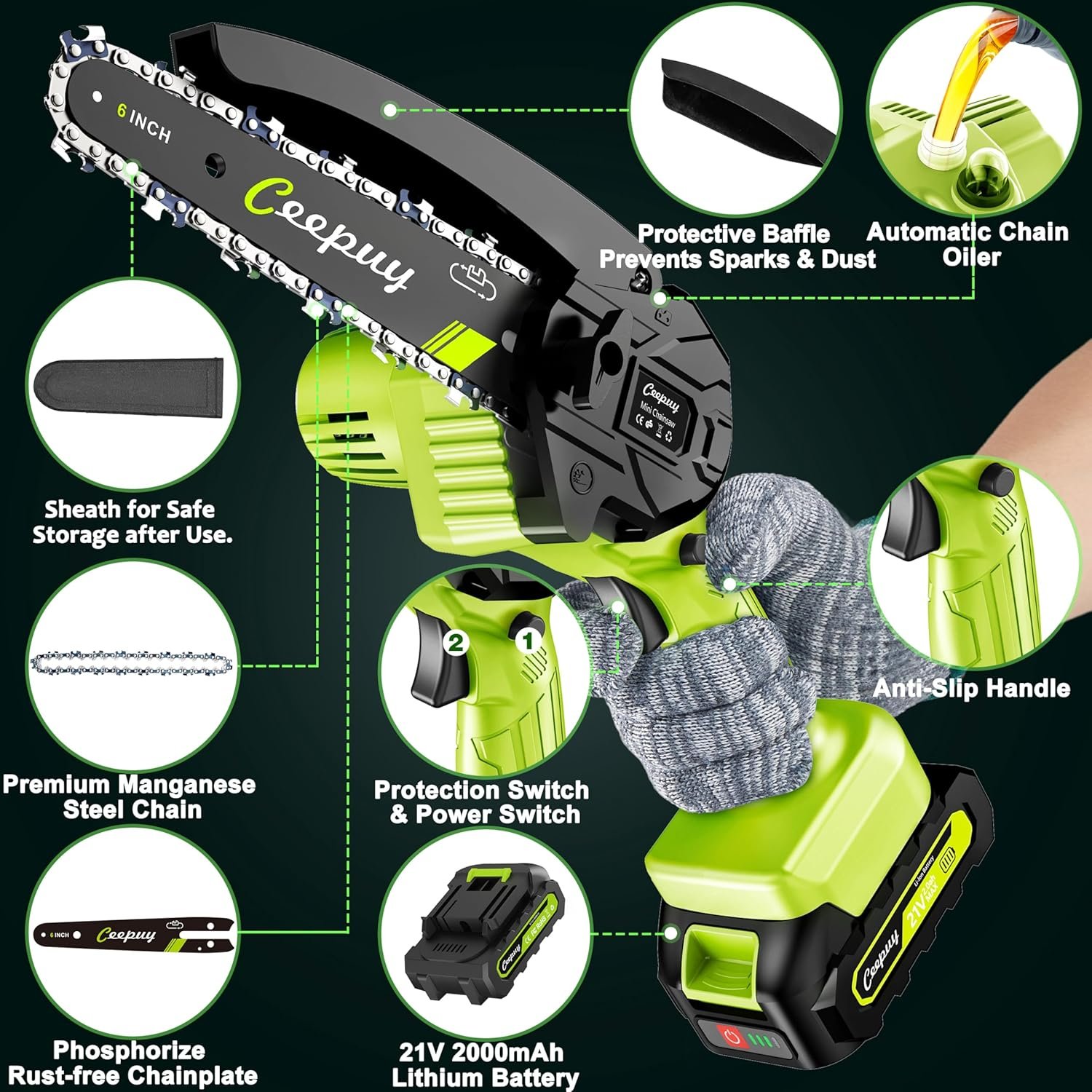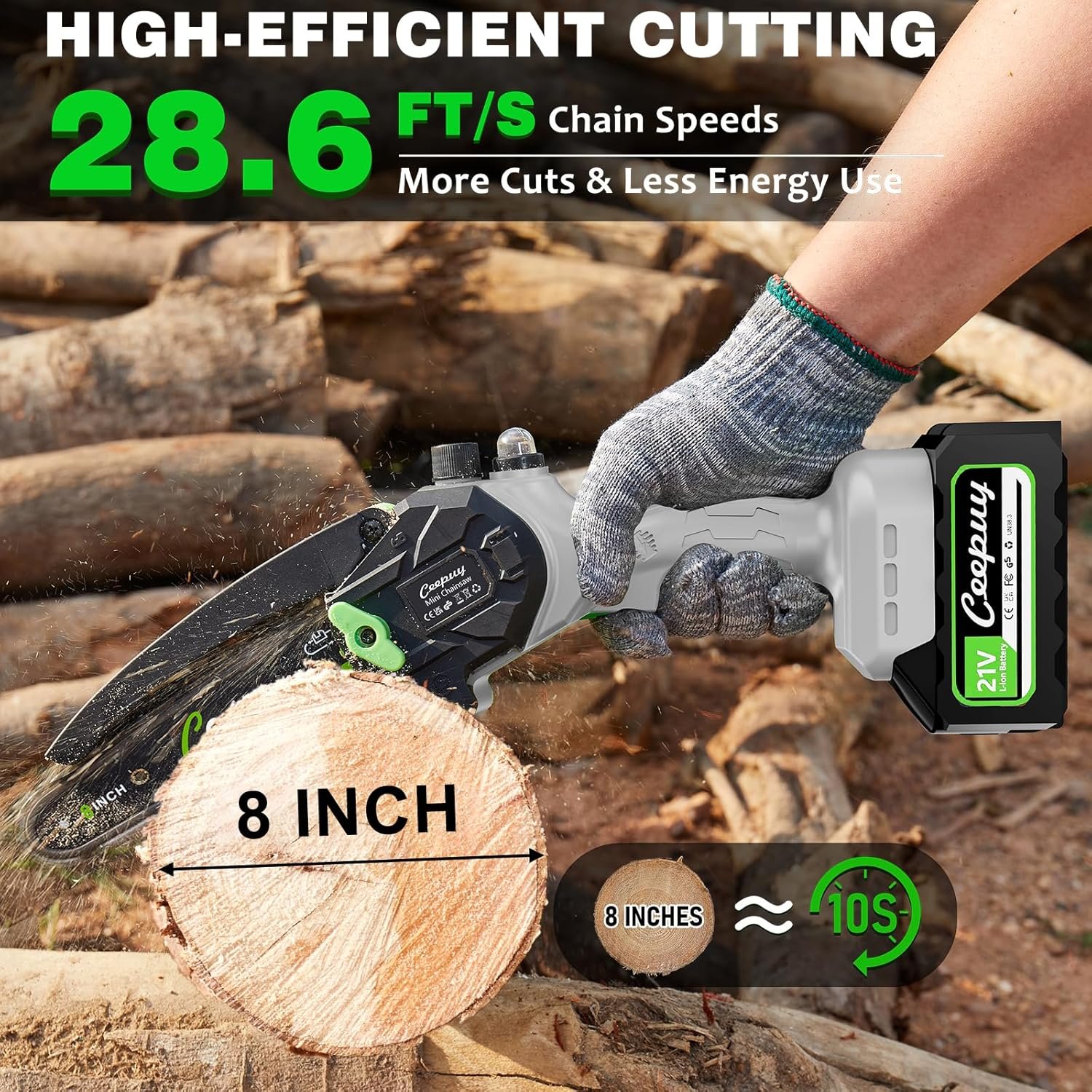 • 【Super motor mejorado de cobre puro de alta eficiencia】La mini motosierra inalámbrica Ceepuy de 6 pulgadas cuenta con un motor de alta potencia de 880 vatios. La alta velocidad de 28.6 pies/s puede cortar eficientemente un tronco de 6 pulgadas de diámetro en solo 8 segundos, reduciendo significativamente el tiempo de corte. Ideal tanto para el hogar como para el trabajo, tala sin esfuerzo árboles comunes o troncos grandes con facilidad y eficiencia.