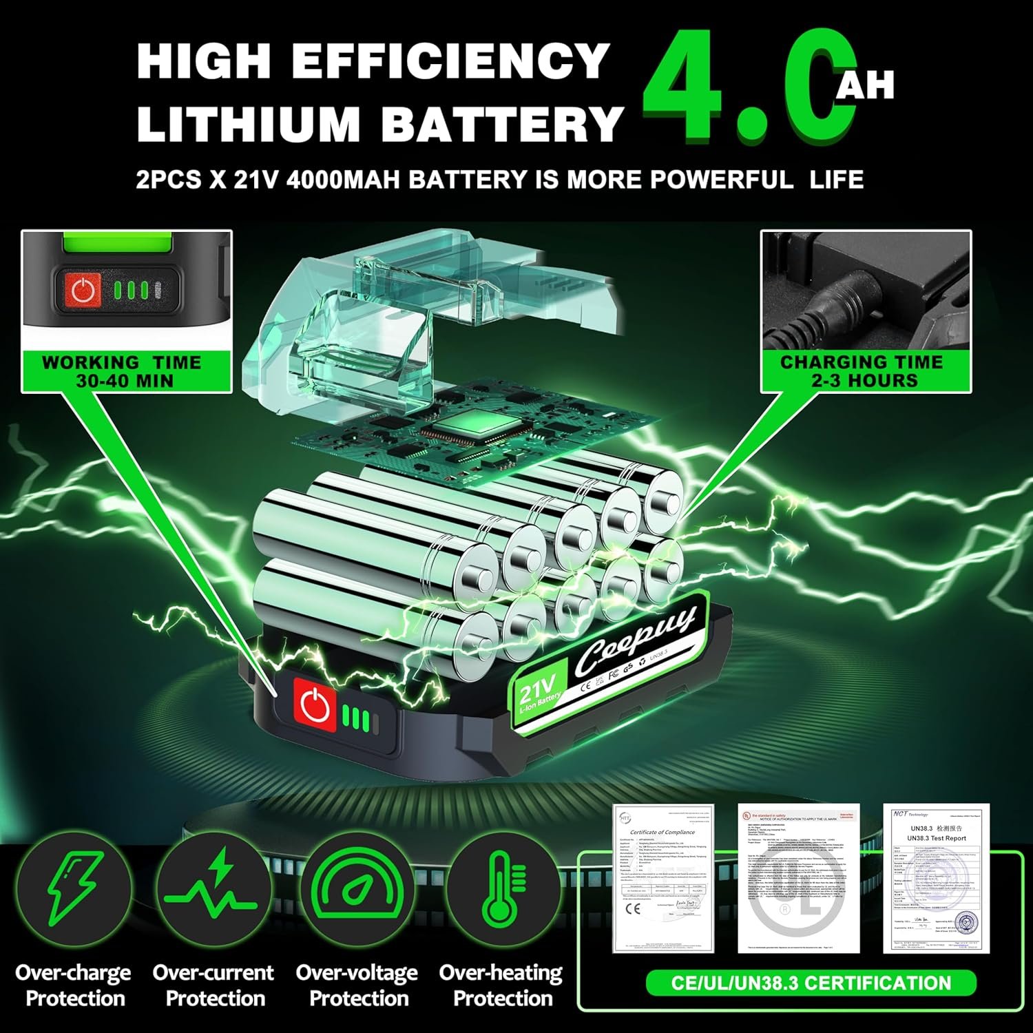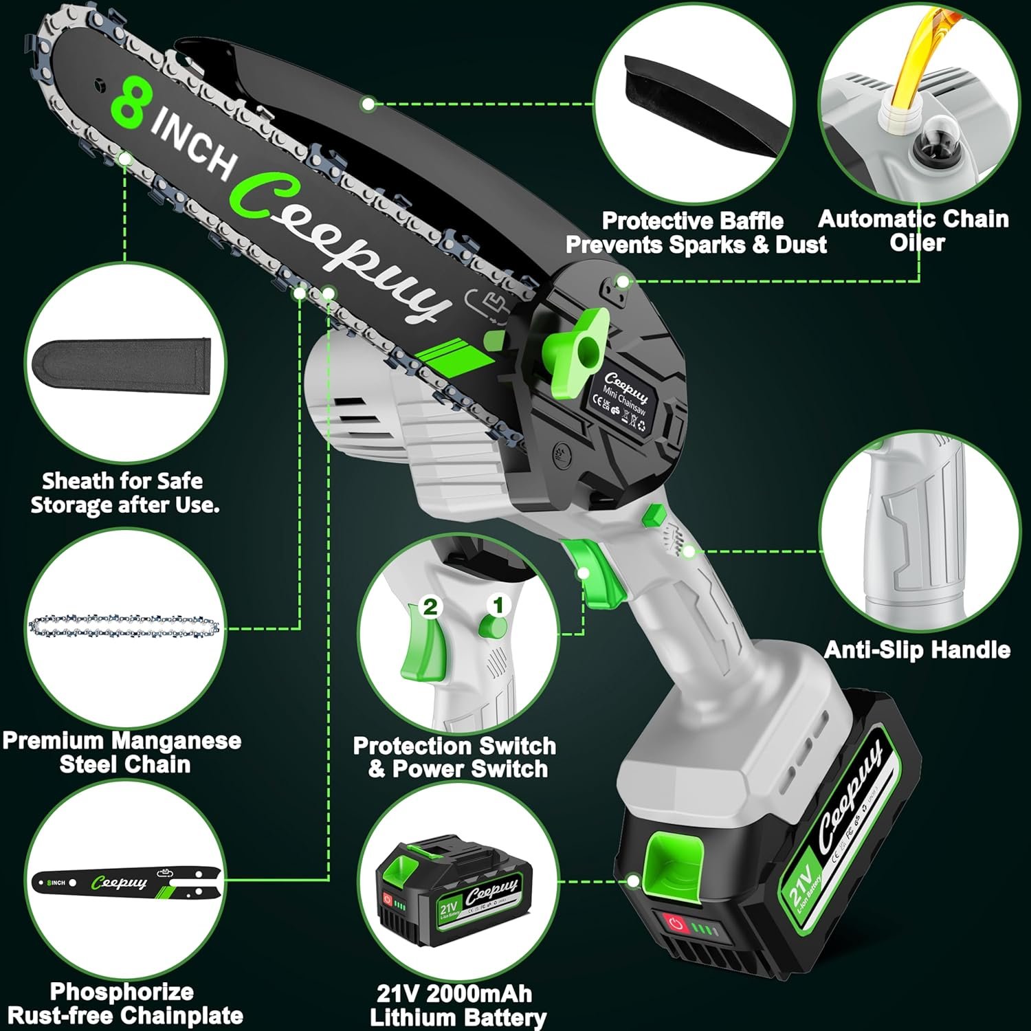 • 【Batería recargable de gran capacidad y larga duración】La mini motosierra eléctrica Ceepuy está equipada con 2 baterías de litio de alta energía de 21 V 2000 mAh que son extraíbles y recargables. Una carga rápida de 1.5 horas proporciona hasta 30-40 minutos de uso continuo, capaz de 120-150 cortes en bloques de madera de 4×4 pulgadas o 100-120 cortes en bloques de 6×6 pulgadas. La protección contra sobrecarga de la batería y el sistema de control de temperatura están diseñados para maximizar la vida útil. Se pueden cargar y trabajar de manera eficiente en cualquier momento, ofreciendo comodidad y velocidad.