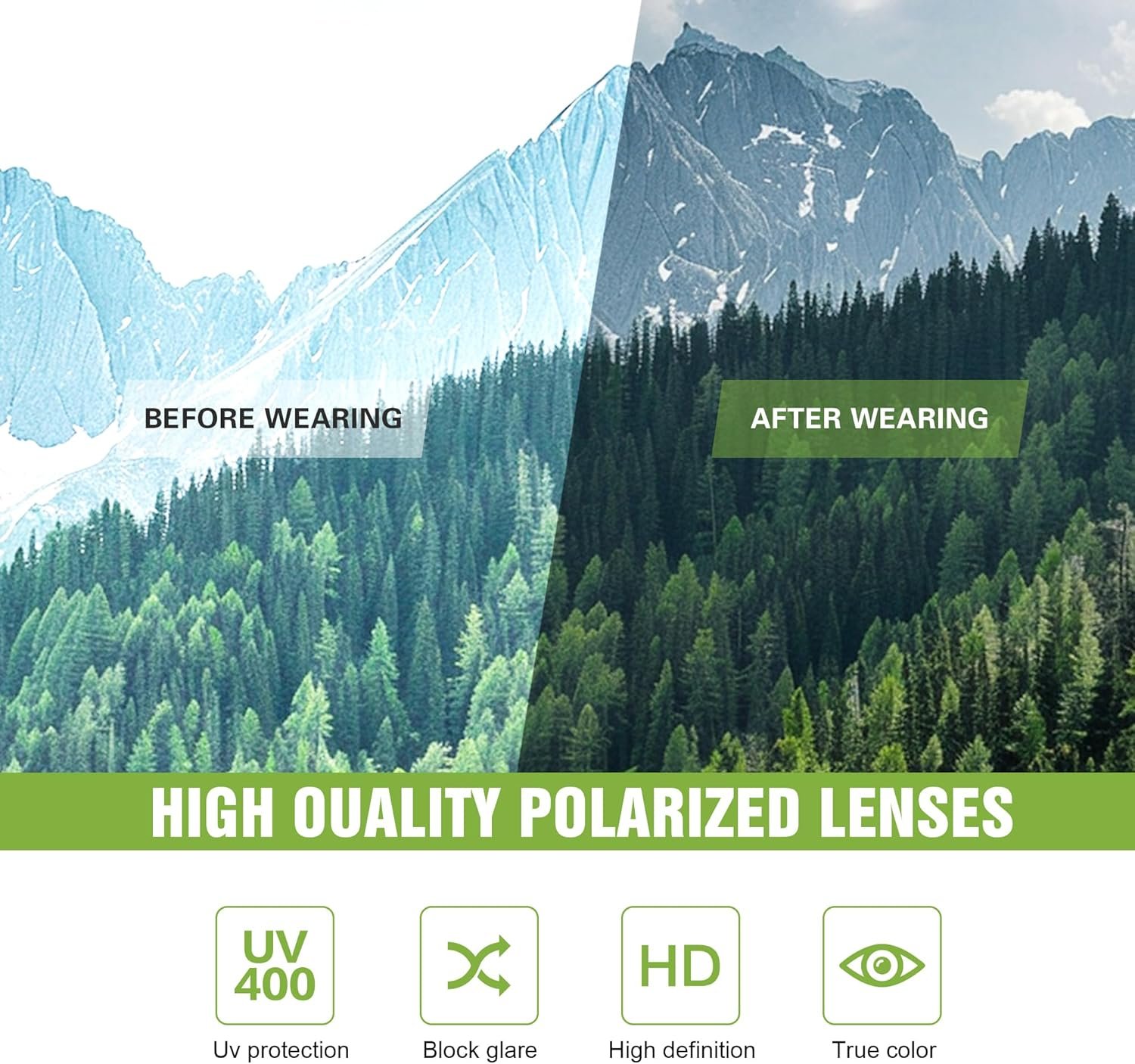 - Protección ultravioleta y visión clara: utilizando la tecnología avanzada de lentes UV400, estos lentes de sol polarizados para hombre bloquean eficazmente más del 99.9% de los rayos ultravioleta nocivos, proporcionando una protección completa para tus ojos. Los lentes de sol polarizados HD para hombre reducen el deslumbramiento y los reflejos, ofreciendo una experiencia visual clara para cualquier actividad al aire libre, ya sea pesca o correr.