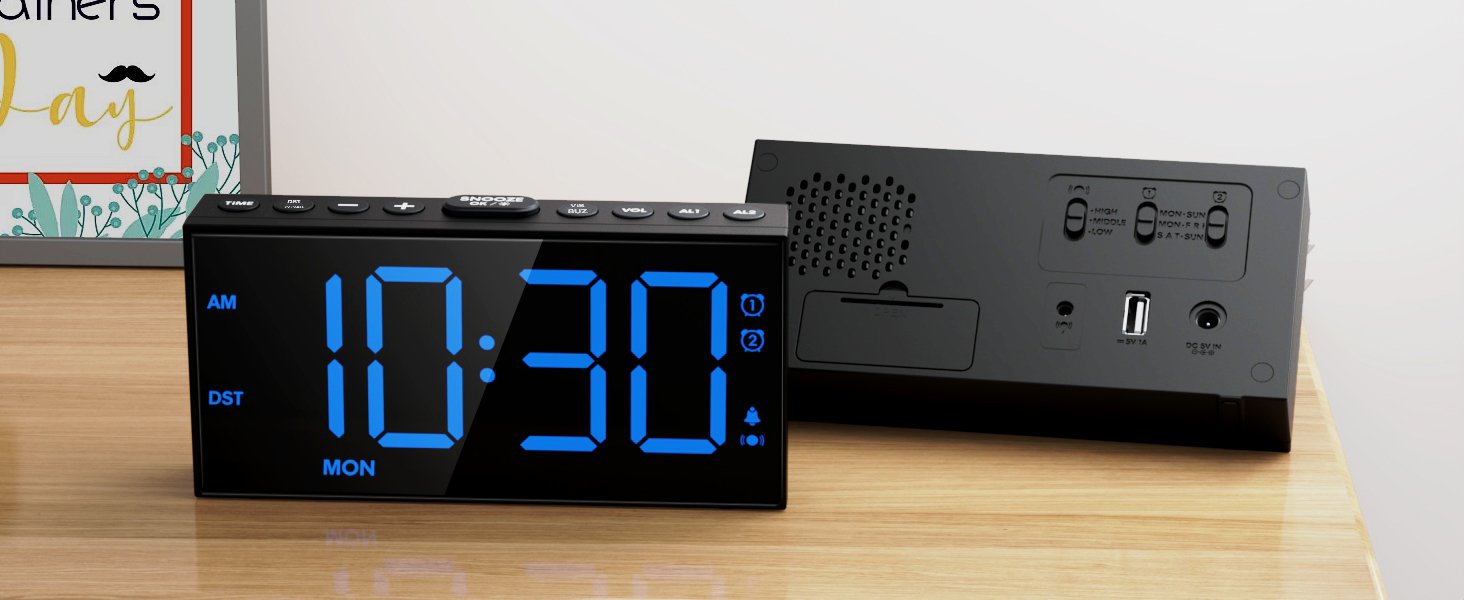 Big SNOOZE button, clearly visible to stop the alarm; Big bold numbers, easy to see the time clearly from any corner of the room.