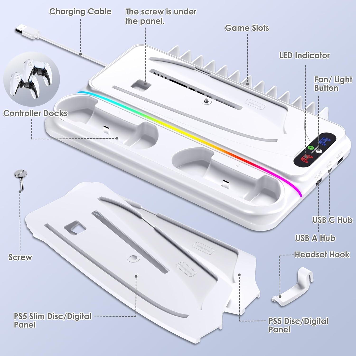 - Lo que obtendrás: 1 soporte de refrigeración para PS5, 1 disco delgado PS5/panel de consola digital/Pro, 1 disco PS5/panel de consola digital, 1 soporte para auriculares, 1 tornillo, 1 manual de usuario (idioma español no garantizado). Utiliza nuestro cable USB A integrado para cargar este soporte ps5 pro a través de la consola o utiliza tu cable para cargar con nuestro puerto concentrador USB C. Hay dos puertos USB A adicionales disponibles para alimentar otros dispositivos. Para cualquier pregunta, por favor hágamelo saber.