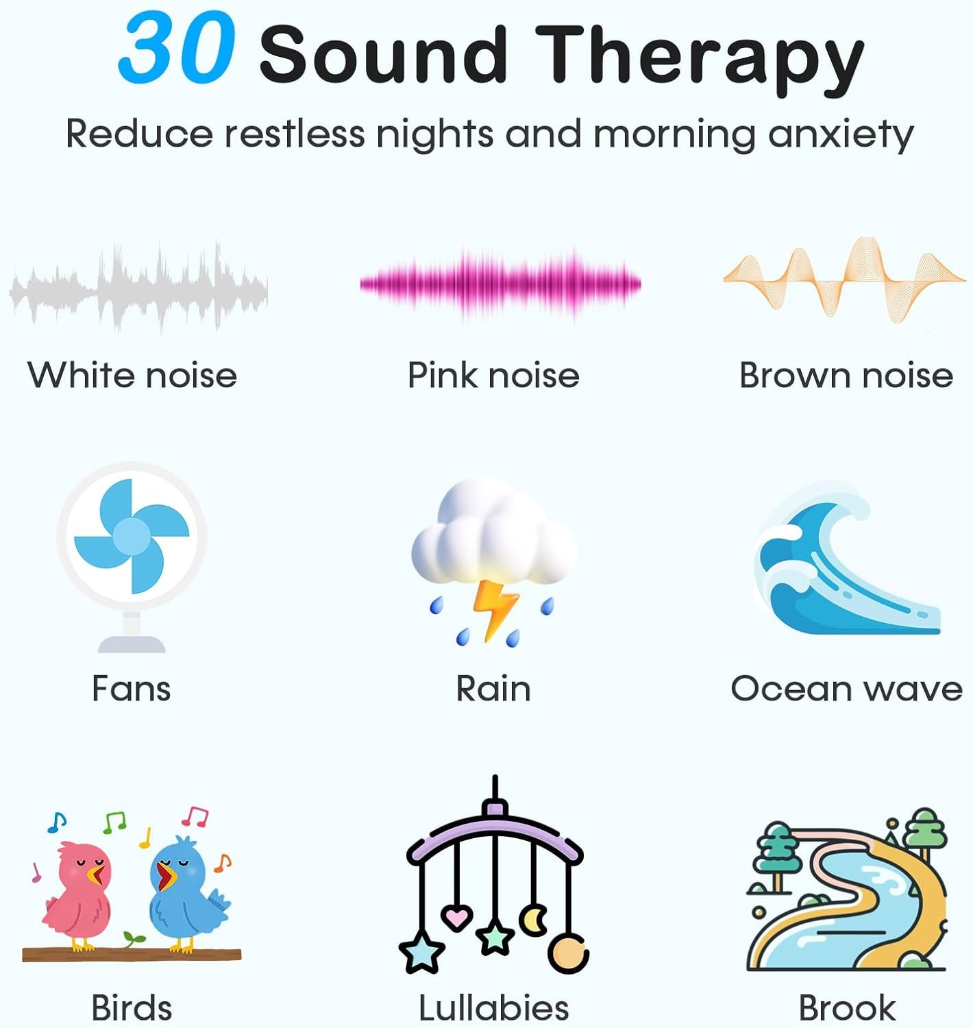 - 30 sonidos relajantes para dormir y concentrarse: elige entre 30 sonidos relajantes, como canto de pájaros, océano y ruido blanco, para apoyar el sueño, la meditación o el enfoque matutino. Ideal para adultos, niños y personas que duermen ligeramente.
